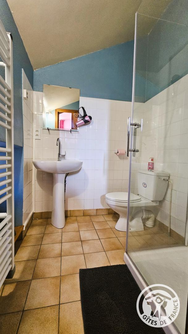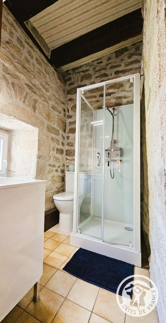 Quelques marches mènent à une salle d'eau avec douche et des WC communs, suivie d'une seconde chambre avec un lit de 140 cm, toutes deux entre les niveaux.