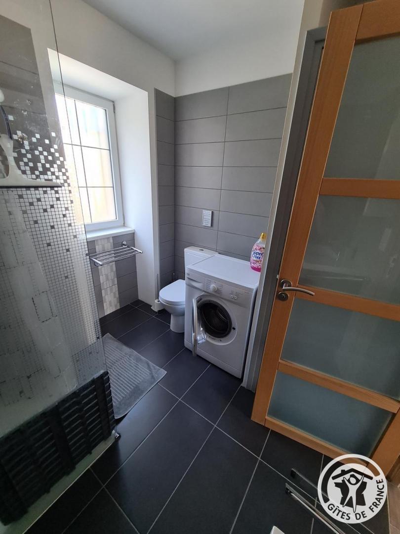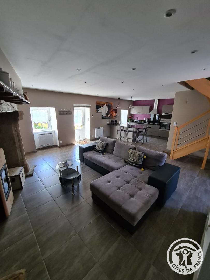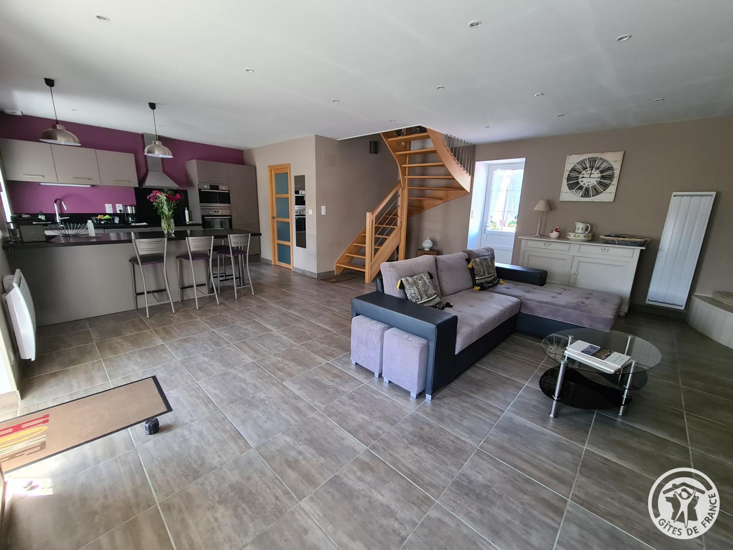 Au rez-de-chaussée, le gîte dispose d'une grande pièce à vivre avec salon et cuisine équipée (four, micro-ondes, cafetière à filtres et cafetière à dosette NESPRESSO). Le salon est équipé d'un poêle à granulés (mis à disposition gratuitement). Sur le même niveau, salle d'eau (douche avec WC).