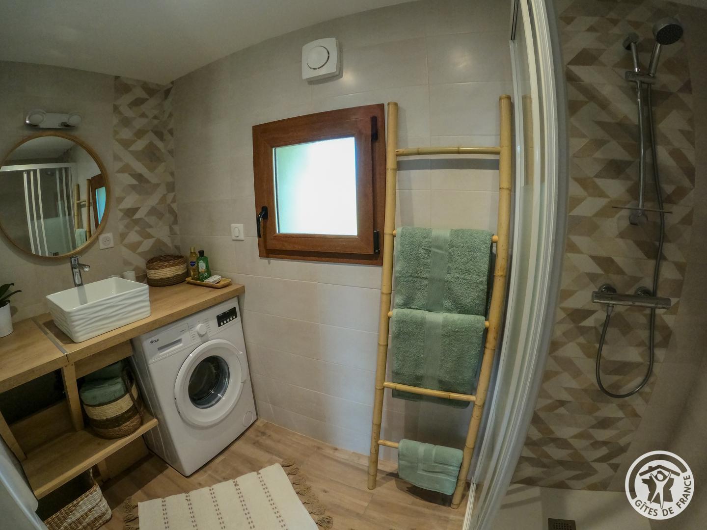 La salle de bain moderne est équipée d'une douche à l'italienne et d'un lave-linge.
