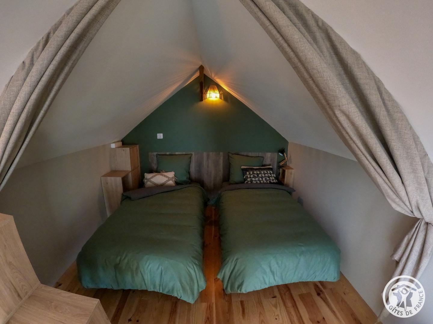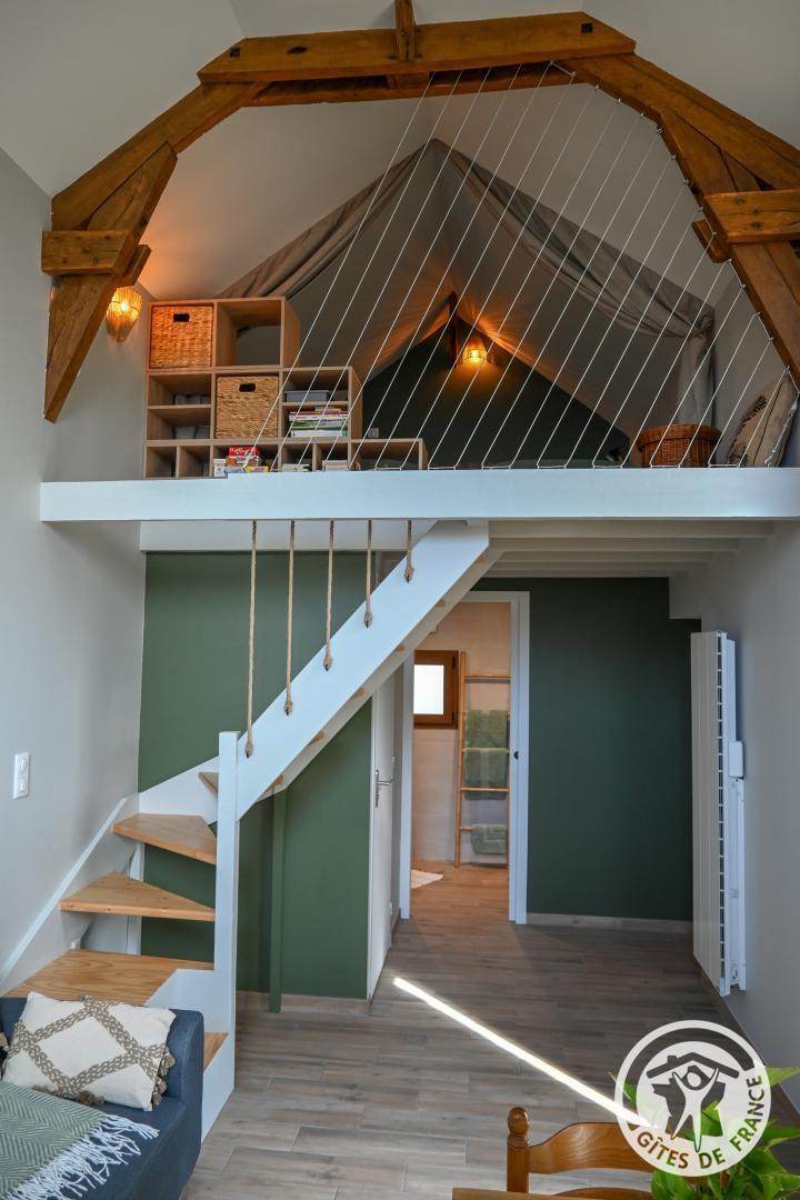 Le gîte comprend également 2 chambres confortables, une avec un lit de 160*200 donnant directement sur la terrasse arrière et une autre en mezzanine ouverte sur le séjour avec 2 lits de 90*190.