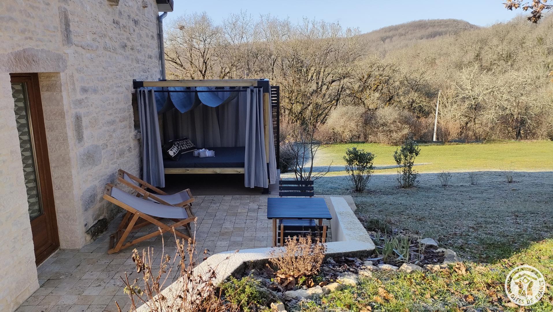 Vous pourrez pleinement profiter de l'extérieur, avec ses 2 terrasses, son lit à baldaquin et son coin hamac.