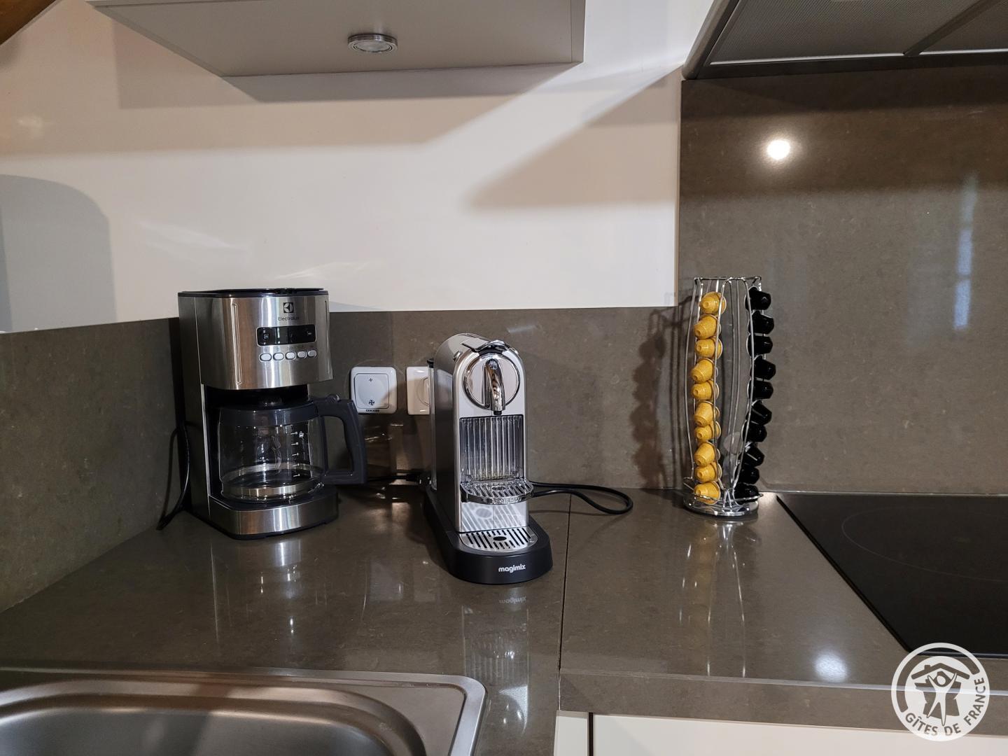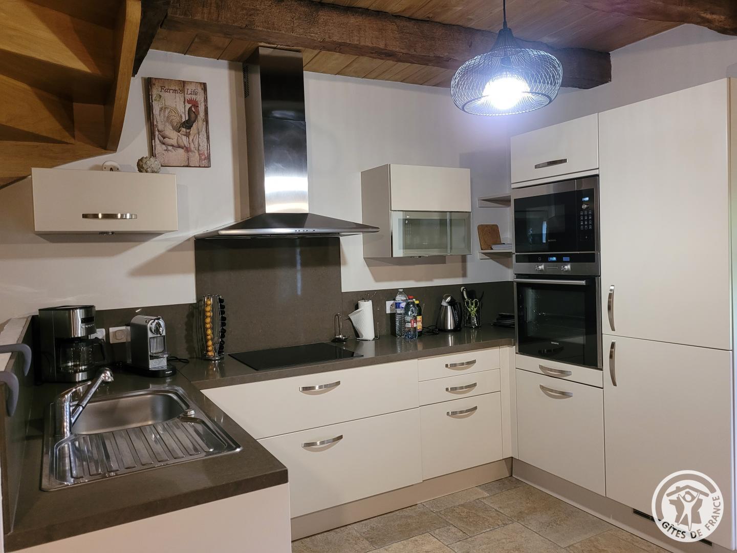 RDC : 1 salle à manger avec cuisine aménagée et équipée, un coin buanderie. Accès au salon par une marche descendante avec poêle à bois, tv écran plat et lecteur cd.