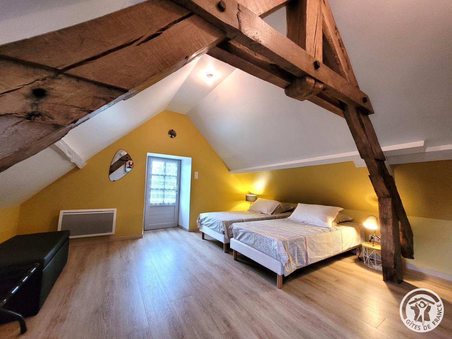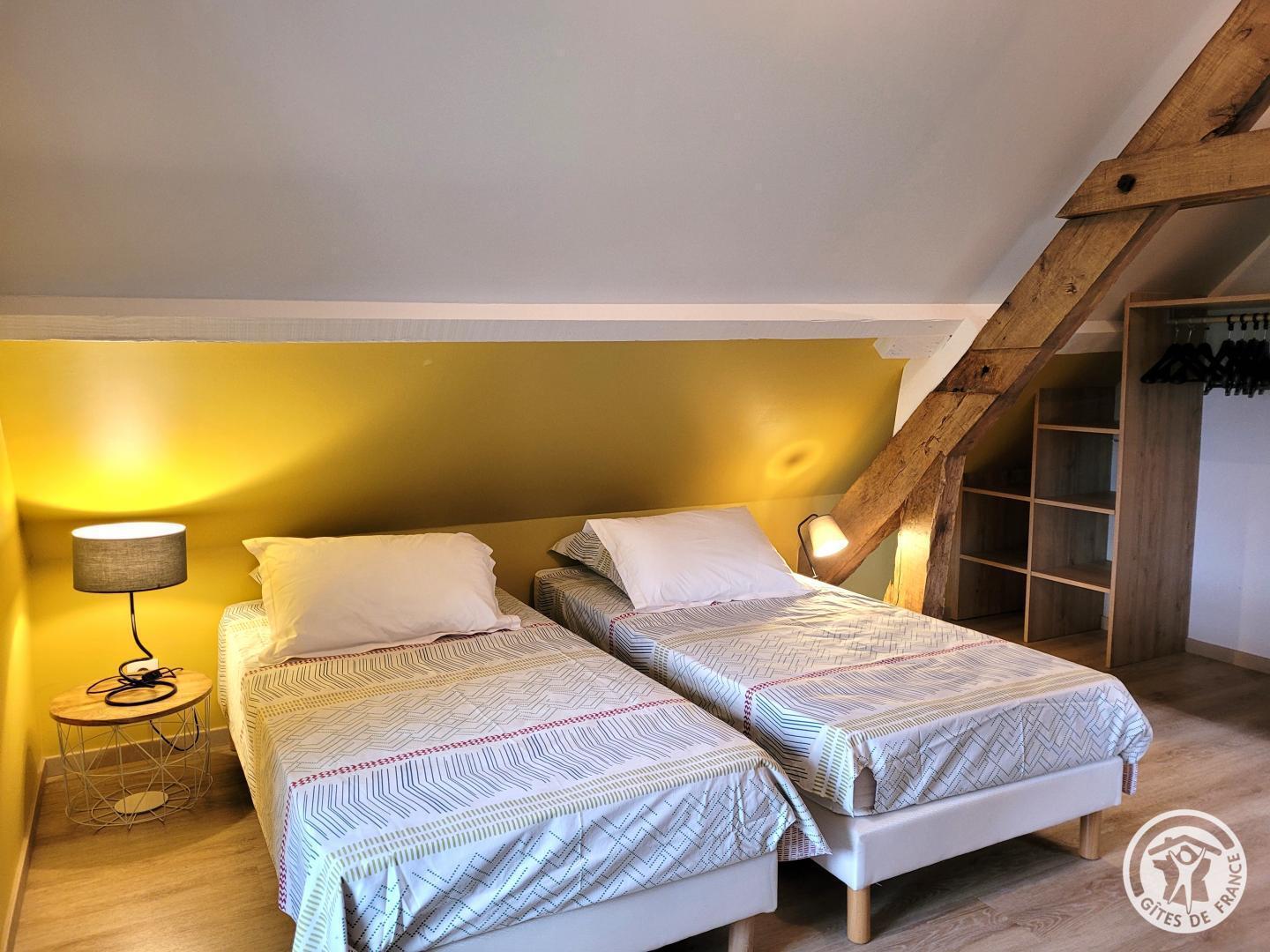 Depuis le salon du RDC, accès à la chambre "Rêve d'été", 2 lits simples 90x200, qui bénéficie aussi d'un escalier extérieur avec petit perron