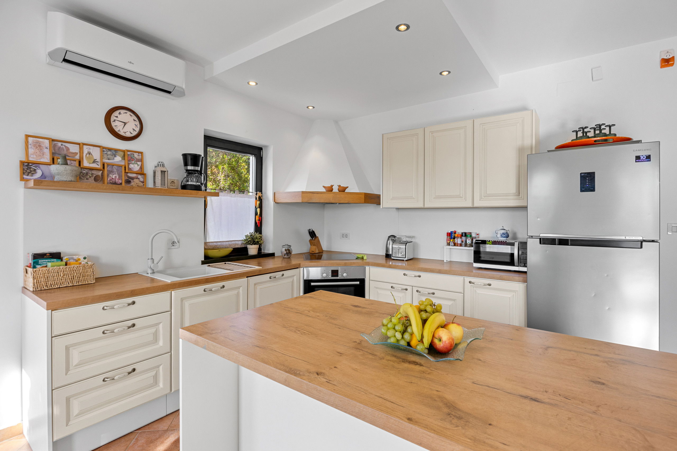 La cuisine américaine, Électrique, est équipée avec réfrigérateur, four, congélateur, lave-vaisselle, vaisselle/couverts, ustensiles/cuisine, cafetière, grille pain et bouilloire.