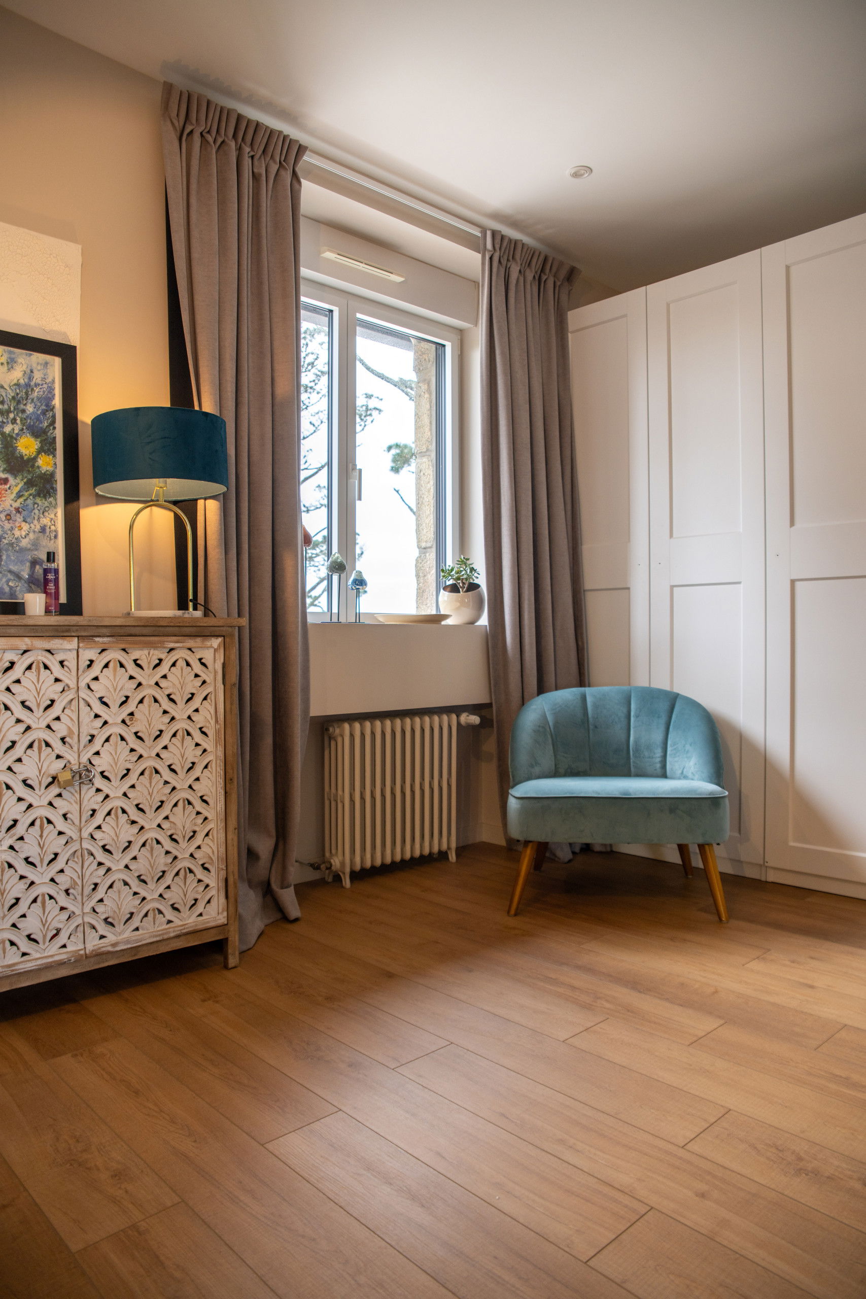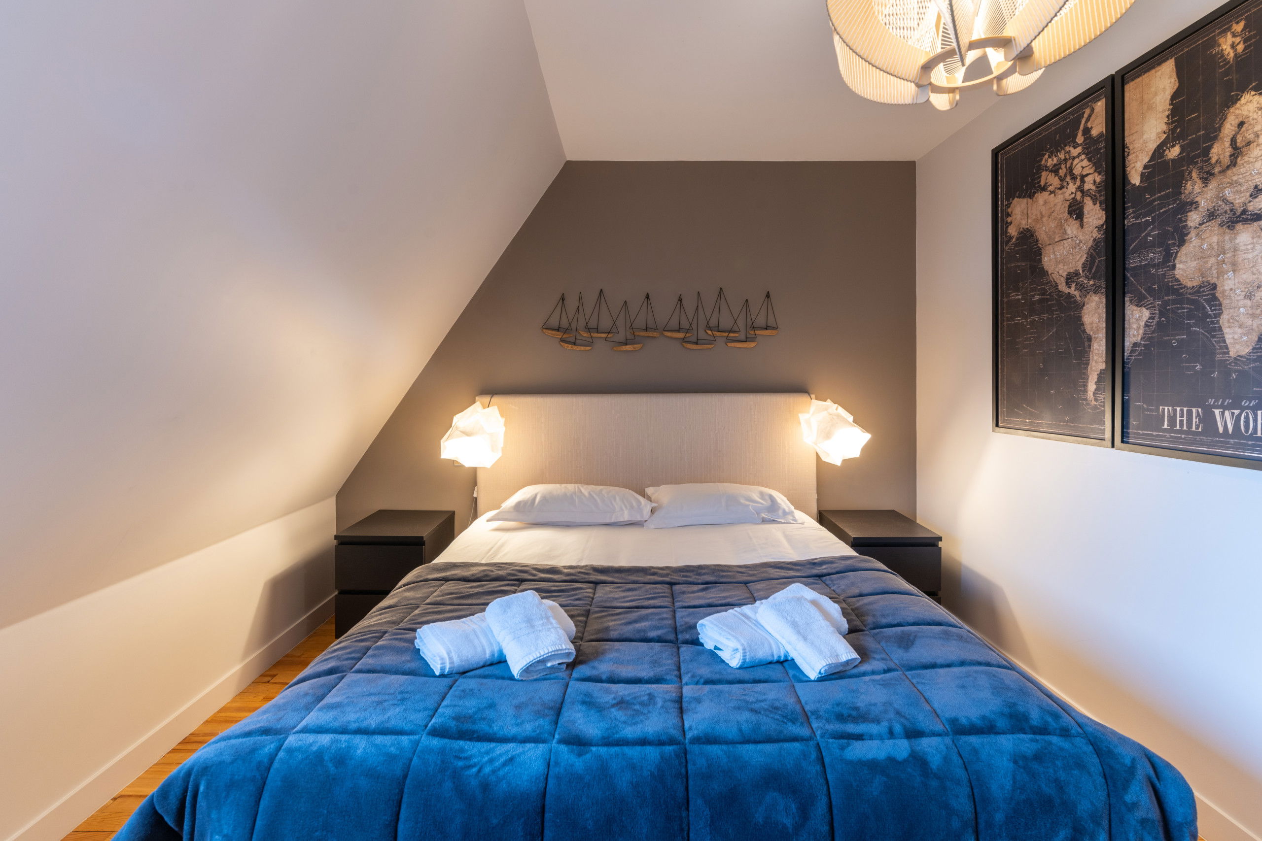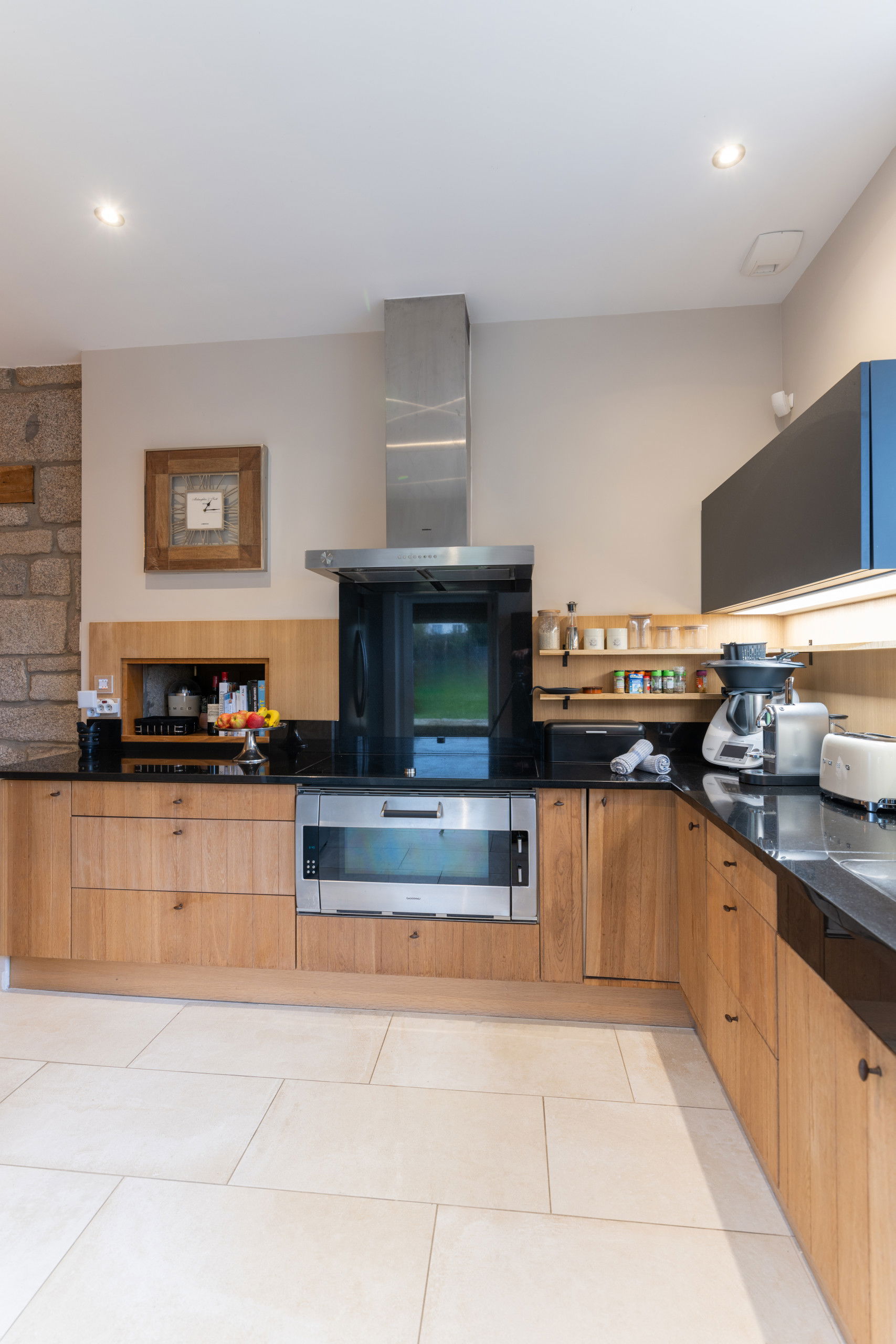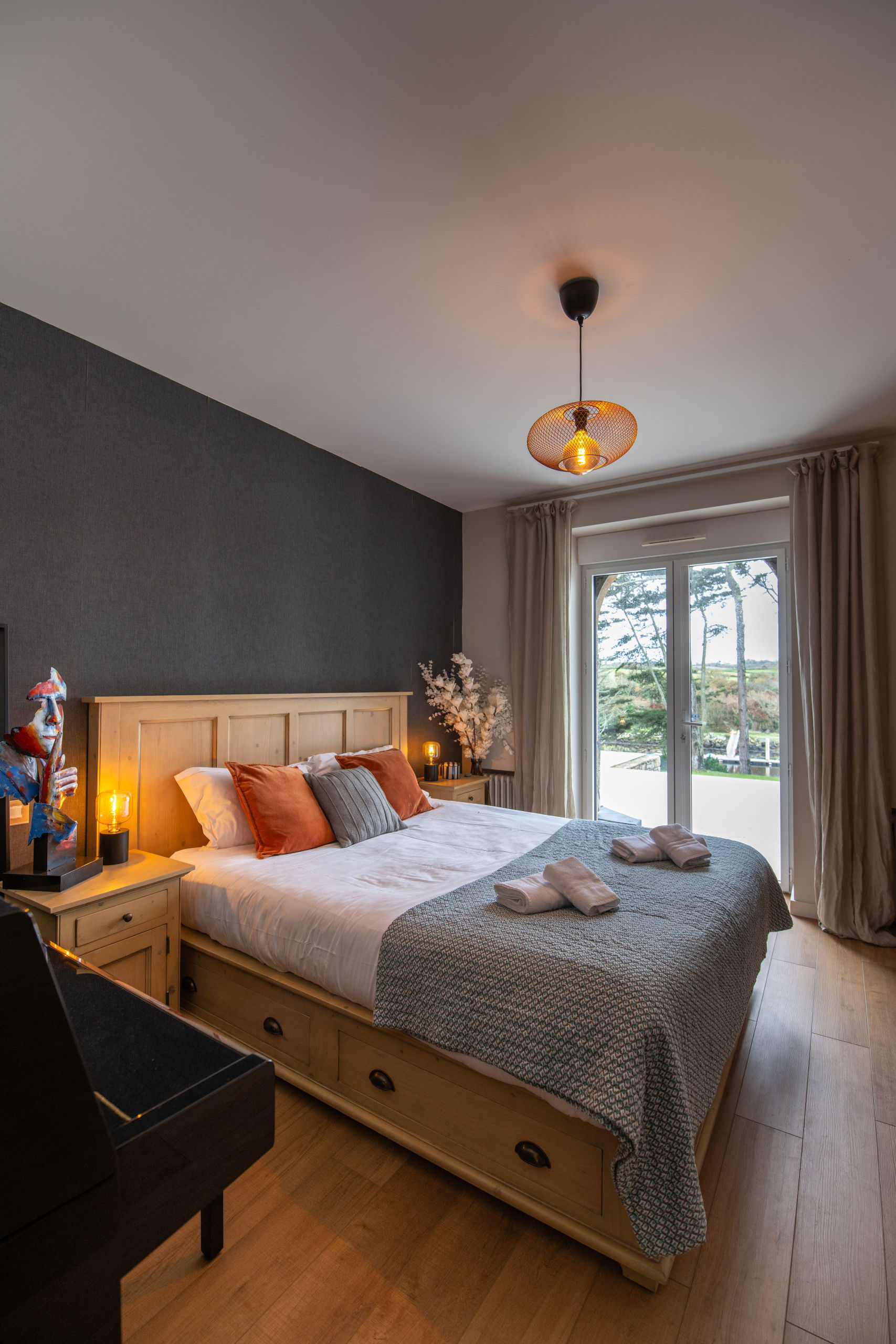 A l'intérieur, vous pourrez profiter d'un vaste salon-séjour qui possède également une belle vue sur l'aber et sur le port de Lanildut. La cuisine séparée est toute équipée, idéale pour cuisiner de bons repas. Vous trouverez également au RDC vous trouverez une belle suite parentale avec son lit queen size en 160x200 et sa salle d'eau ainsi qu'une seconde suite parentale spacieuse et joliment décorée avec son lit king size en 180x200 et sa salle de bain avec baignoire.