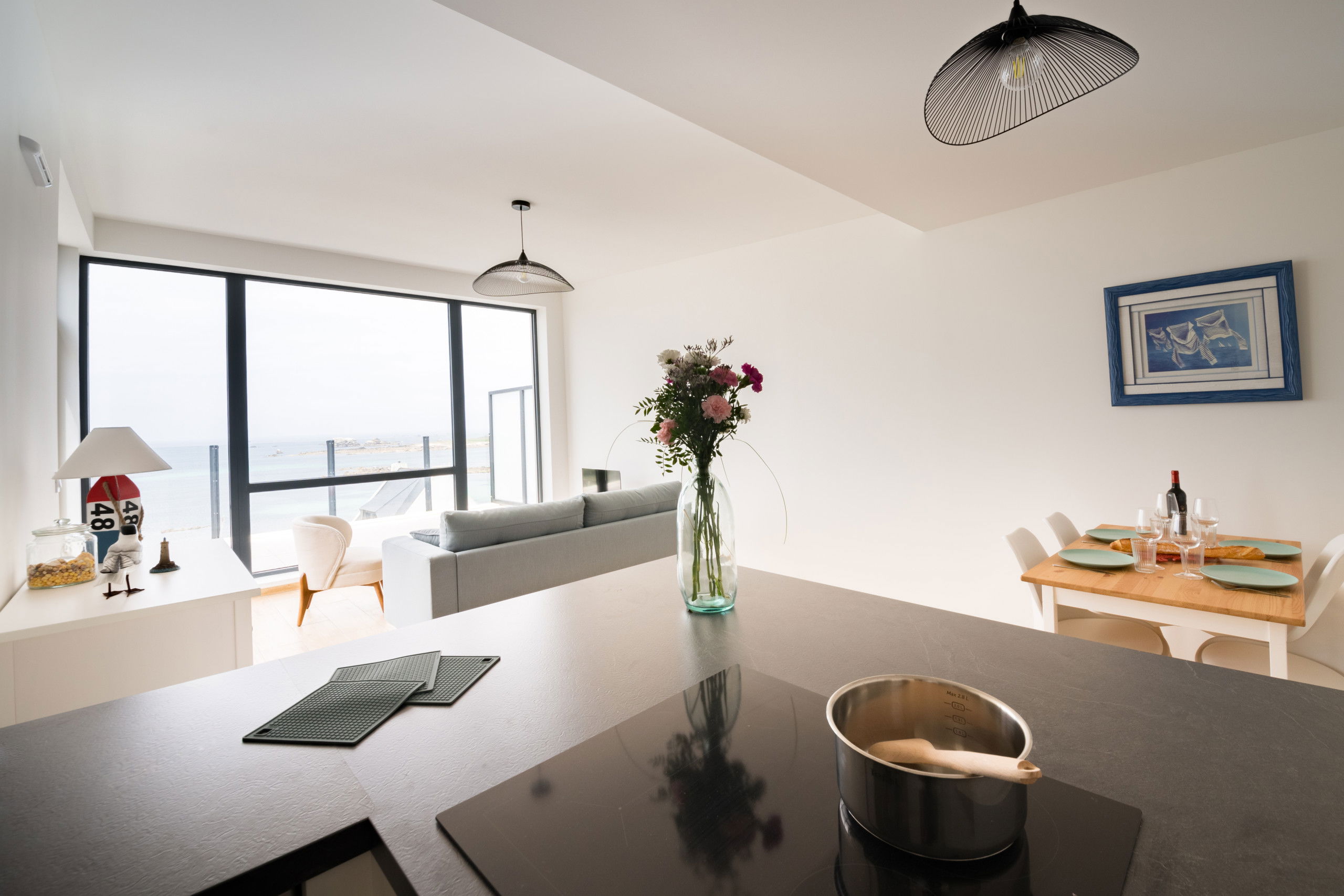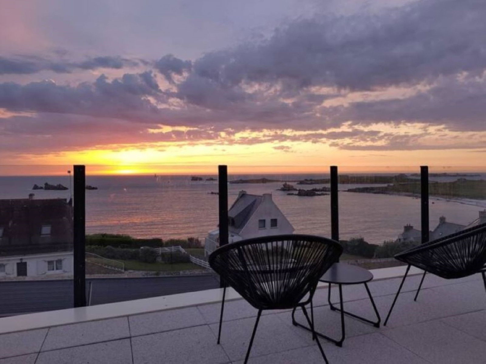 Dès que vous franchissez la porte, vous serez enveloppé par une atmosphère accueillante et lumineuse. En arrivant dans la pièce de vie, vous allez être émerveillé par la splendide vue sur la mer d'Iroise et le phare du Four. Vous découvrirez un espace de vie spacieux et ouvert : la cuisine moderne, entièrement équipée, s'ouvre sur le salon, créant un lieu idéal pour se détendre et se retrouver. Une porte-fenêtre s'ouvre sur une terrasse, où vous pourrez profiter pleinement de l'extérieur et de sa vue mer complètement dégagée.