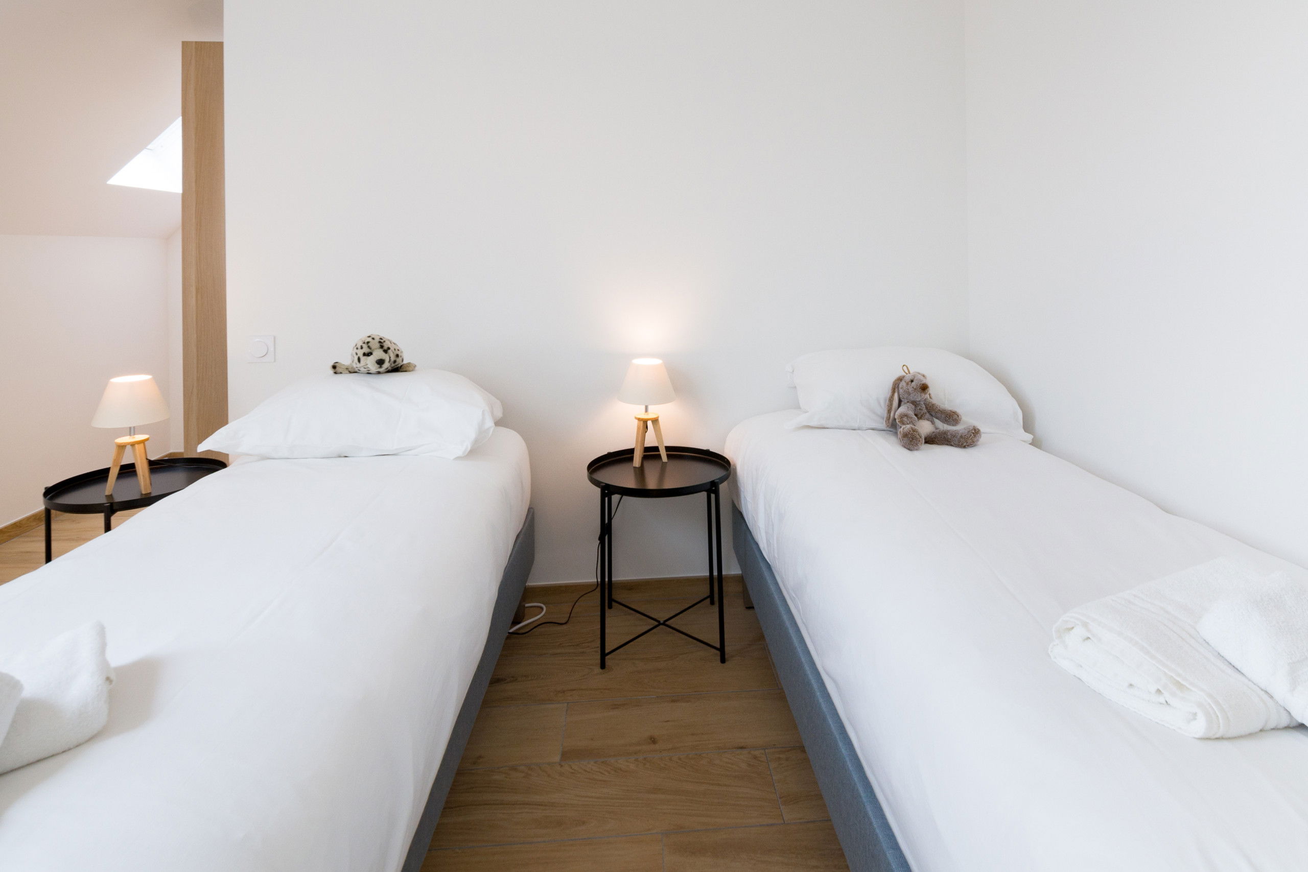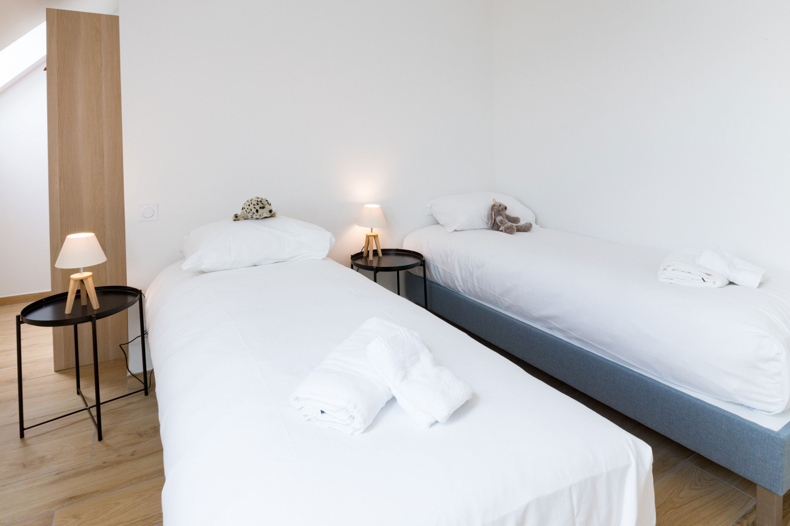L'appartement dispose également de deux chambres soigneusement aménagées, offrant à chacun un espace de repos tranquille. Les 2 chambres sont équipées de 2 lits jumeaux, permettant d'avoir, dans chaque chambre, 2 lits simples en 80x200 ou un lit double en 160x200. Une salle d'eau bien aménagée et des toilettes séparées complètent cet espace pour votre plus grand confort