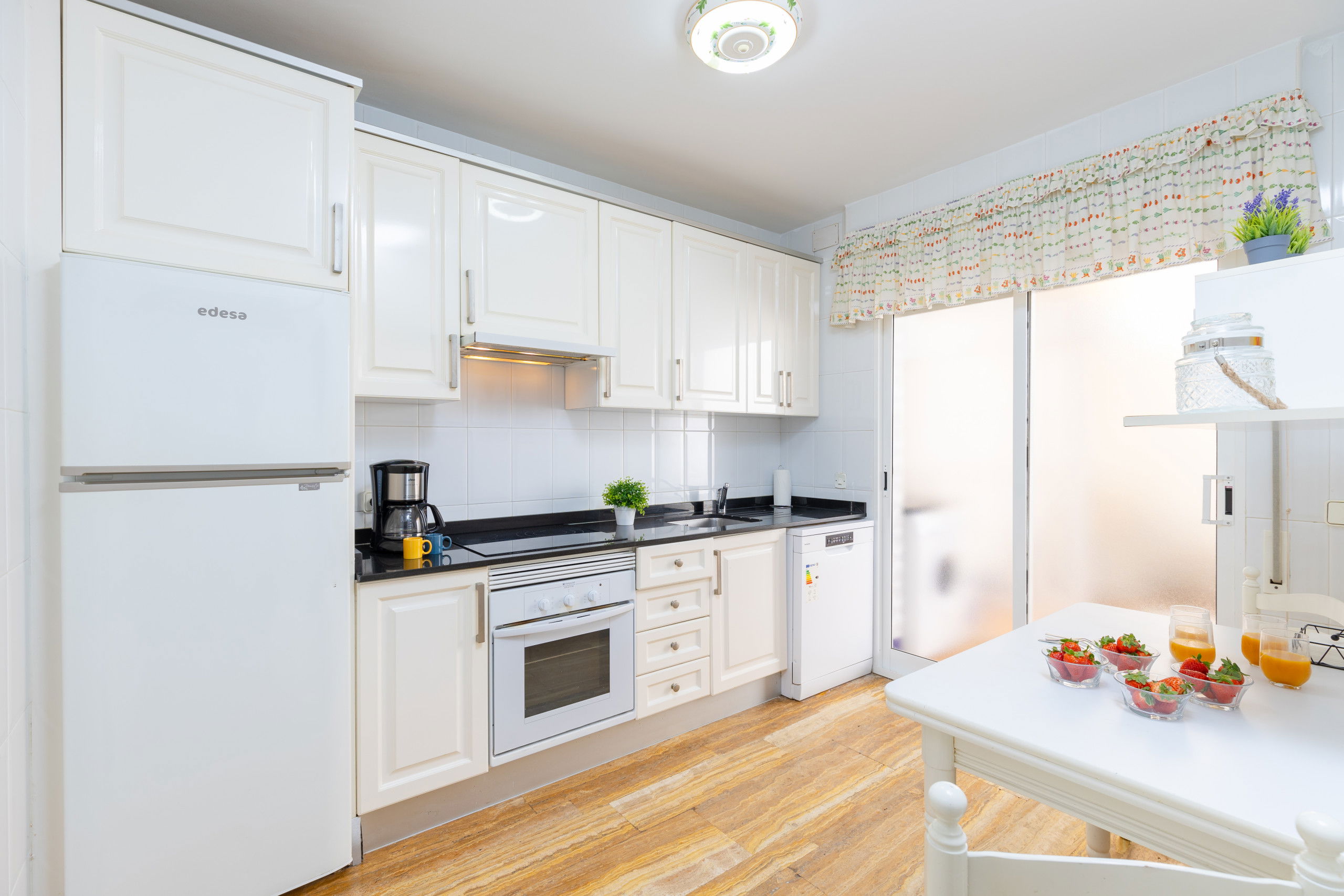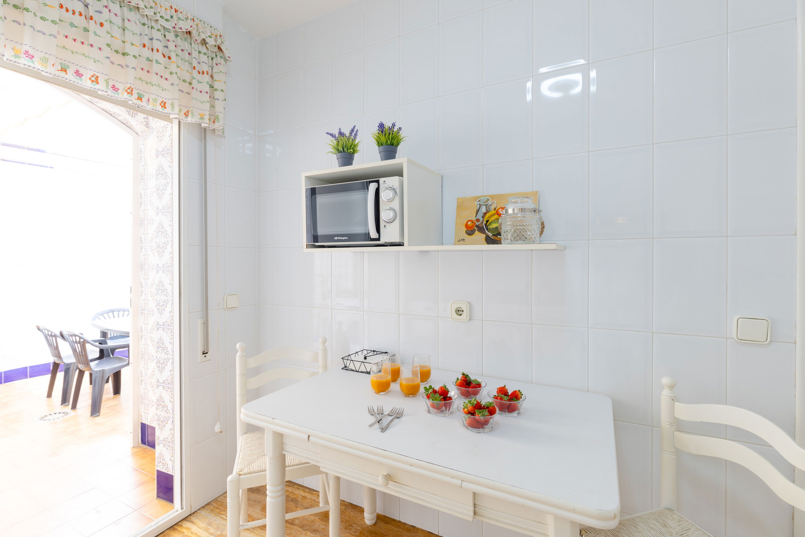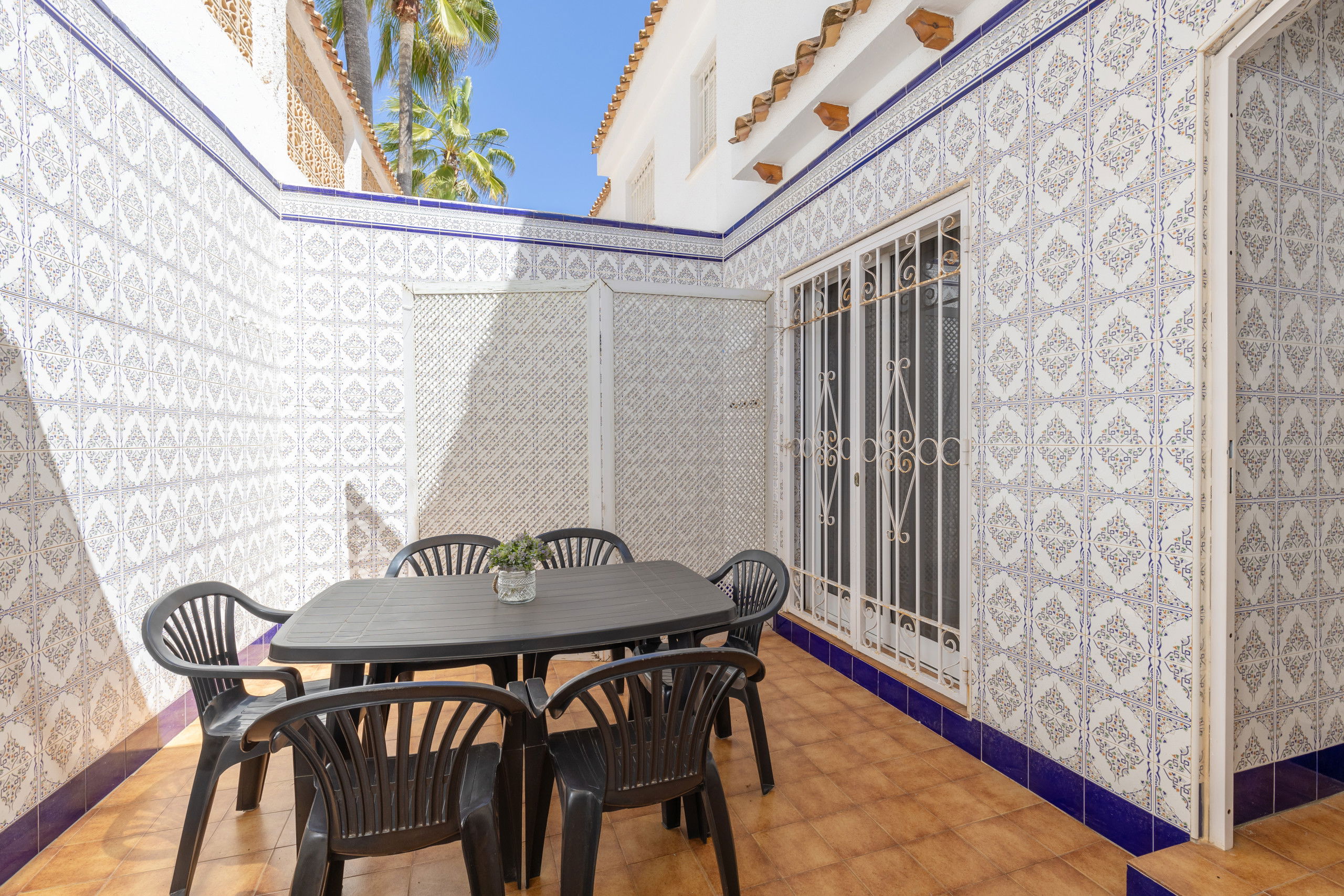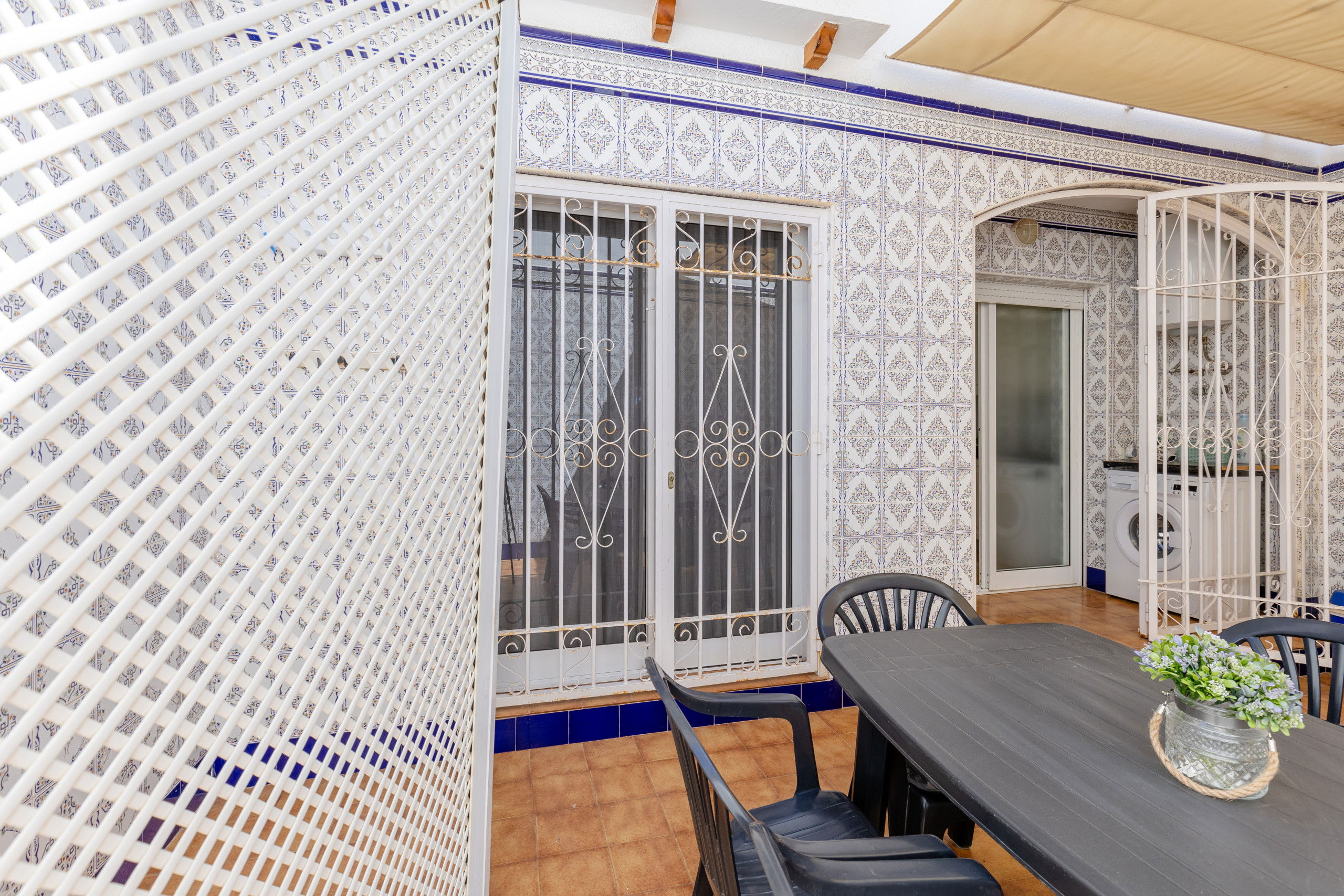 La cuisine séparée est équipée d'un réfrigérateur, micro-ondes, four, congélateur, lave-linge, lave-vaisselle, vaisselle / couverts, ustensiles de cuisine, cafetière, grille-pain et bouilloire. et sa grande cour arrière, à 10 minutes du centre de Torrevieja.
