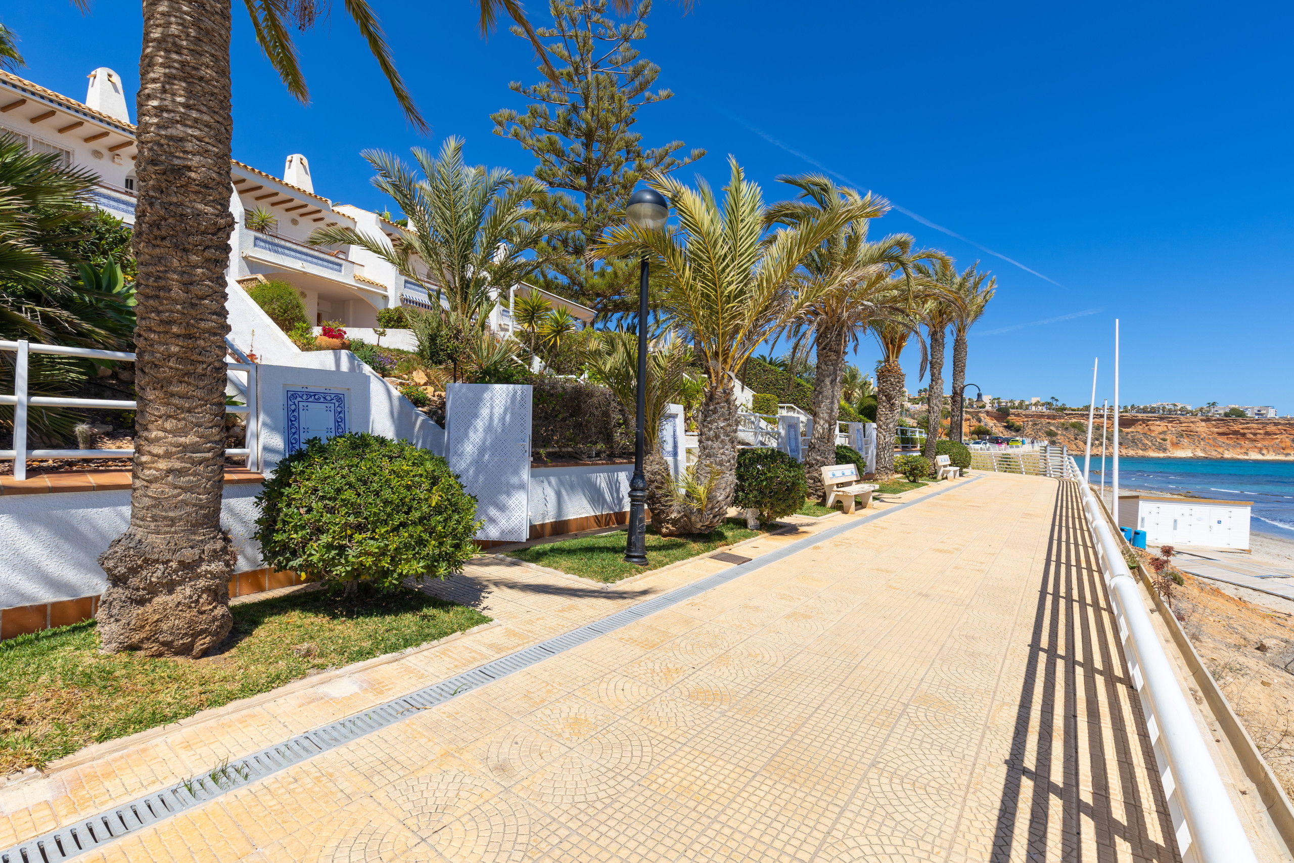 Maison jumelée en bord de mer, dans l'eau de mer, à Orihuela Costa dispose de 4 chambre (s) 3 salles de bain et capacité pour 8 personnes, garage dans le même bâtiment que vous entrez directement du garage à la maison, prix jardin privé face à la mer