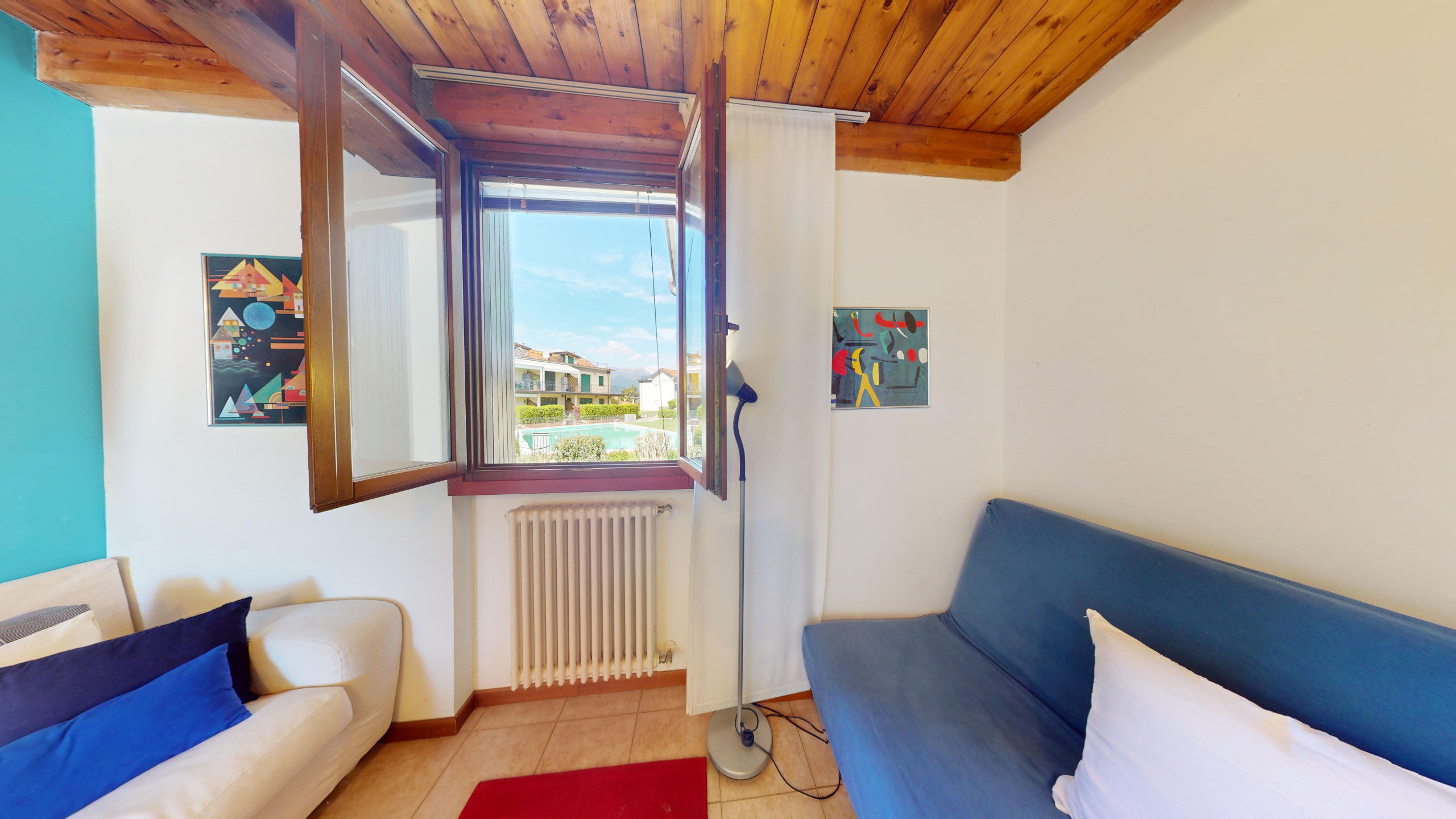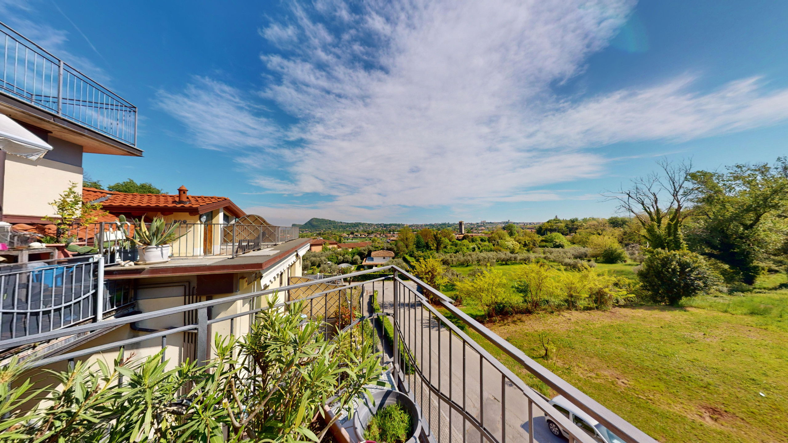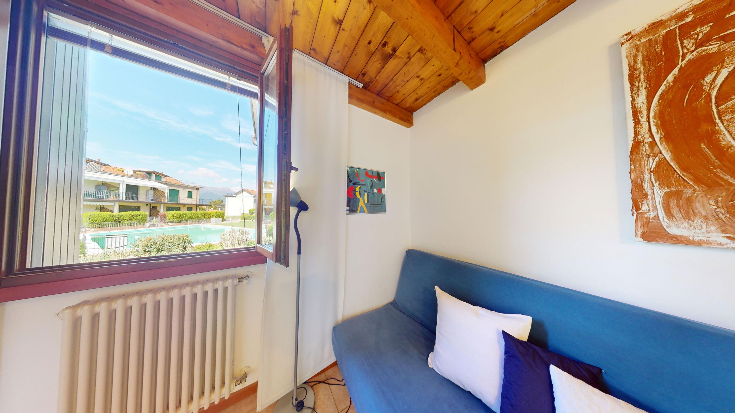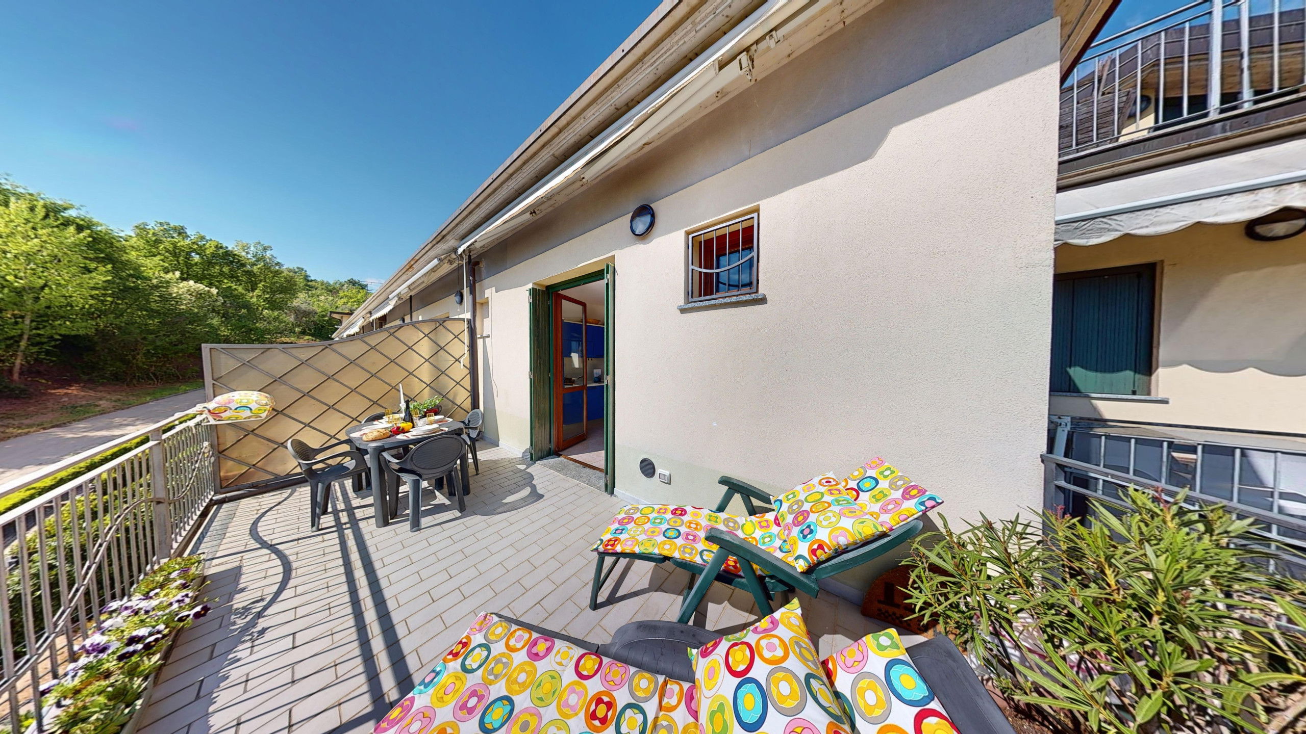 Depuis le salon, on accède à la large terrasse entièrement équipée avec zone repas et chaises longues où l'on peut admirer le promontoire rocheux de la Rocca di Manerba et la réserve naturelle du Sasso. À l'étage en mezzanine, on trouve la chambre à coucher matrimoniale dotée de salle de bain attenante avec douche et machine à laver. Le bien est équipé d'écrans. De la chambre, on accède à la terrasse solarium avec vue sur le lac d'où l'on peut admirer le promontoire, le clocher de la Pieve Vecchia et le vert luxuriant des bois avec les champs caractéristiques d'oliviers en toute intimité.