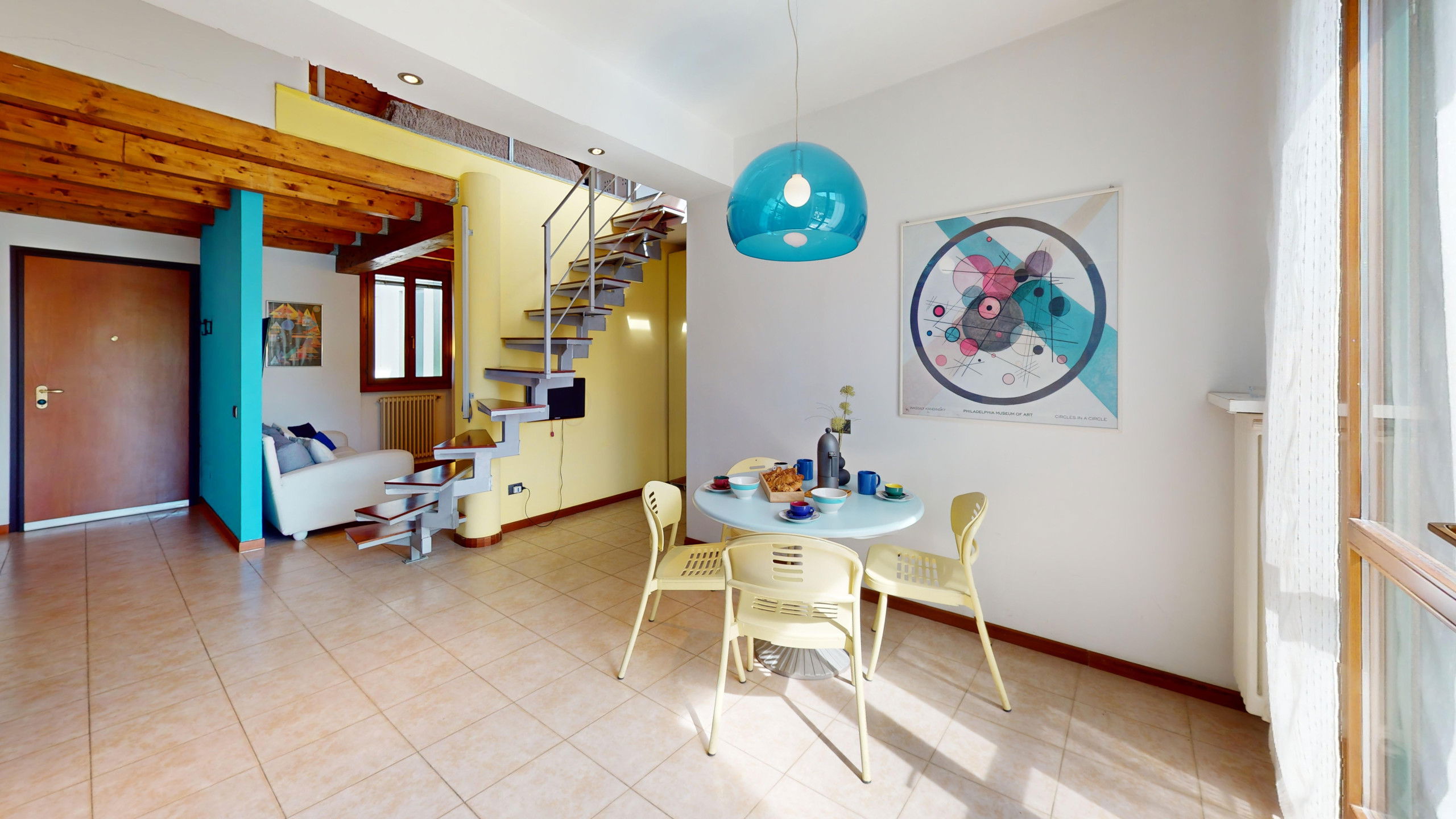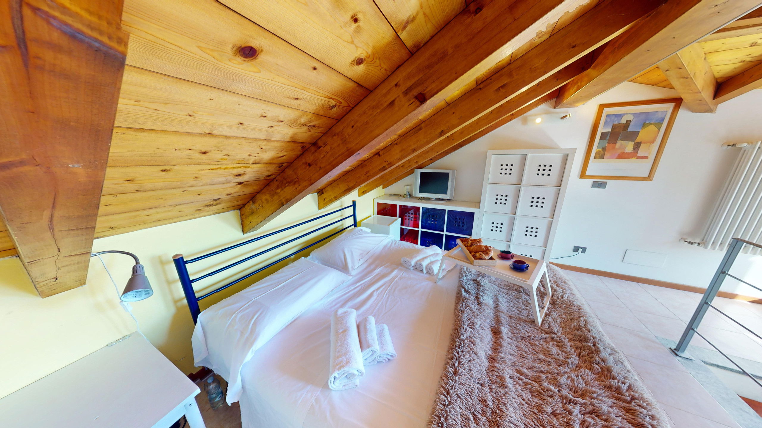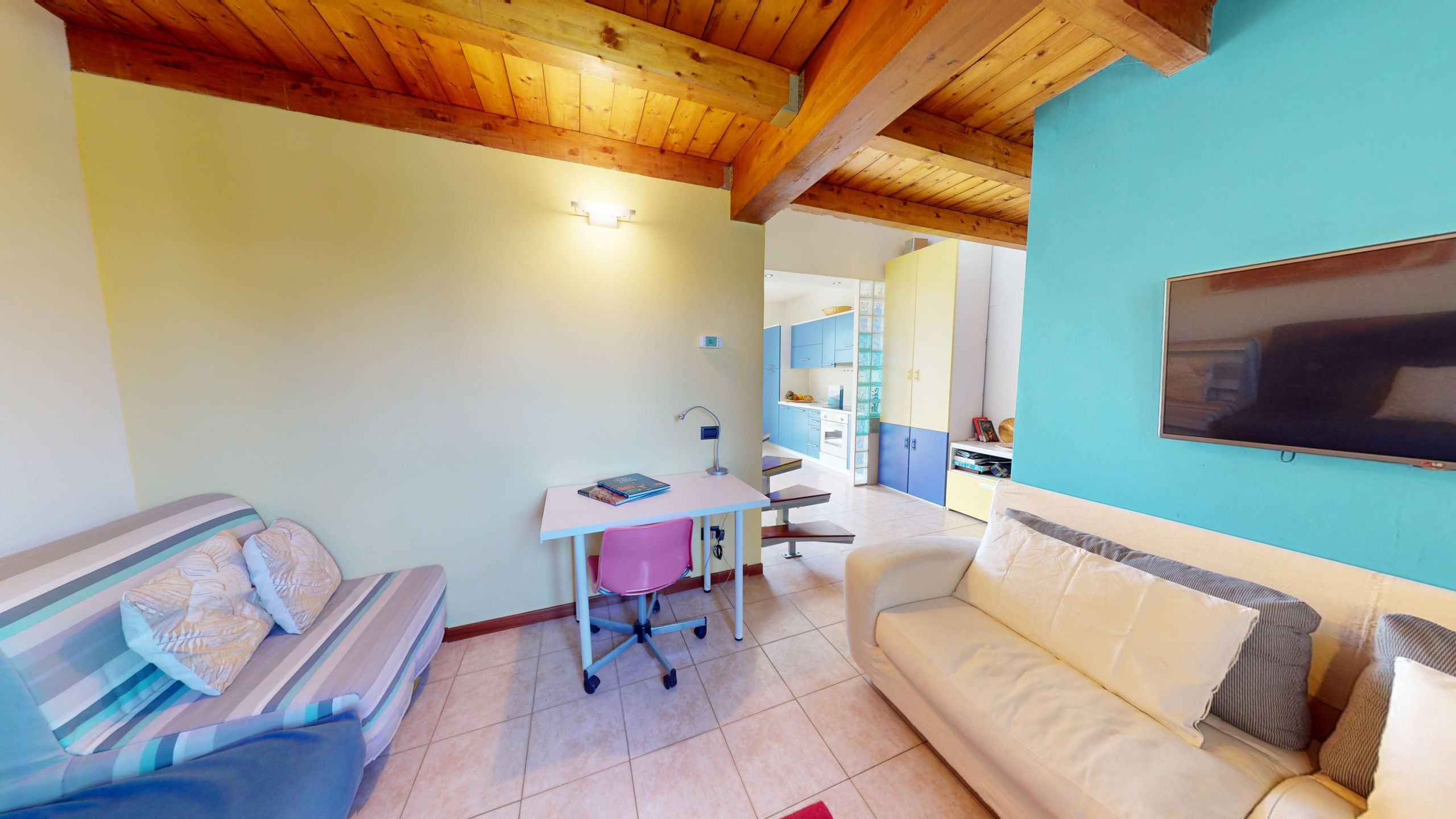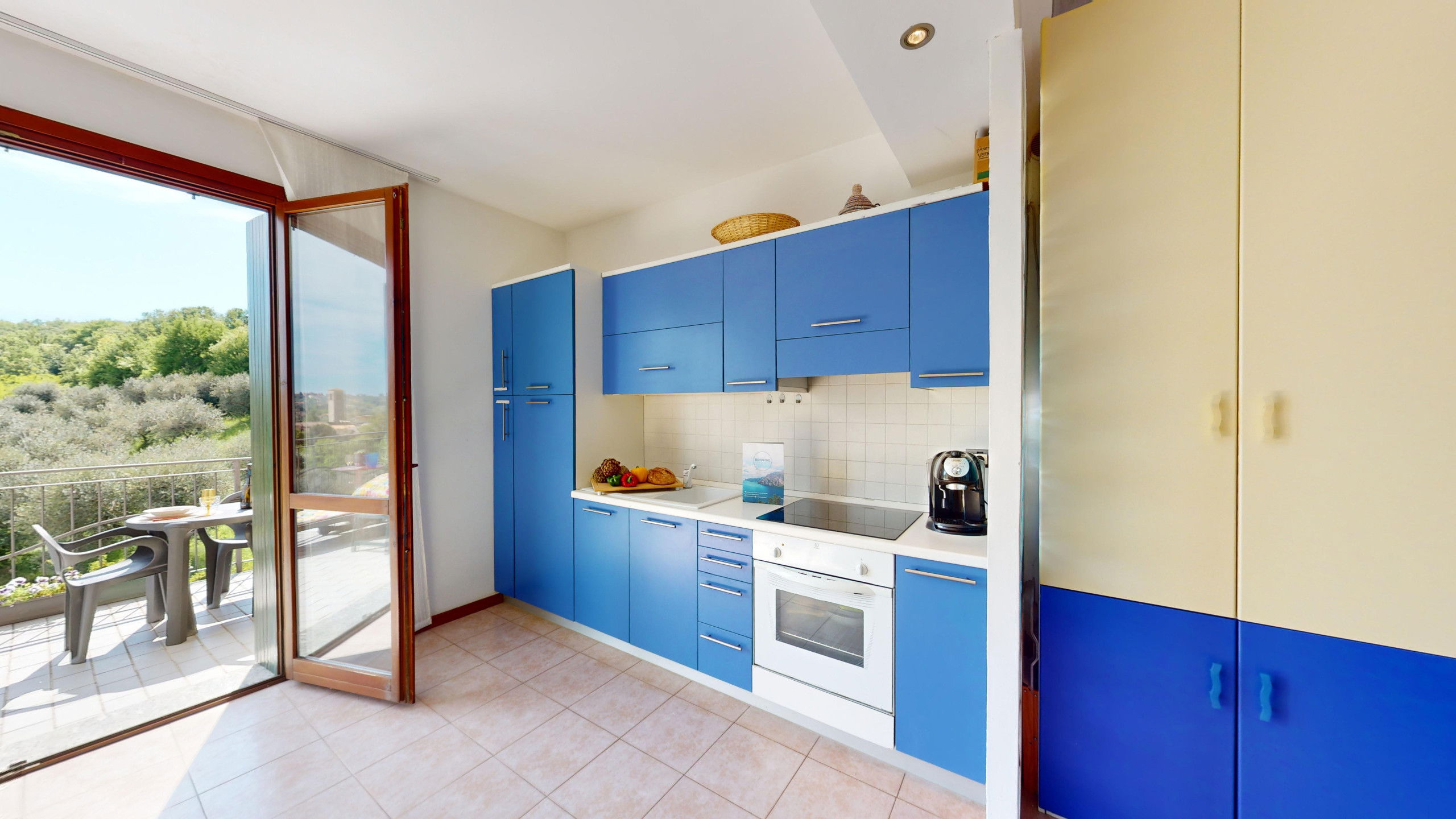 Depuis le salon, on accède à la large terrasse entièrement équipée avec zone repas et chaises longues où l'on peut admirer le promontoire rocheux de la Rocca di Manerba et la réserve naturelle du Sasso. À l'étage en mezzanine, on trouve la chambre à coucher matrimoniale dotée de salle de bain attenante avec douche et machine à laver. Le bien est équipé d'écrans. De la chambre, on accède à la terrasse solarium avec vue sur le lac d'où l'on peut admirer le promontoire, le clocher de la Pieve Vecchia et le vert luxuriant des bois avec les champs caractéristiques d'oliviers en toute intimité.