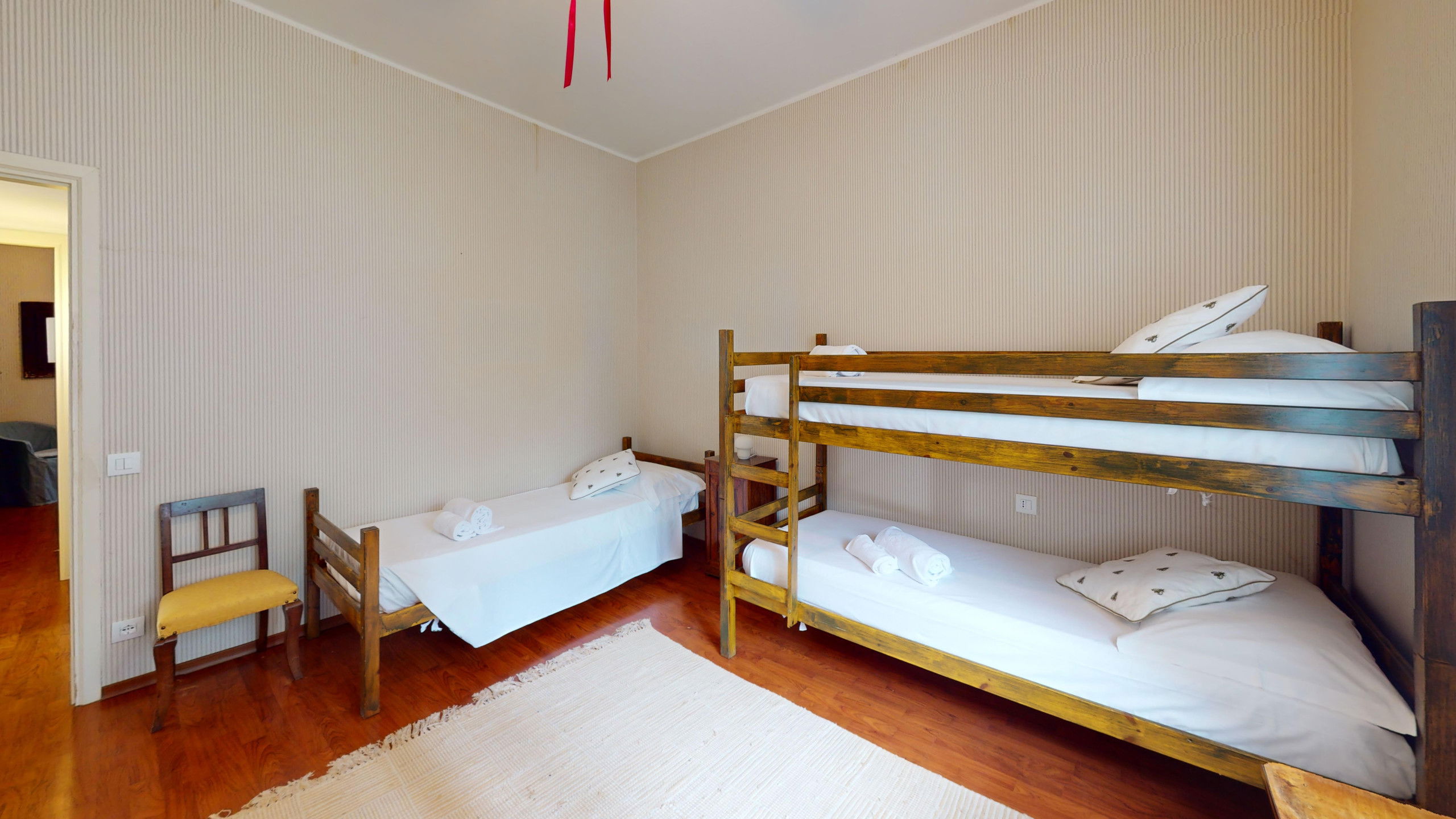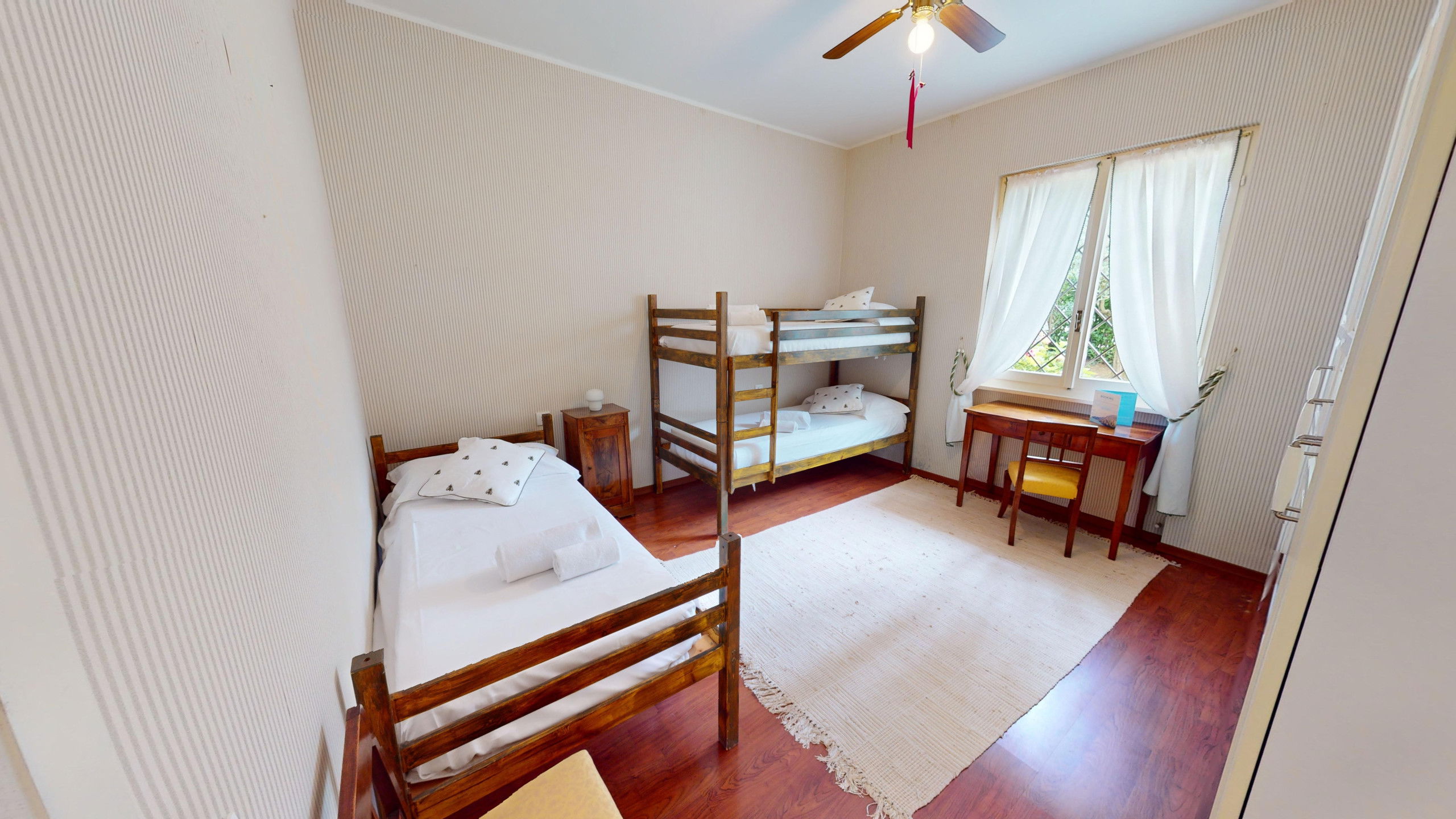 Son vaste salon donnant sur le lac accueille les invités avec chaleur et confort, tandis que la cuisine entièrement équipée promet de délicieux moments en famille. L'espace nuit est composé de la chambre principale avec un lit double et une grande armoire, tandis que la deuxième chambre abrite un lit superposé romantique et un troisième lit simple. La salle de bain complète avec douche est équipée d'un lave-linge.