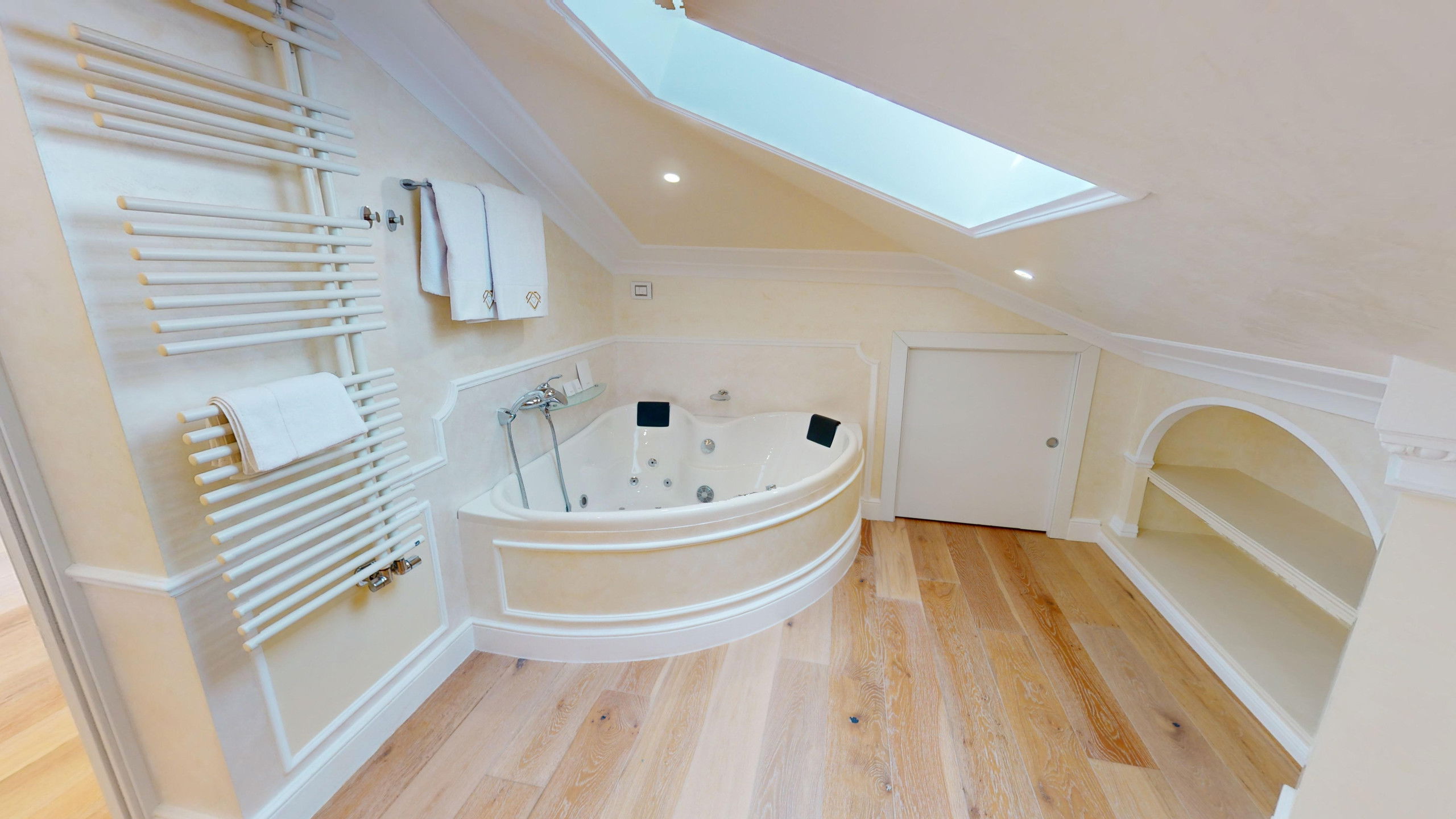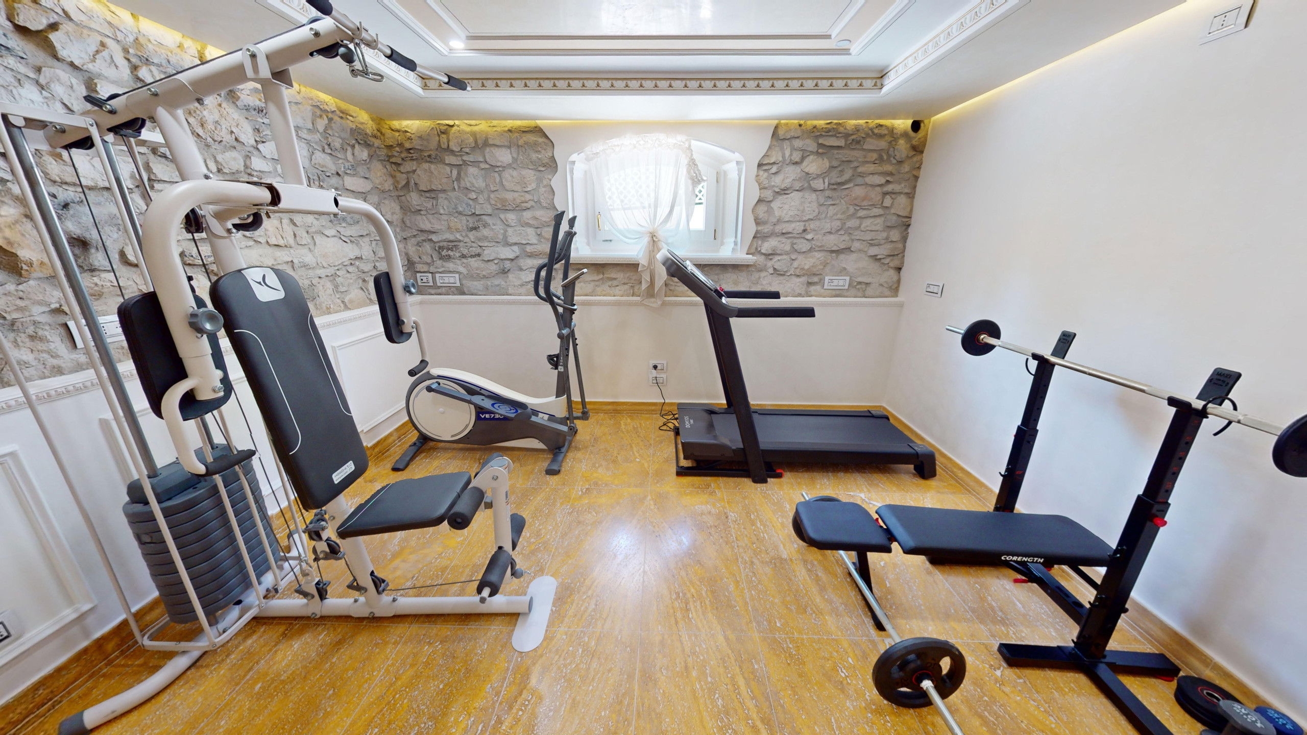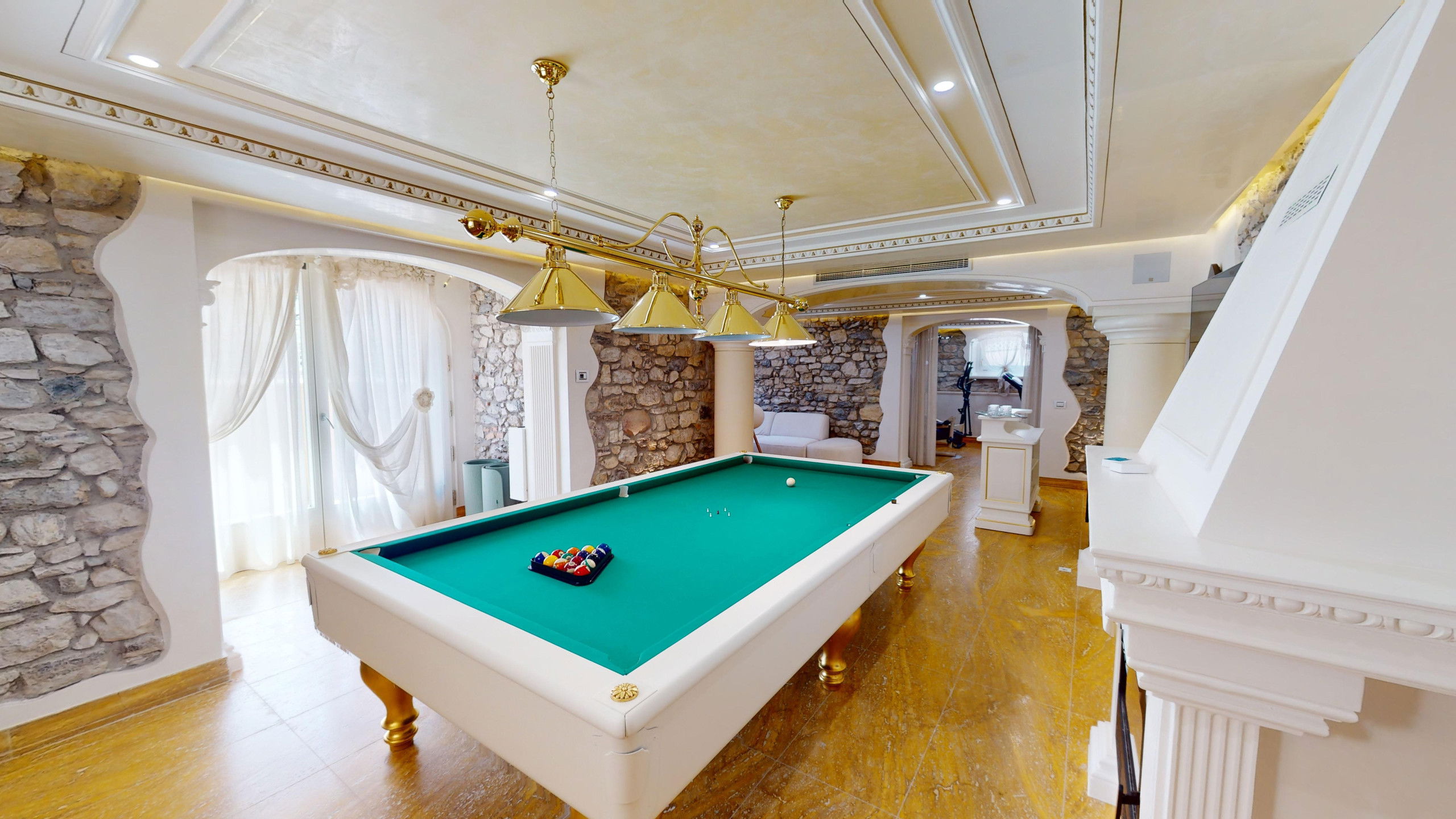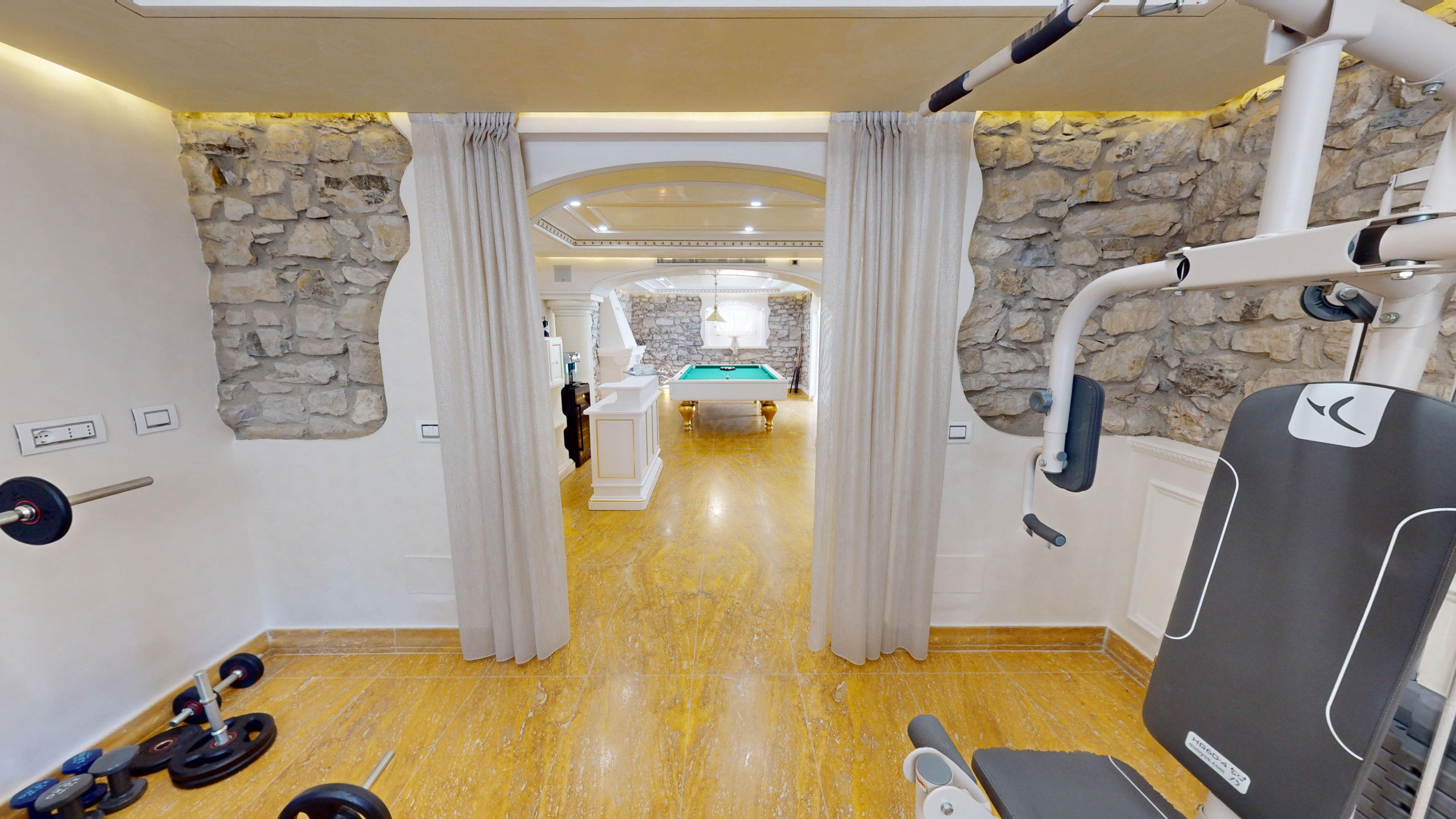 La villa est répartie sur quatre niveaux et dispose d'un ascenseur intérieur. Au premier étage se trouve la zone de vie lumineuse comprenant un grand salon avec cheminée, une salle à manger vue sur le lac et une cuisine moderne dotée de tous les conforts et une chambre avec salle de bain privative. Au deuxième étage se trouvent les trois chambres, toutes équipées d'une salle de bain avec baignoire et balcon. Au troisième étage, enfin, les combles avec salle de bain accueillent une chambre à coucher matrimoniale et une zone de vie. De là, on peut accéder à la terrasse solarium panoramique avec une vue splendide sur le lac. Au sous-sol, on peut accéder à la buanderie, à la salle de bain et à l'espace spa et bien-être, doté de sauna, hammam et jacuzzi. Au même niveau, on peut également trouver la salle de gym entièrement équipée et l'espace de loisirs avec mini-bar et billard, d'où l'on peut accéder directement à la piscine. Depuis le jardin soigneusement entretenu, on peut accéder à l'espace repas extérieur avec pergola, table, barbecue et cuisine extérieure avec jacuzzi.