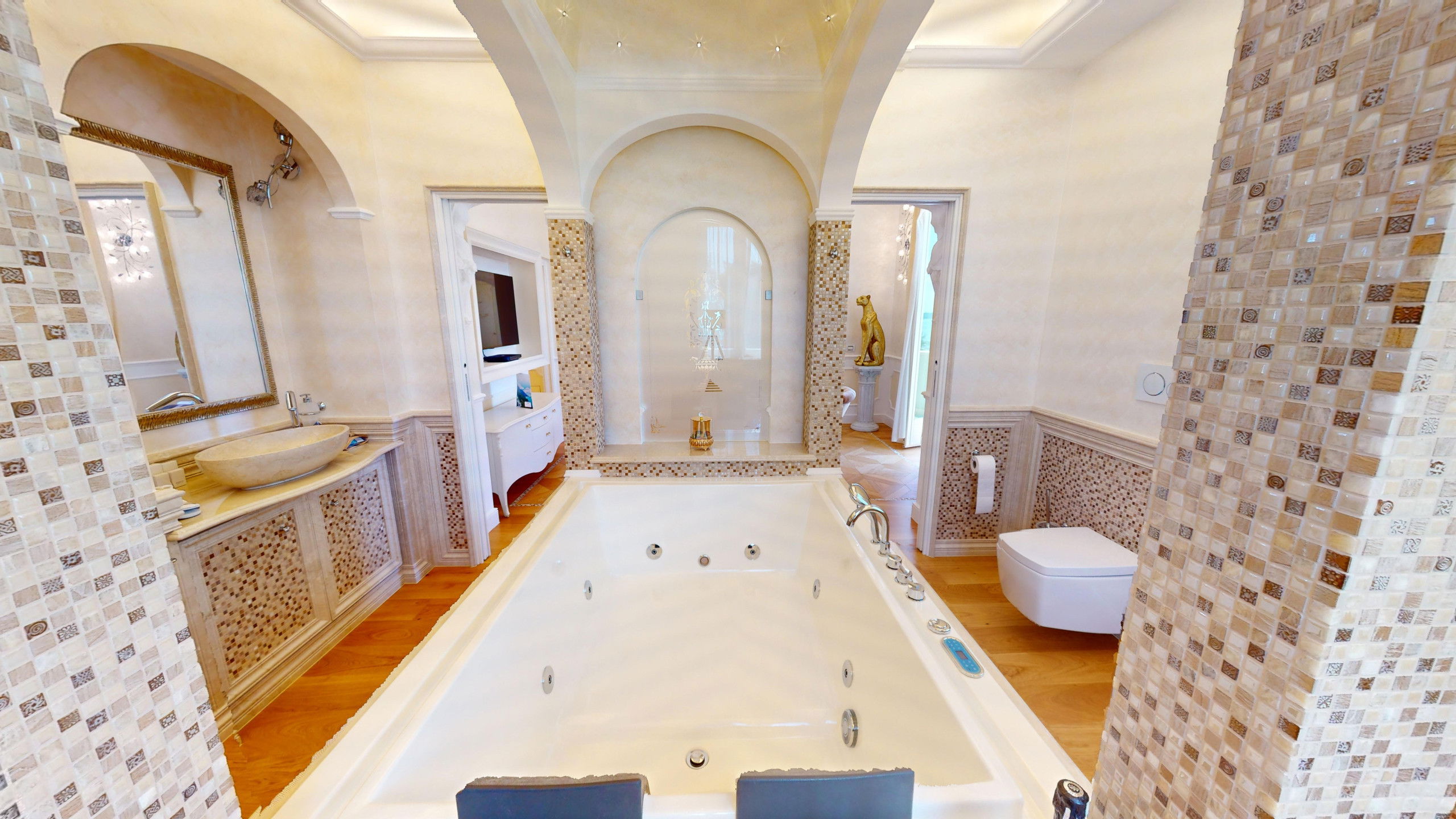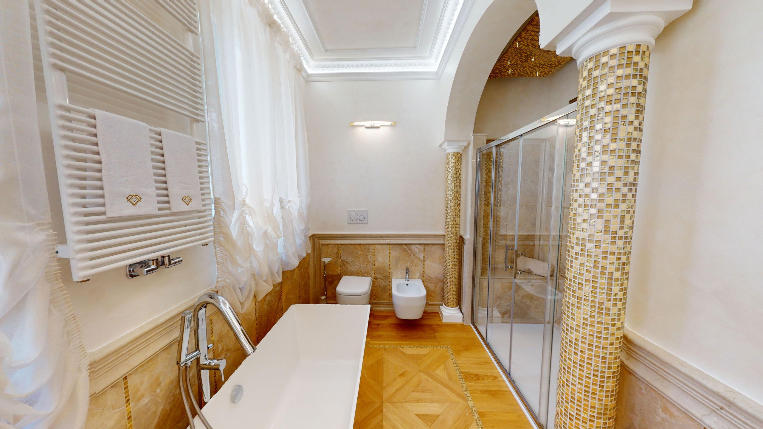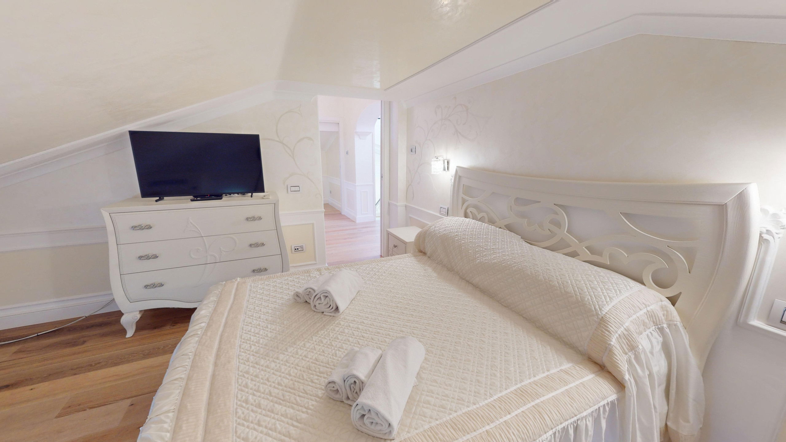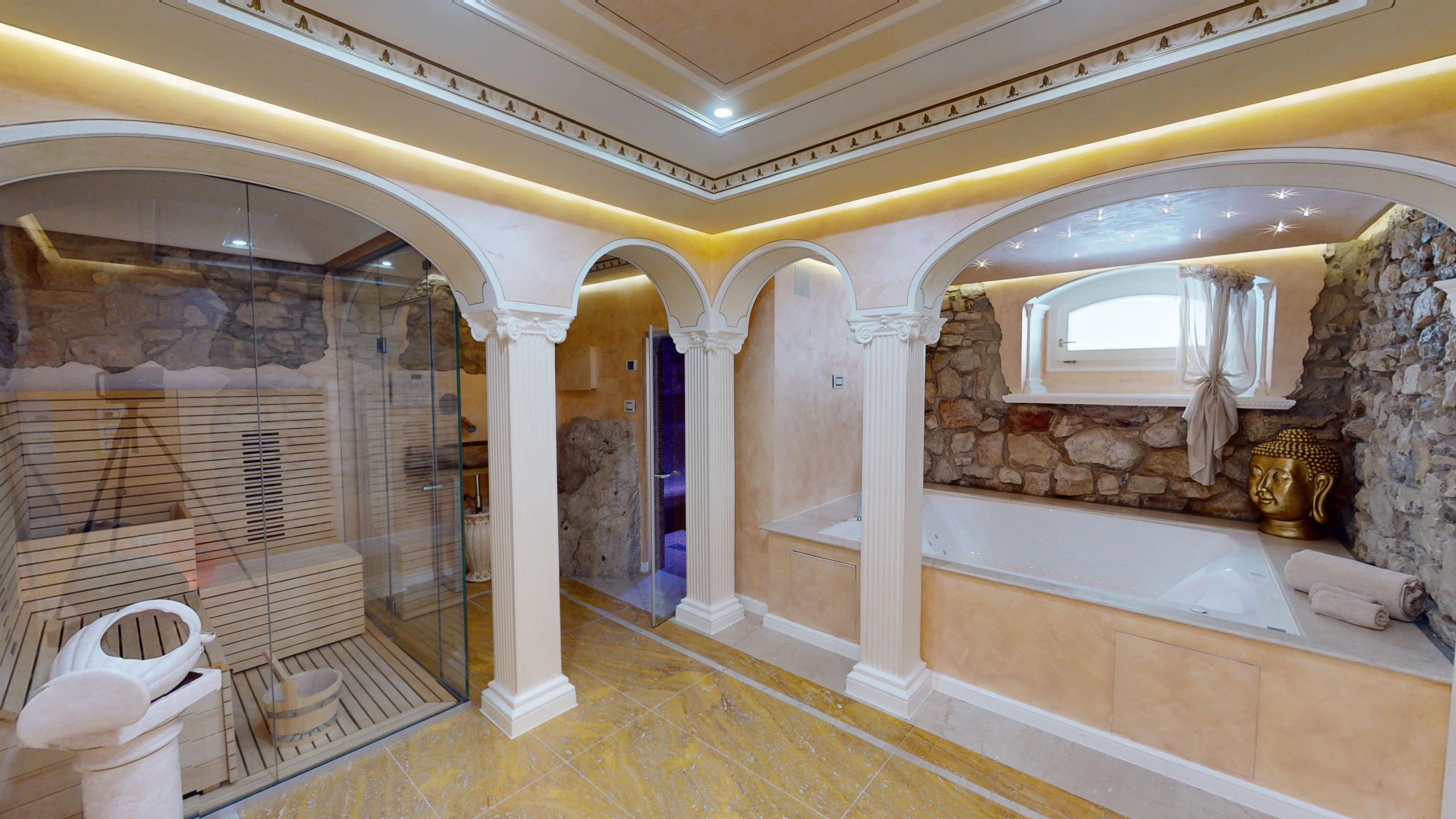 La villa est répartie sur quatre niveaux et dispose d'un ascenseur intérieur. Au premier étage se trouve la zone de vie lumineuse comprenant un grand salon avec cheminée, une salle à manger vue sur le lac et une cuisine moderne dotée de tous les conforts et une chambre avec salle de bain privative. Au deuxième étage se trouvent les trois chambres, toutes équipées d'une salle de bain avec baignoire et balcon. Au troisième étage, enfin, les combles avec salle de bain accueillent une chambre à coucher matrimoniale et une zone de vie. De là, on peut accéder à la terrasse solarium panoramique avec une vue splendide sur le lac. Au sous-sol, on peut accéder à la buanderie, à la salle de bain et à l'espace spa et bien-être, doté de sauna, hammam et jacuzzi. Au même niveau, on peut également trouver la salle de gym entièrement équipée et l'espace de loisirs avec mini-bar et billard, d'où l'on peut accéder directement à la piscine. Depuis le jardin soigneusement entretenu, on peut accéder à l'espace repas extérieur avec pergola, table, barbecue et cuisine extérieure avec jacuzzi.