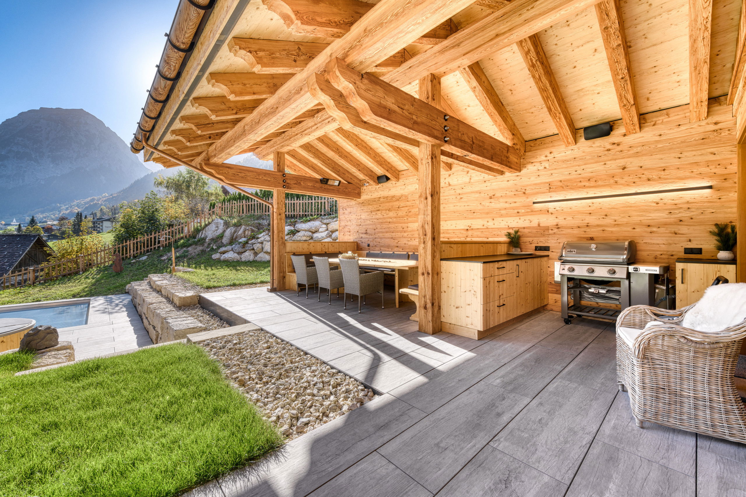 Logement de 470 m² meublé avec goût et vaste, avec vue sur la montagne et le jardin.
