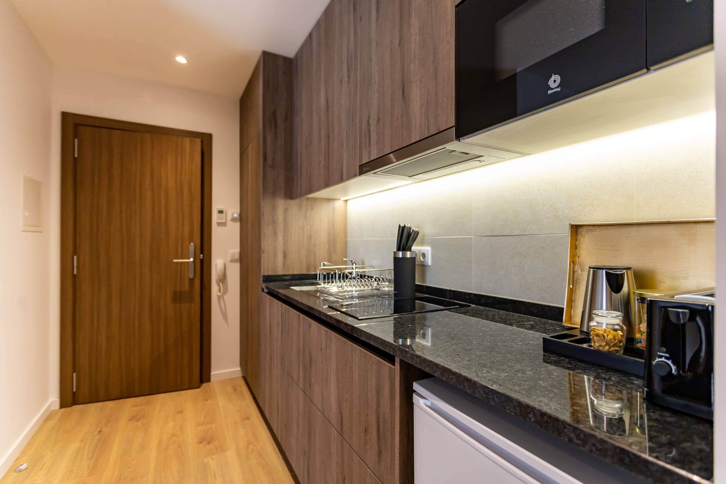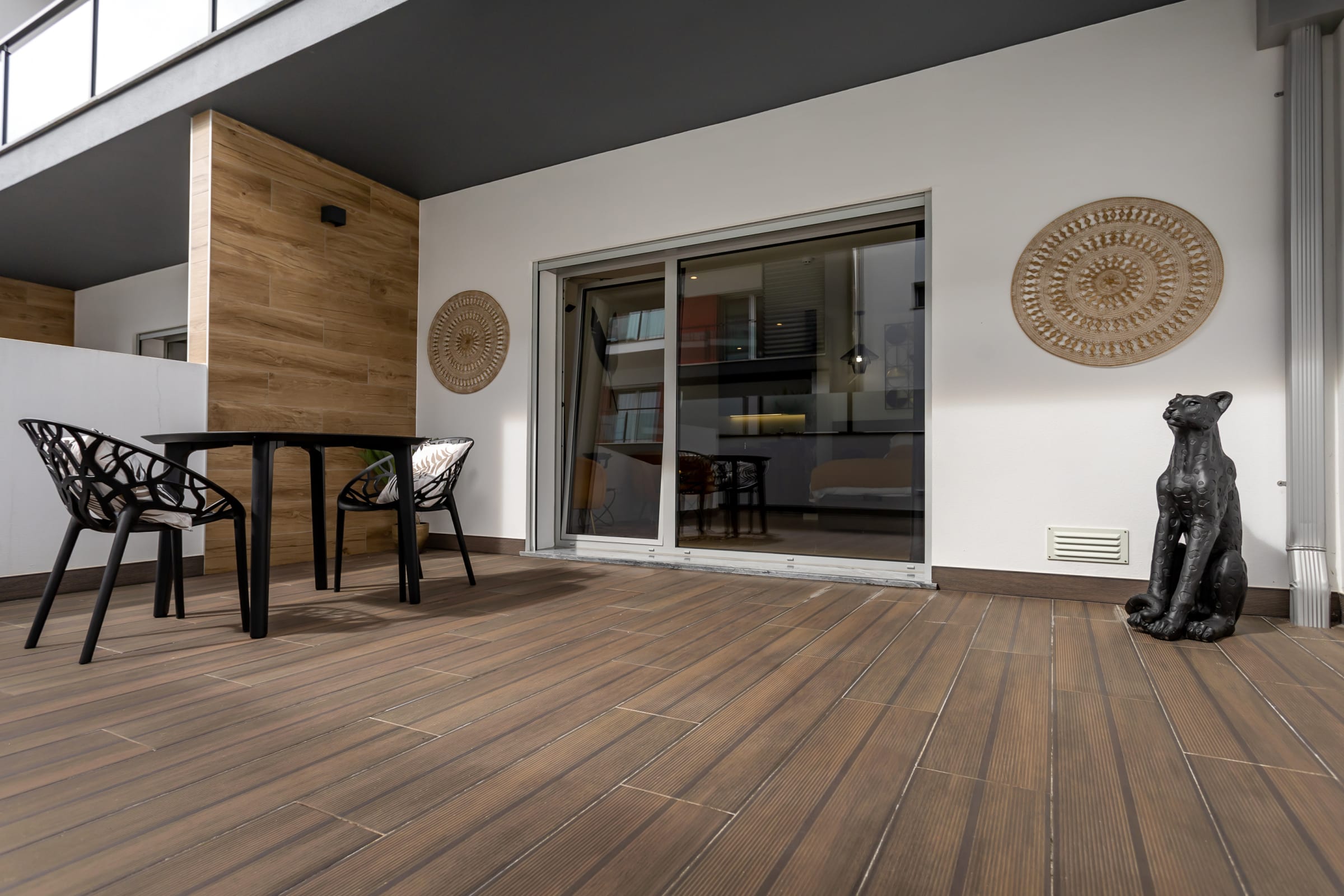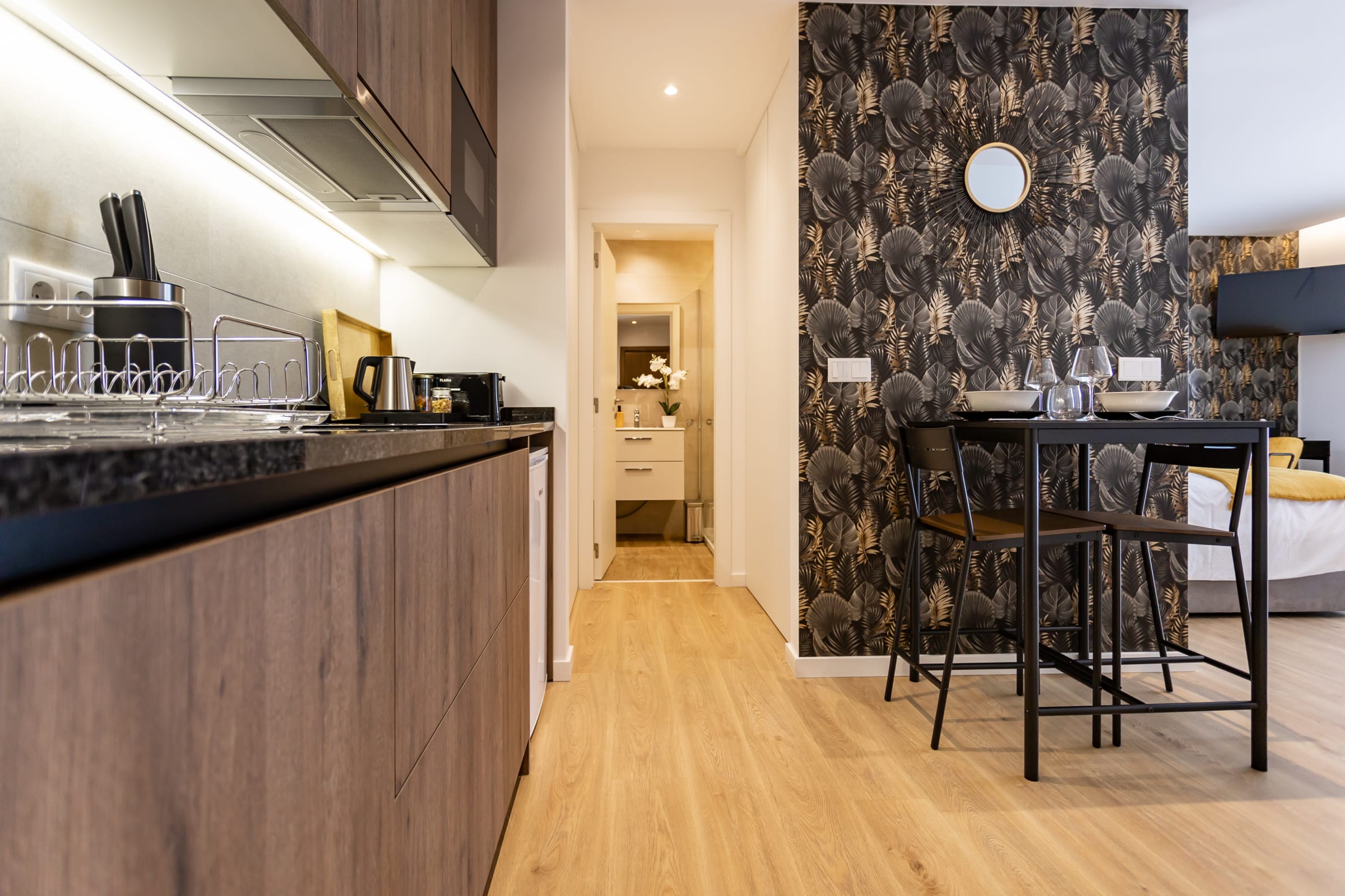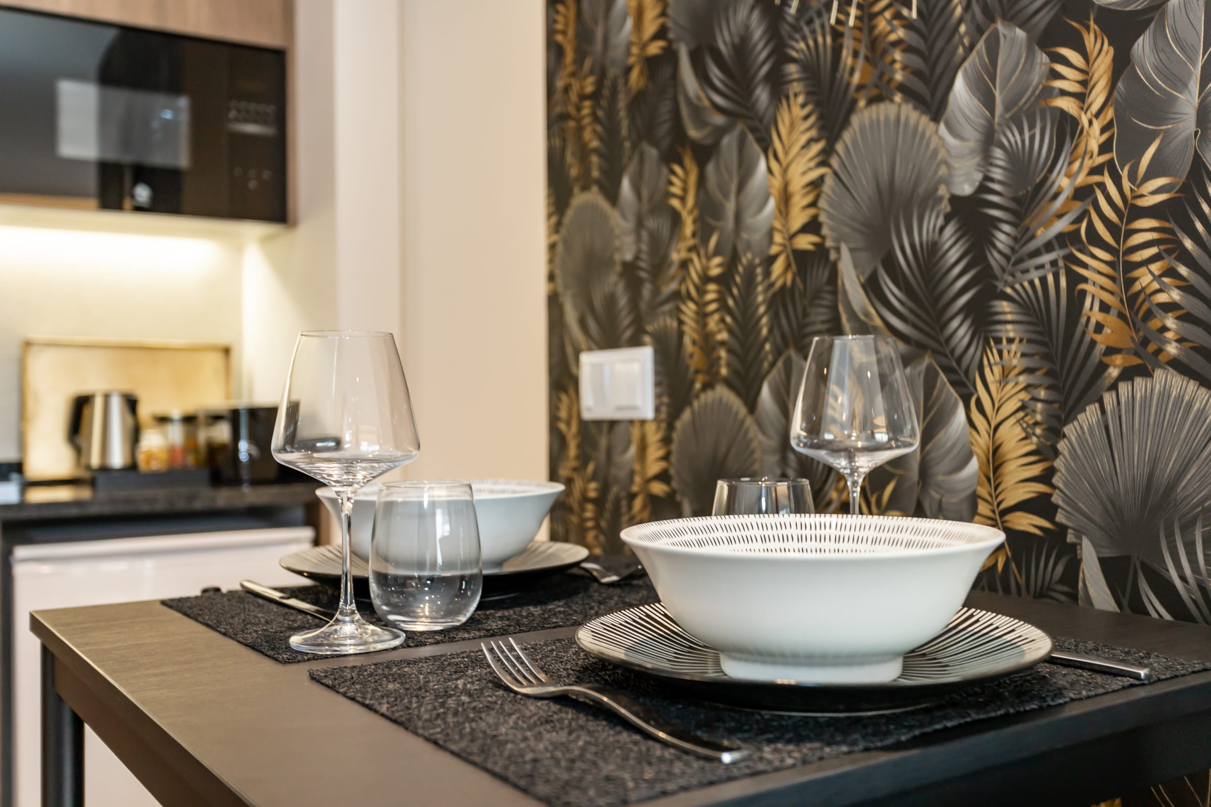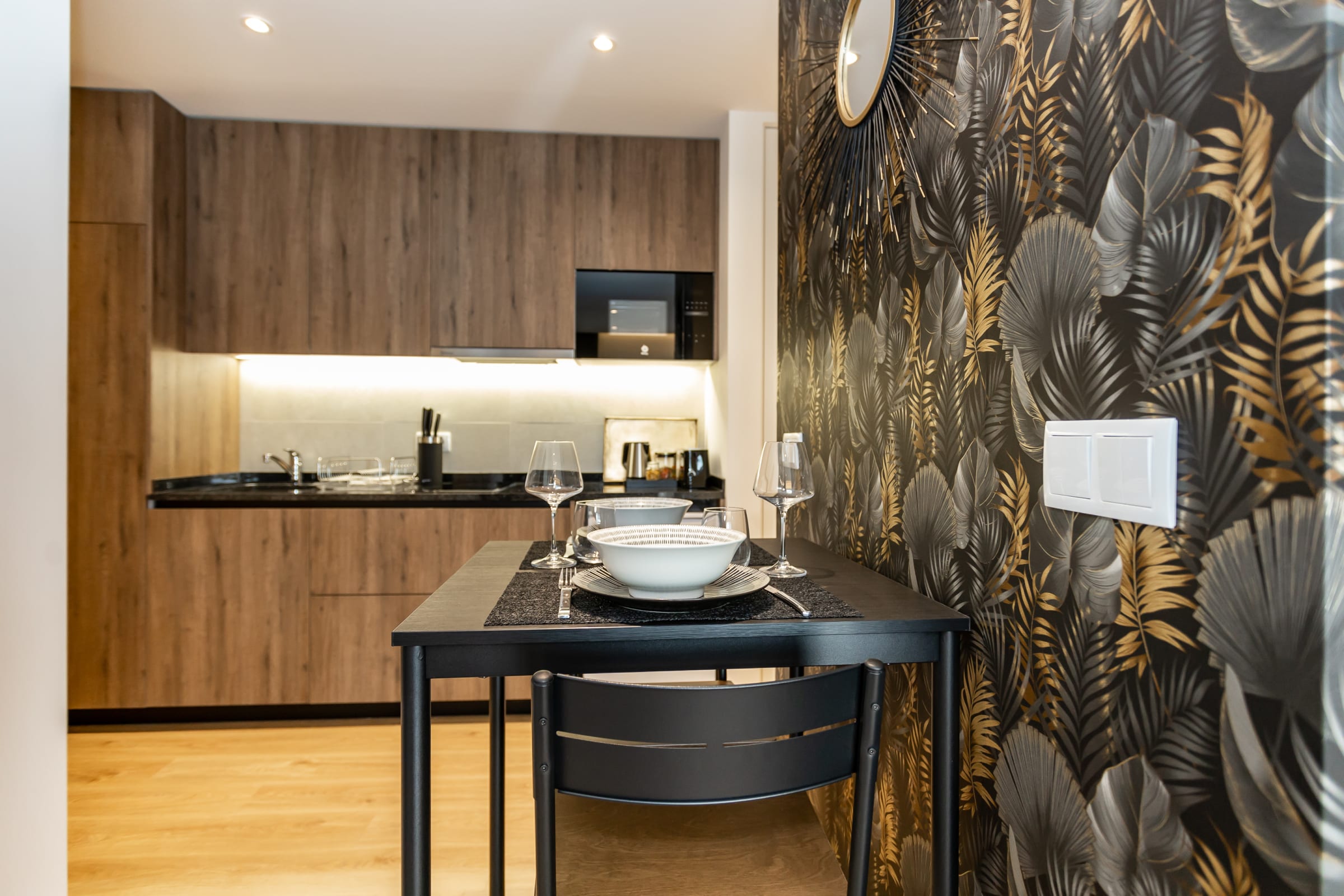 L'appartement GOLD N°3 comprend une grande terrasse, une cuisine équipée ( Micro ondes- grill, Plaque, hotte, réfrigérateur, bouilloire, grille pain), un coin repas, une chambre avec télévision, des placards de rangement, une salle de bain avec douche italienne, WC, et lave linge.