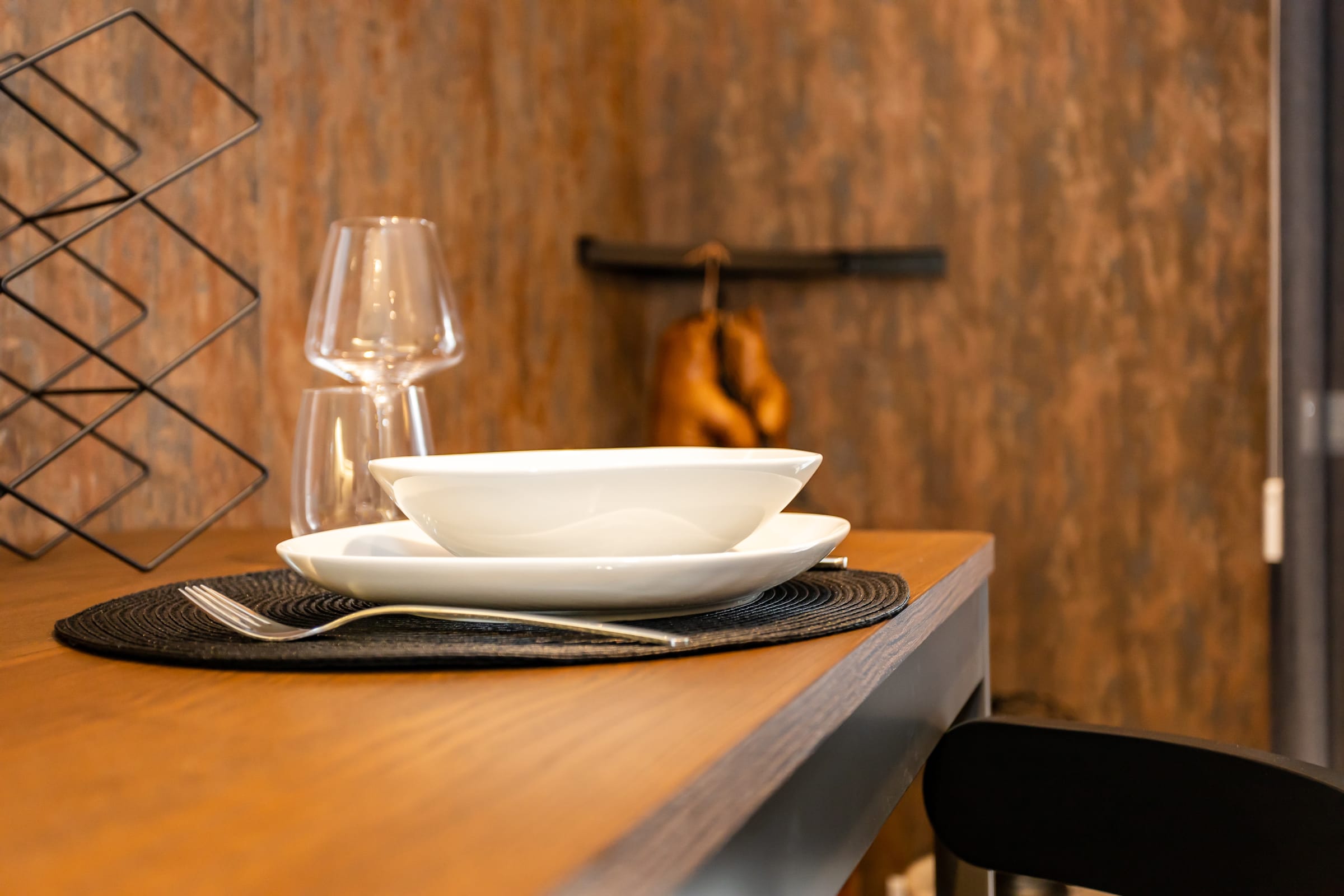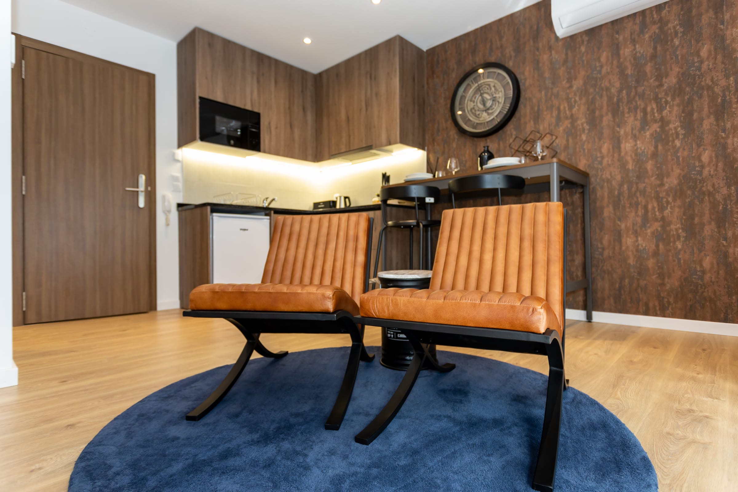 L'appartement FACTORY N°4 comprend une grande terrasse, une cuisine équipée ( Micro ondes- grill, Plaque, hotte, réfrigérateur, bouilloire, grille pain), un coin repas, une chambre avec télévision, des placards de rangement, une salle de bain avec douche italienne, WC, et lave linge.