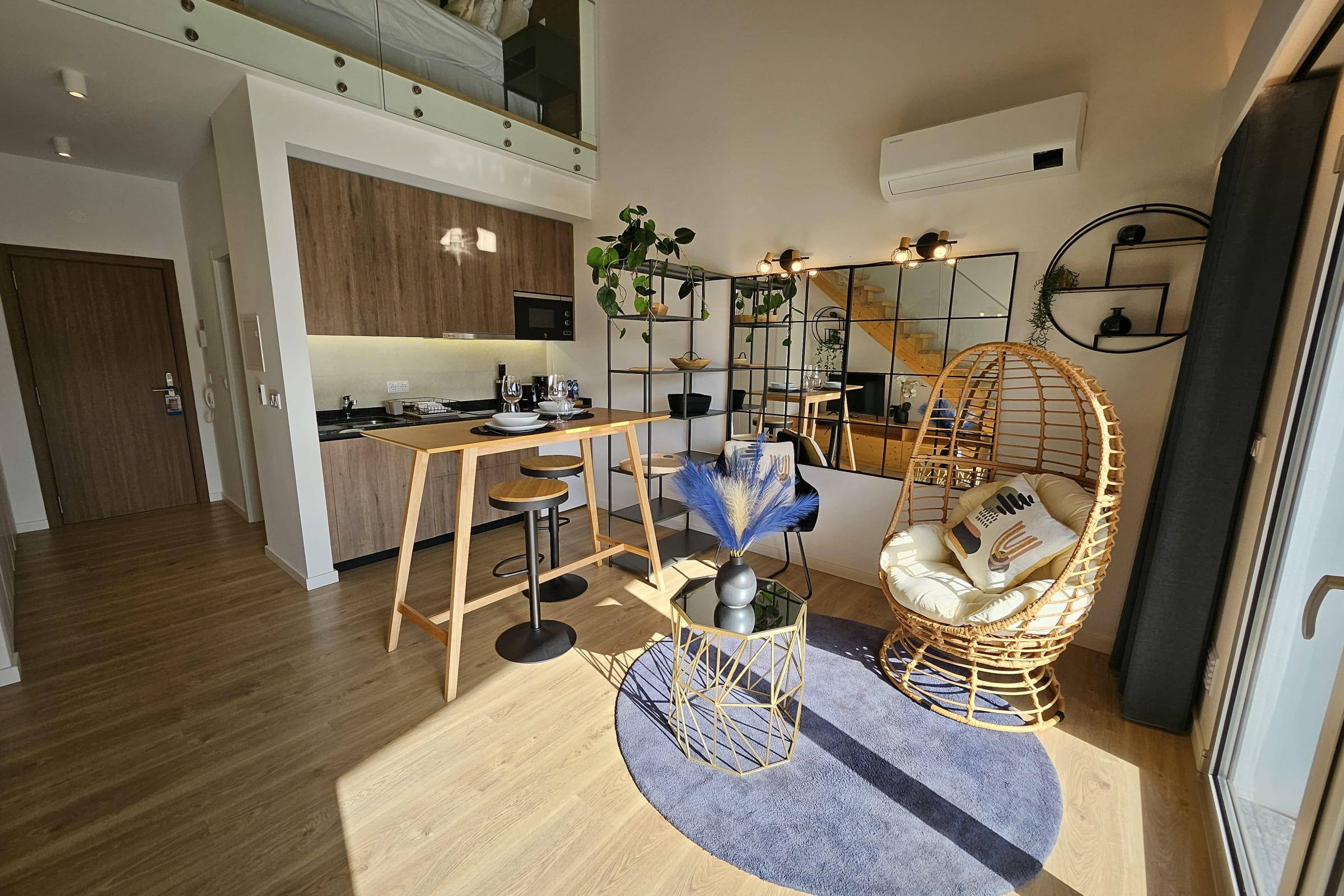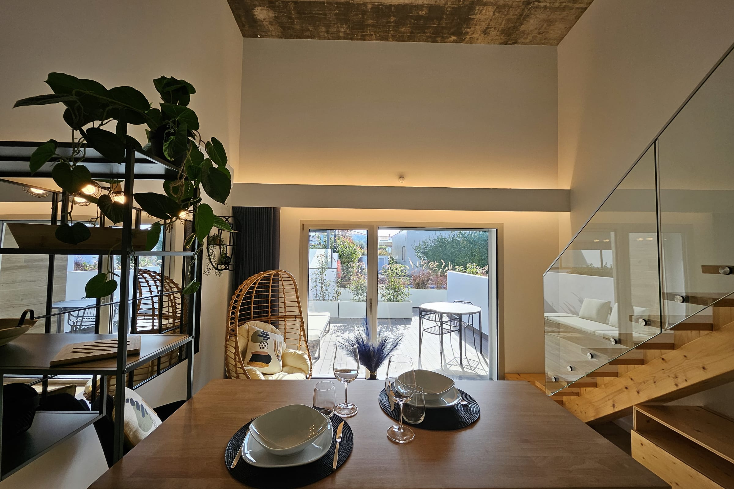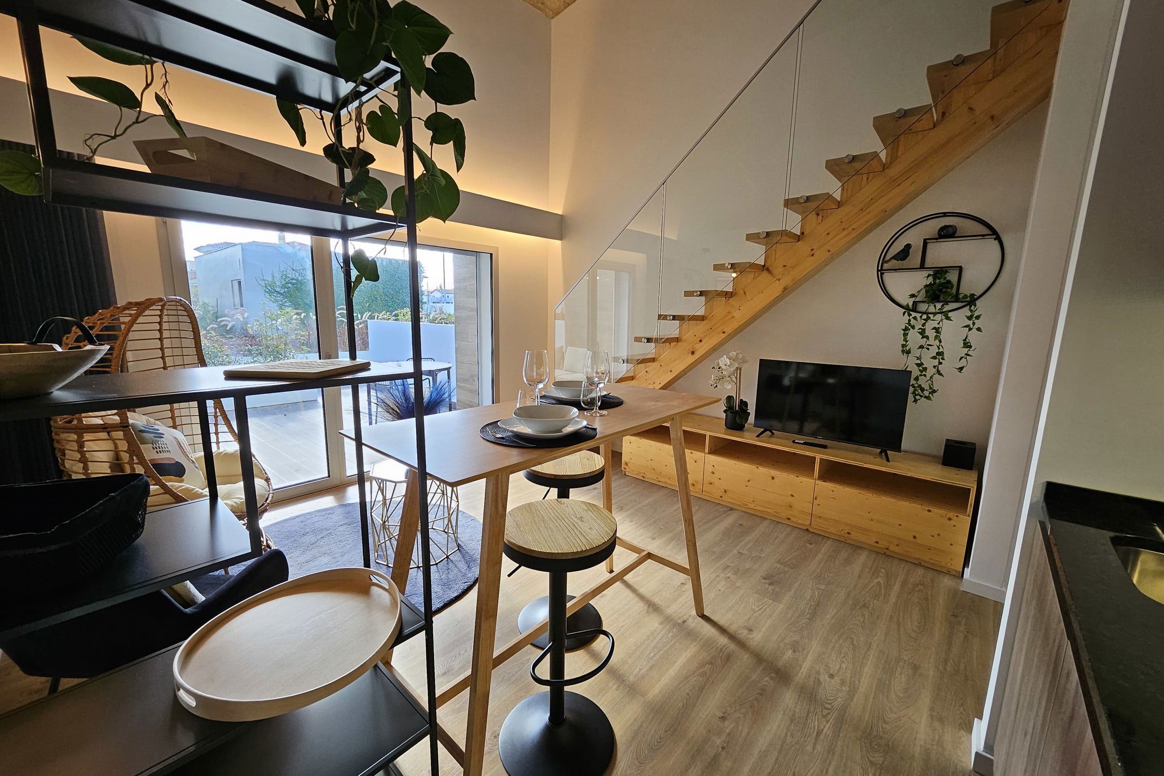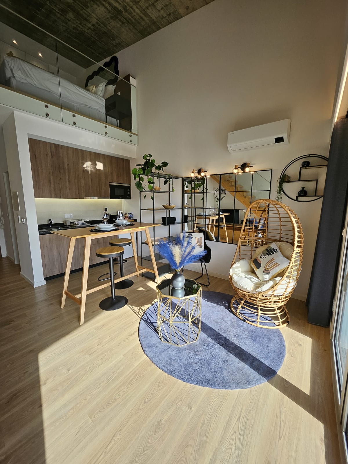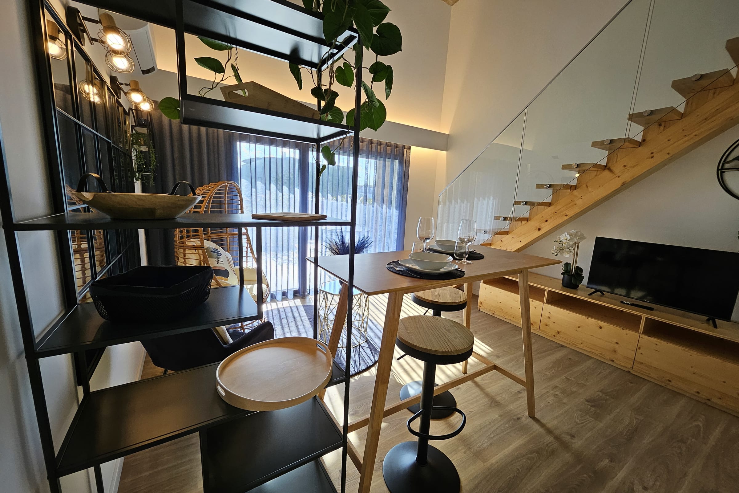L'appartement Loft Duo N°7 comprend une terrasse, une entrée avec placard, une cuisine équipée ( Micro ondes, Plaque, hotte, réfrigérateur-congélateur, bouilloire, grille pain, cafetière ), un salon avec télévision, un coin repas, une salle de bain avec douche et WC. A l'étage une chambre avec un espace bureau, des placards de rangement, et une télévision.