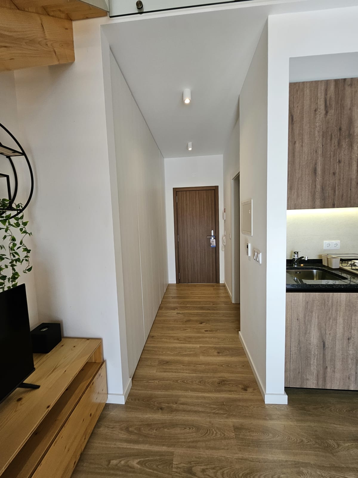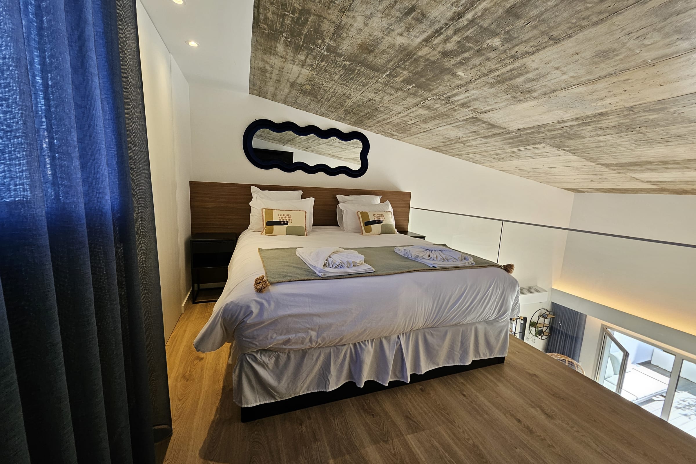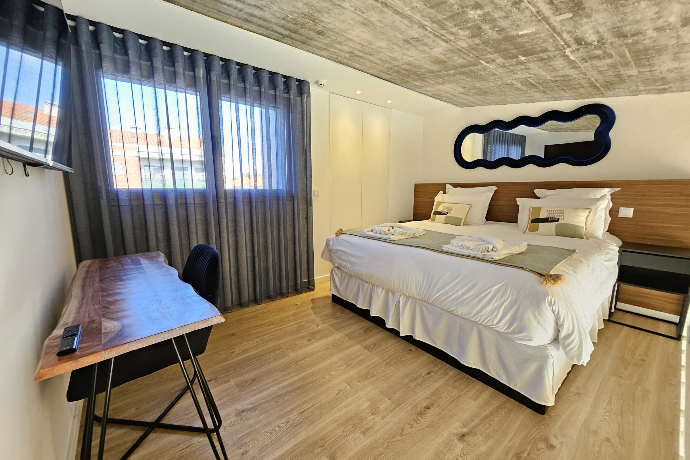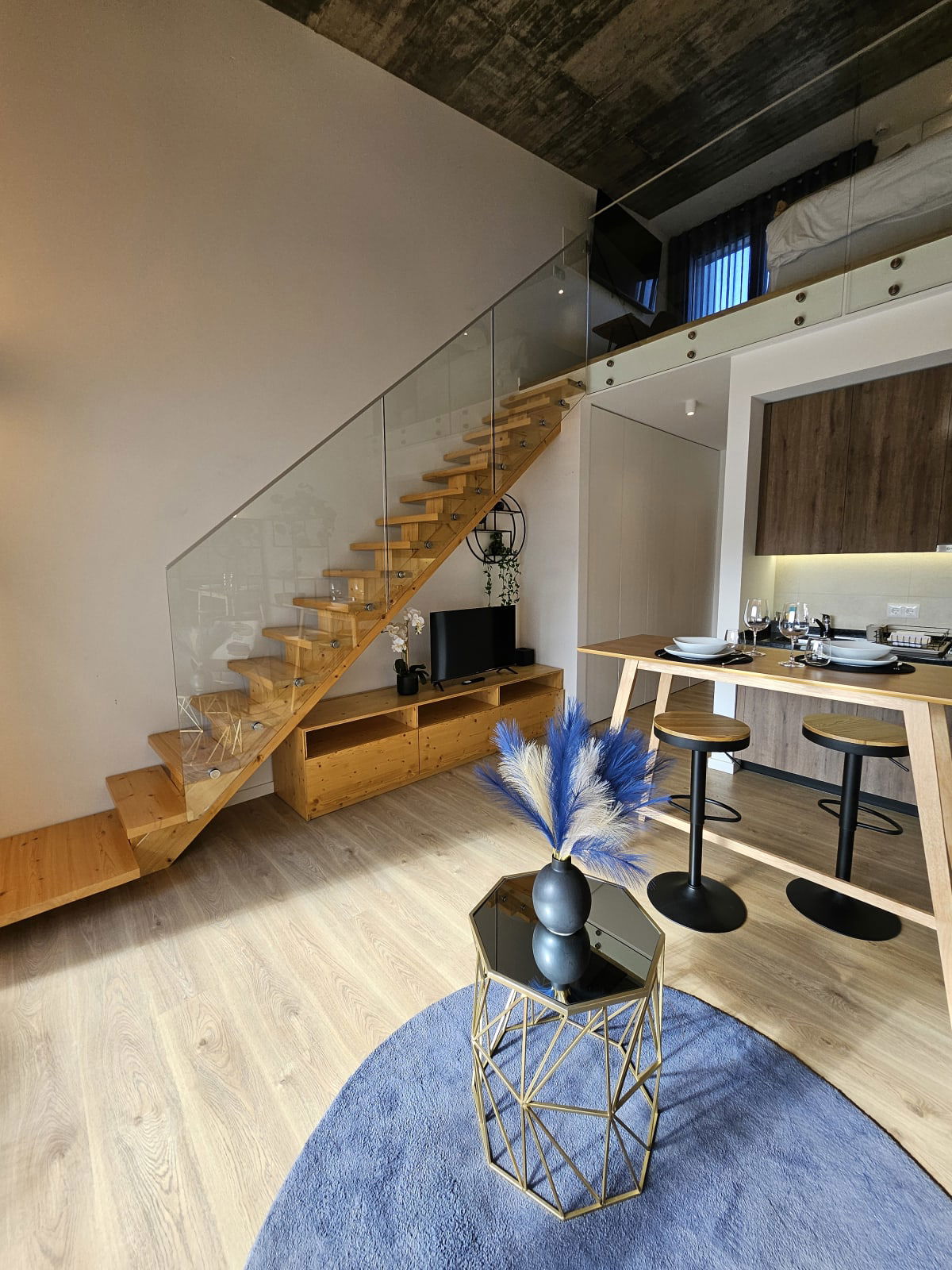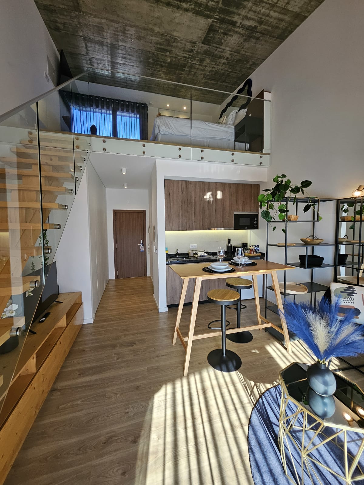 L'appartement Loft Duo N°7 comprend une terrasse, une entrée avec placard, une cuisine équipée ( Micro ondes, Plaque, hotte, réfrigérateur-congélateur, bouilloire, grille pain, cafetière ), un salon avec télévision, un coin repas, une salle de bain avec douche et WC. A l'étage une chambre avec un espace bureau, des placards de rangement, et une télévision.