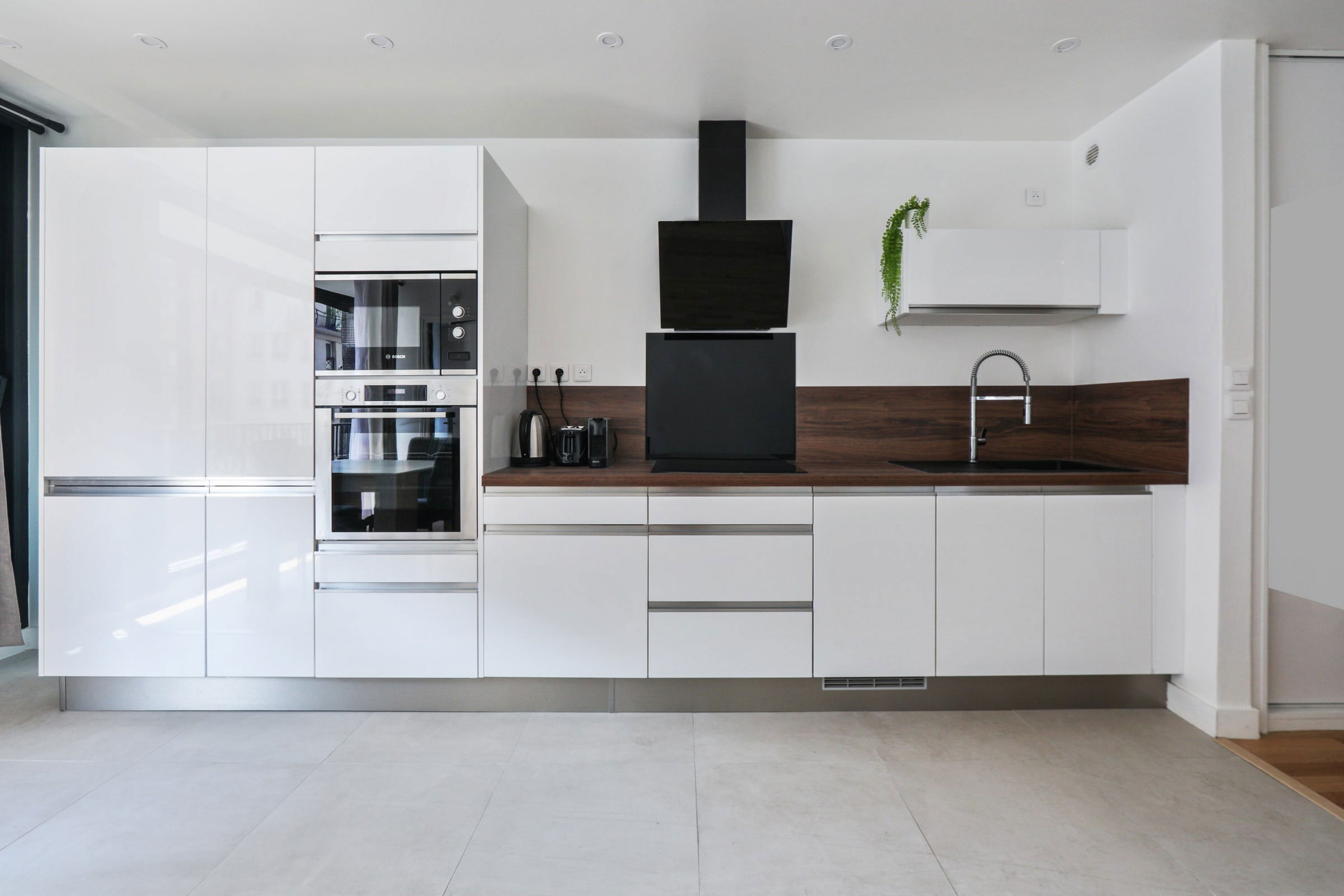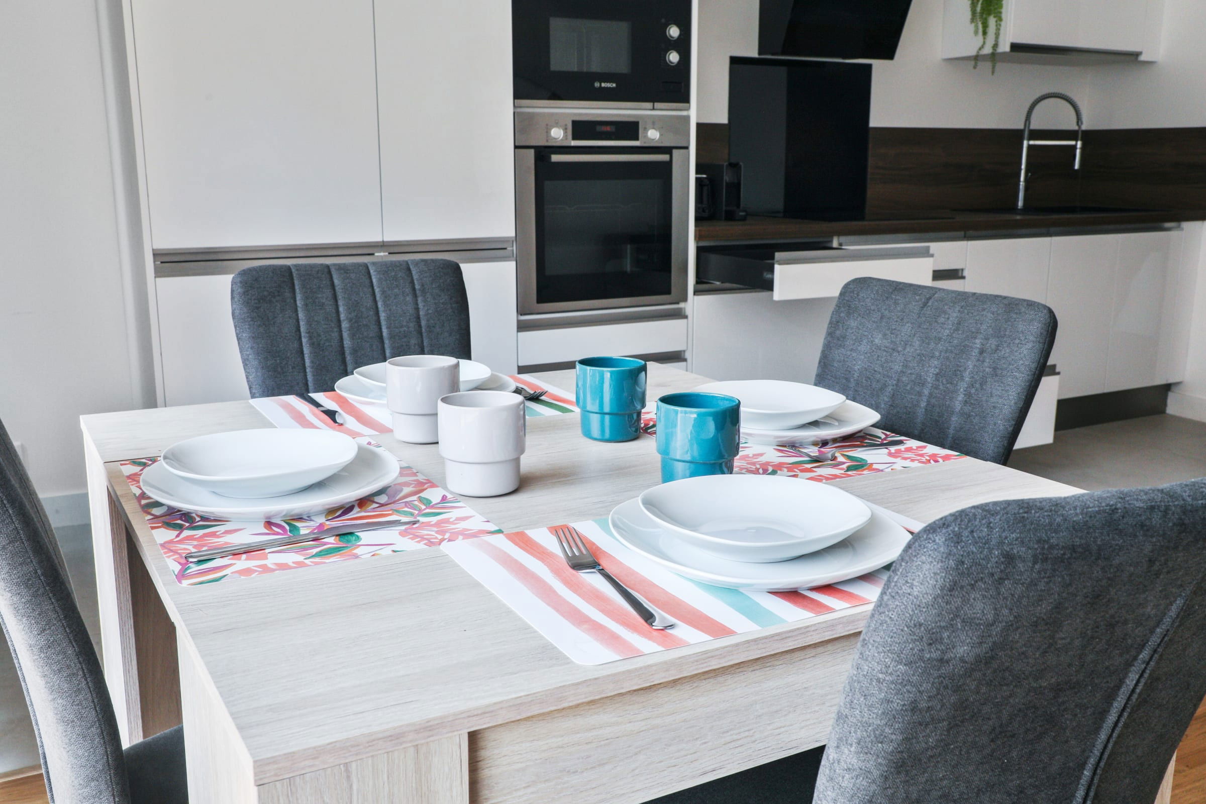 - une cuisine design et bien équipée (machine à café, grille-pain, four, micro-onde, bouilloire, plaques de cuisson, réfrigérateur, congélateur)