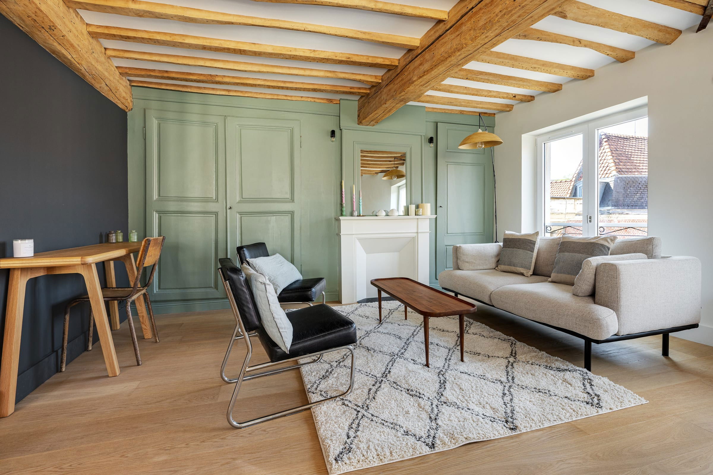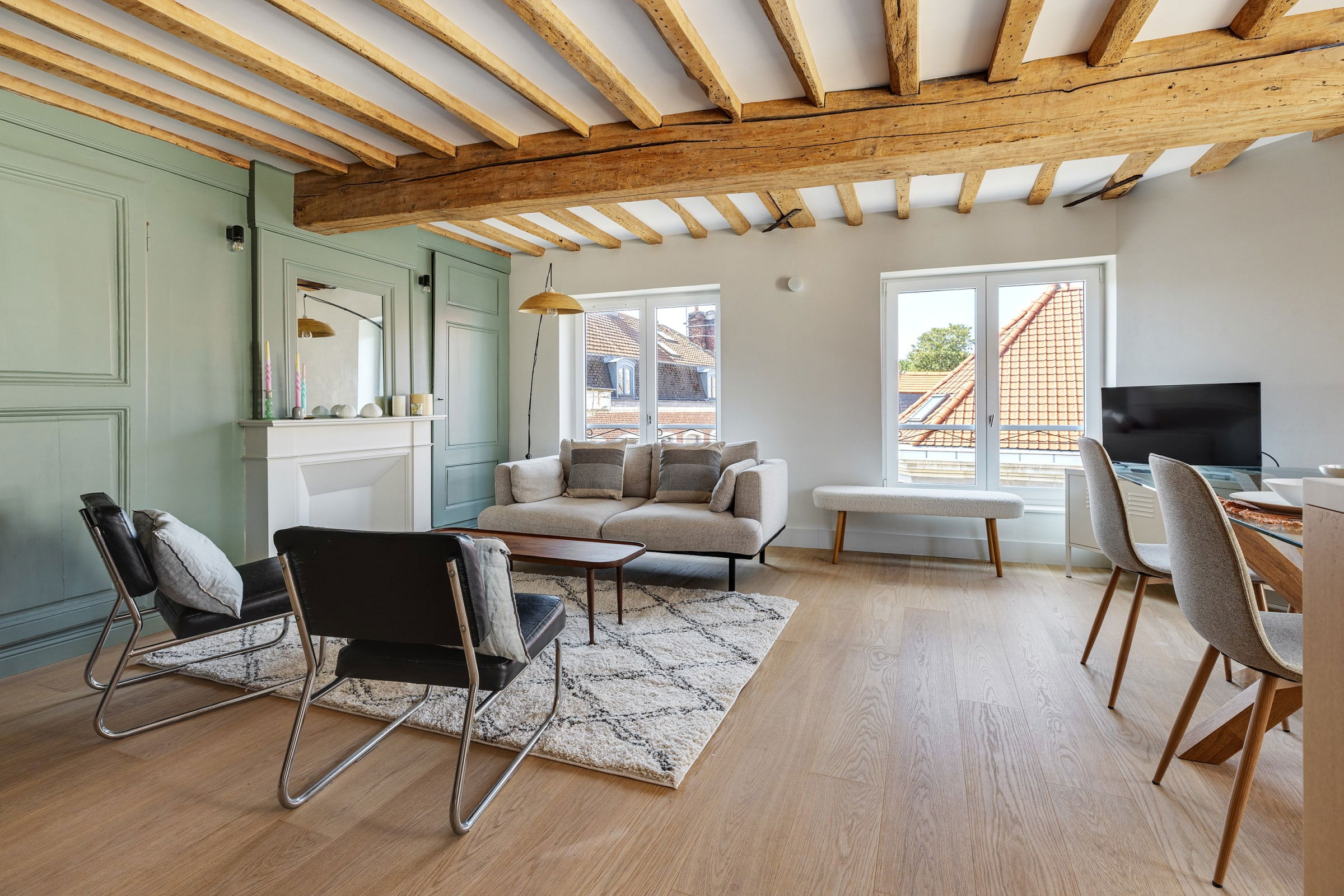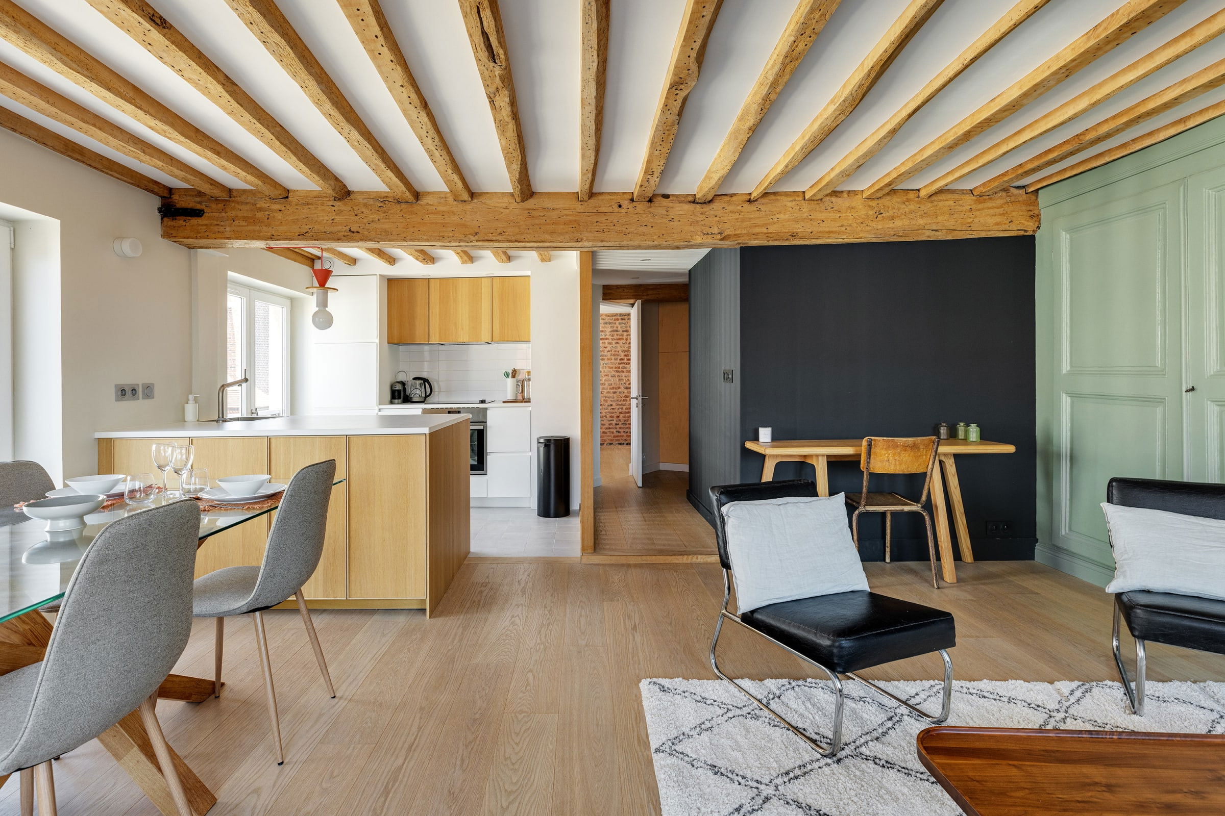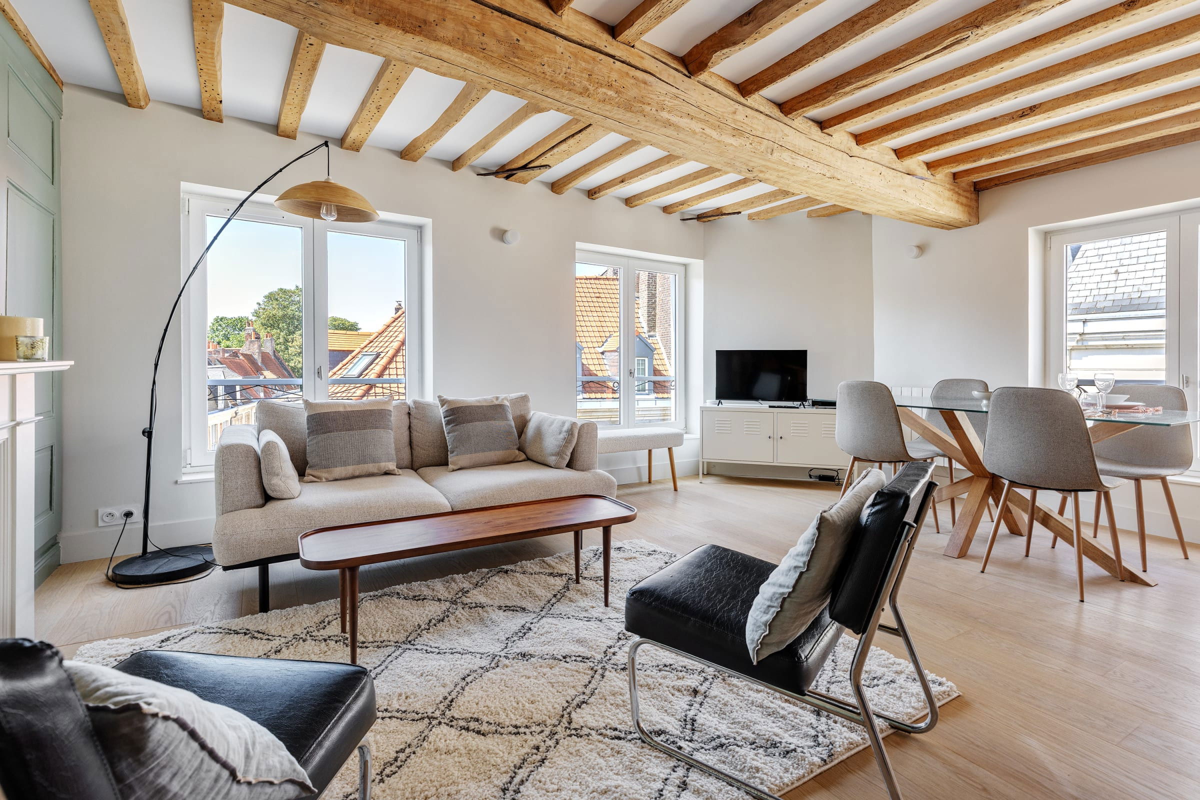 - un espace de vie ouvert, comprenant un salon, un coin bureau et une salle à manger,