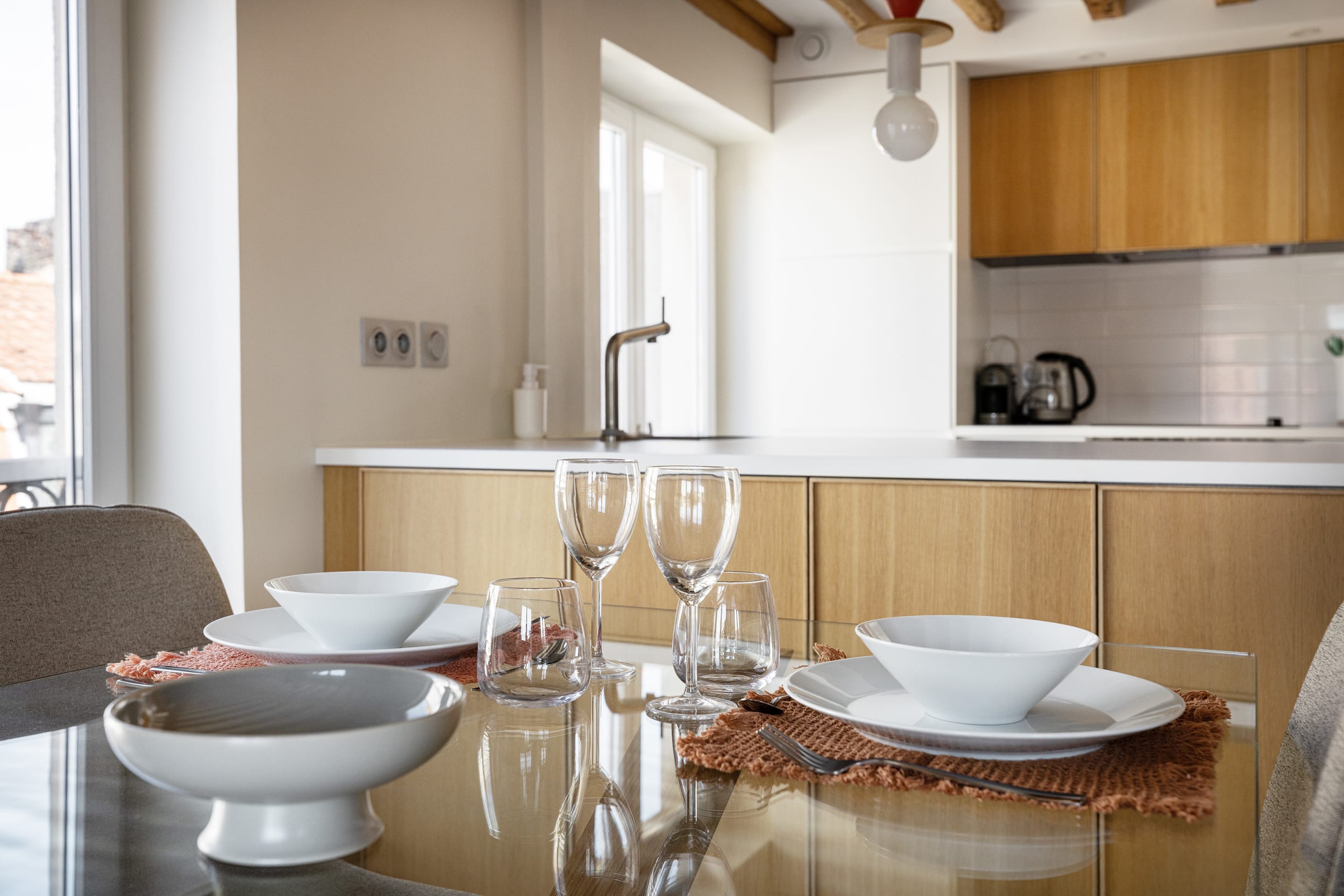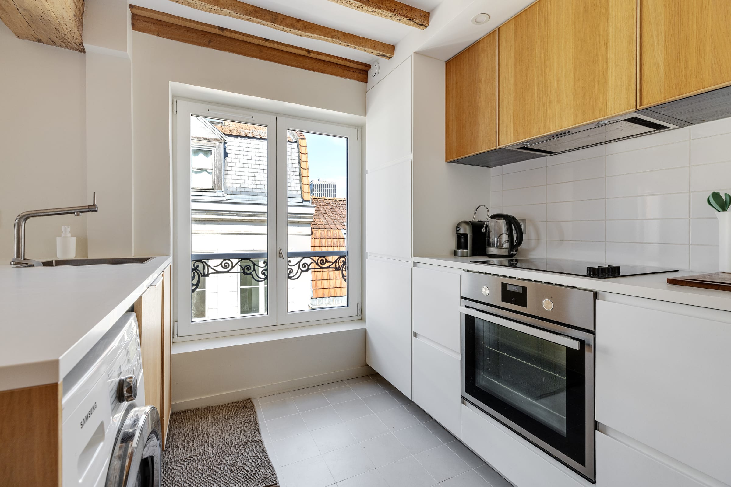 - une cuisine parfaitement équipée (machine à café, bouilloire, four, micro-ondes, plaques de cuisson, lave-vaisselle, réfrigérateur, congélateur),