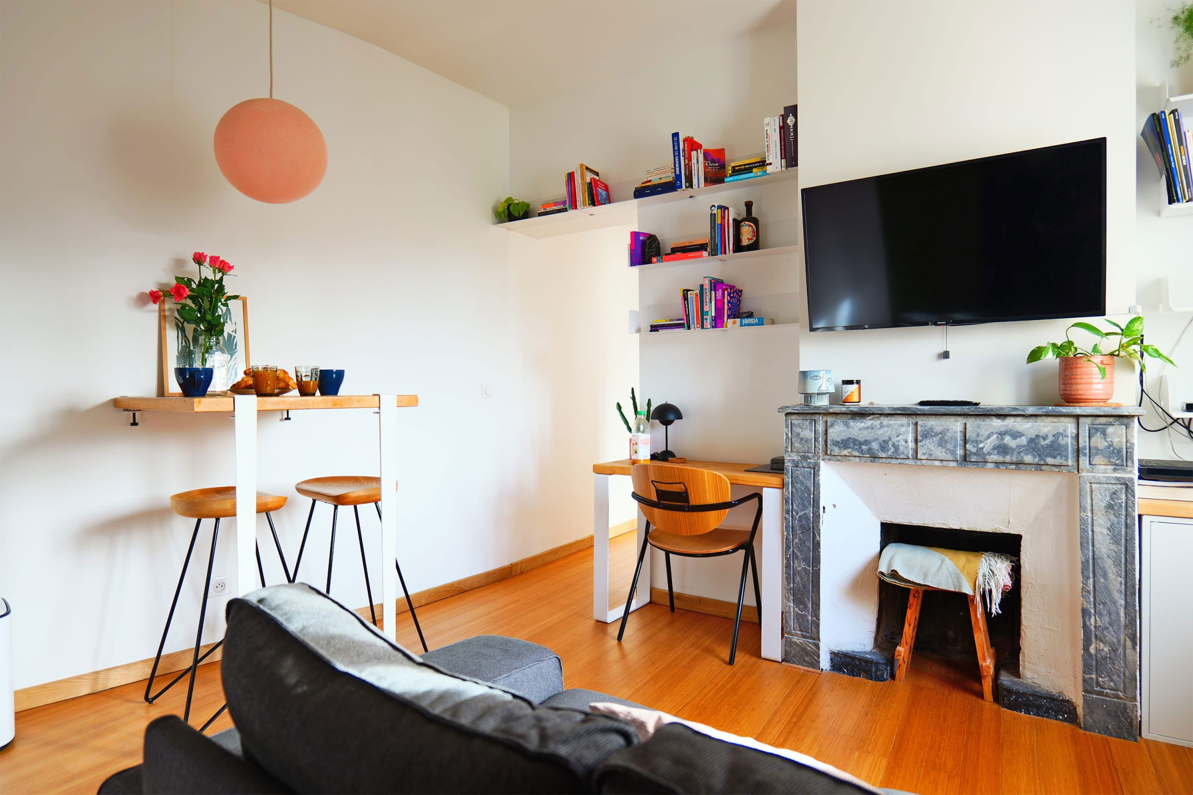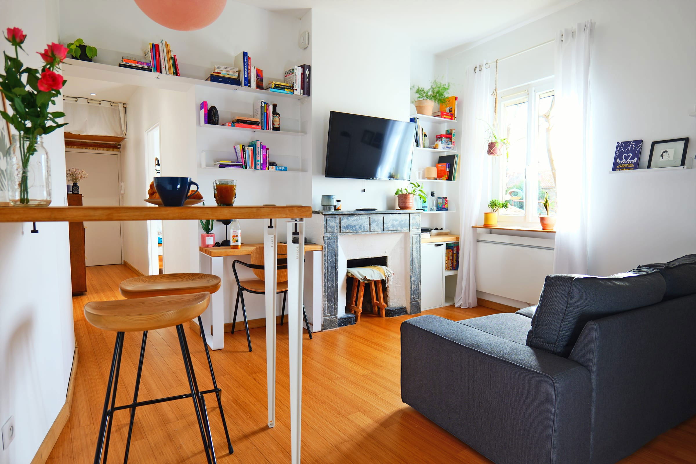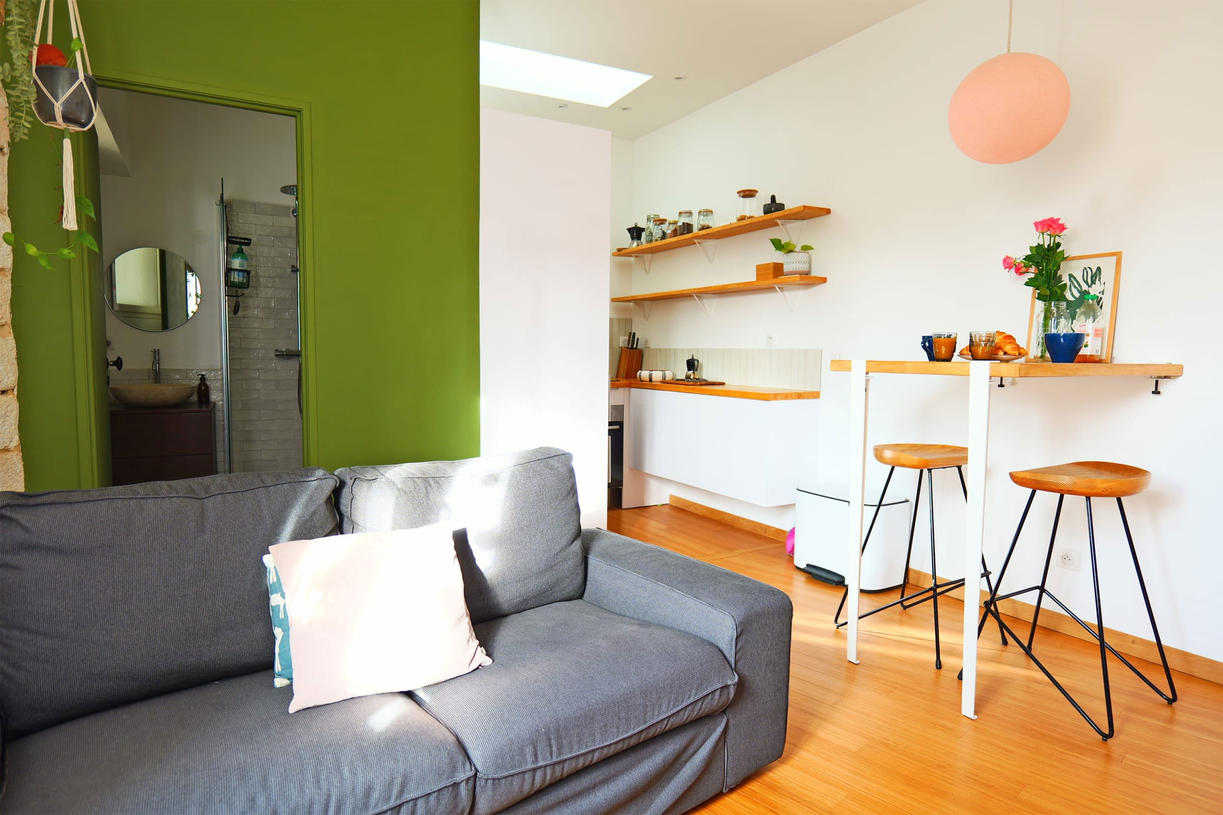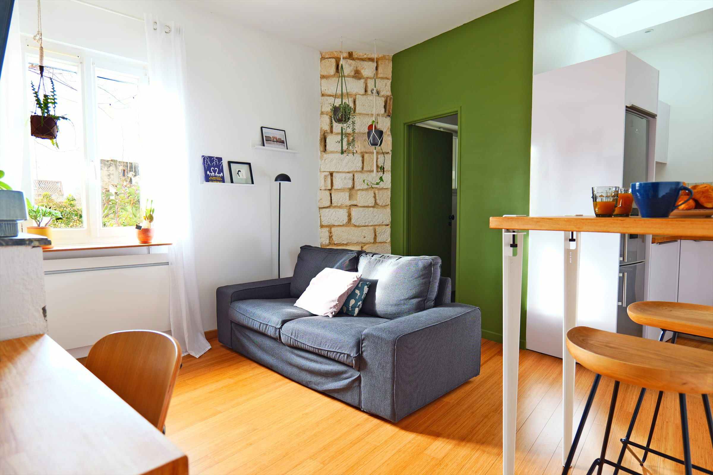 - un salon lumineux et confortable avec un canapé, un espace déjeuner et un coin bureau,