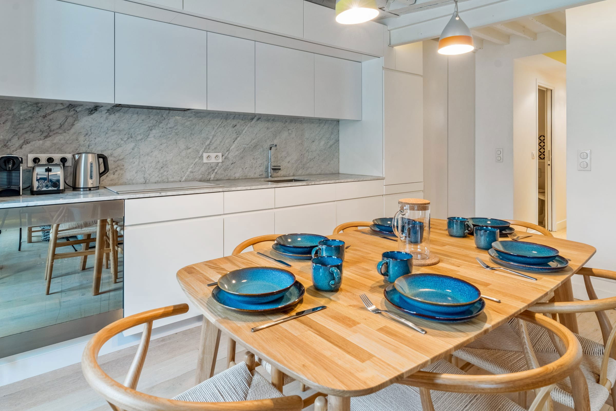 - une cuisine parfaitement équipée (machine à café, bouilloire, grille-pain, four, plaques de cuisson, lave-vaisselle, réfrigérateur, congélateur),