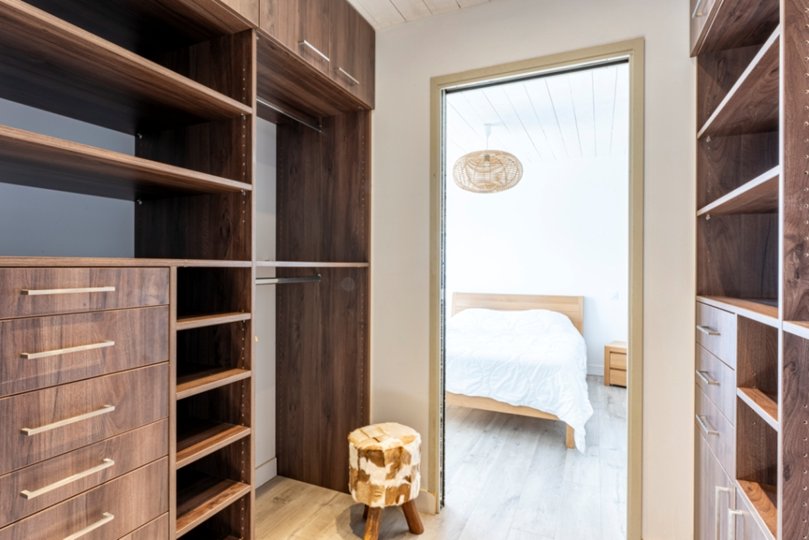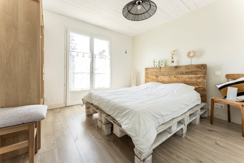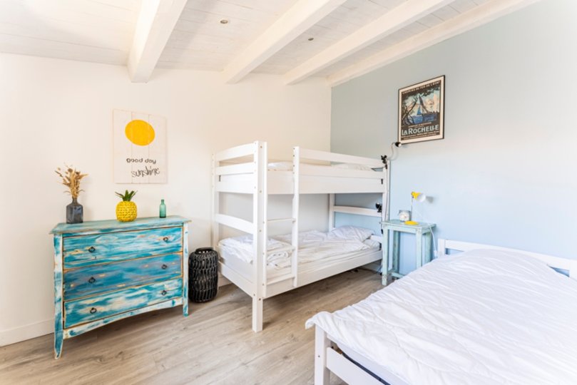 L'espace nuit s'articule avec 4 chambres : 1 chambre double avec salle de bain attenante, une chambre double, une chambre avec 2 lits simples et une chambre "enfants" avec lits superposés et lit simple, ainsi que 2 salles d'eau.