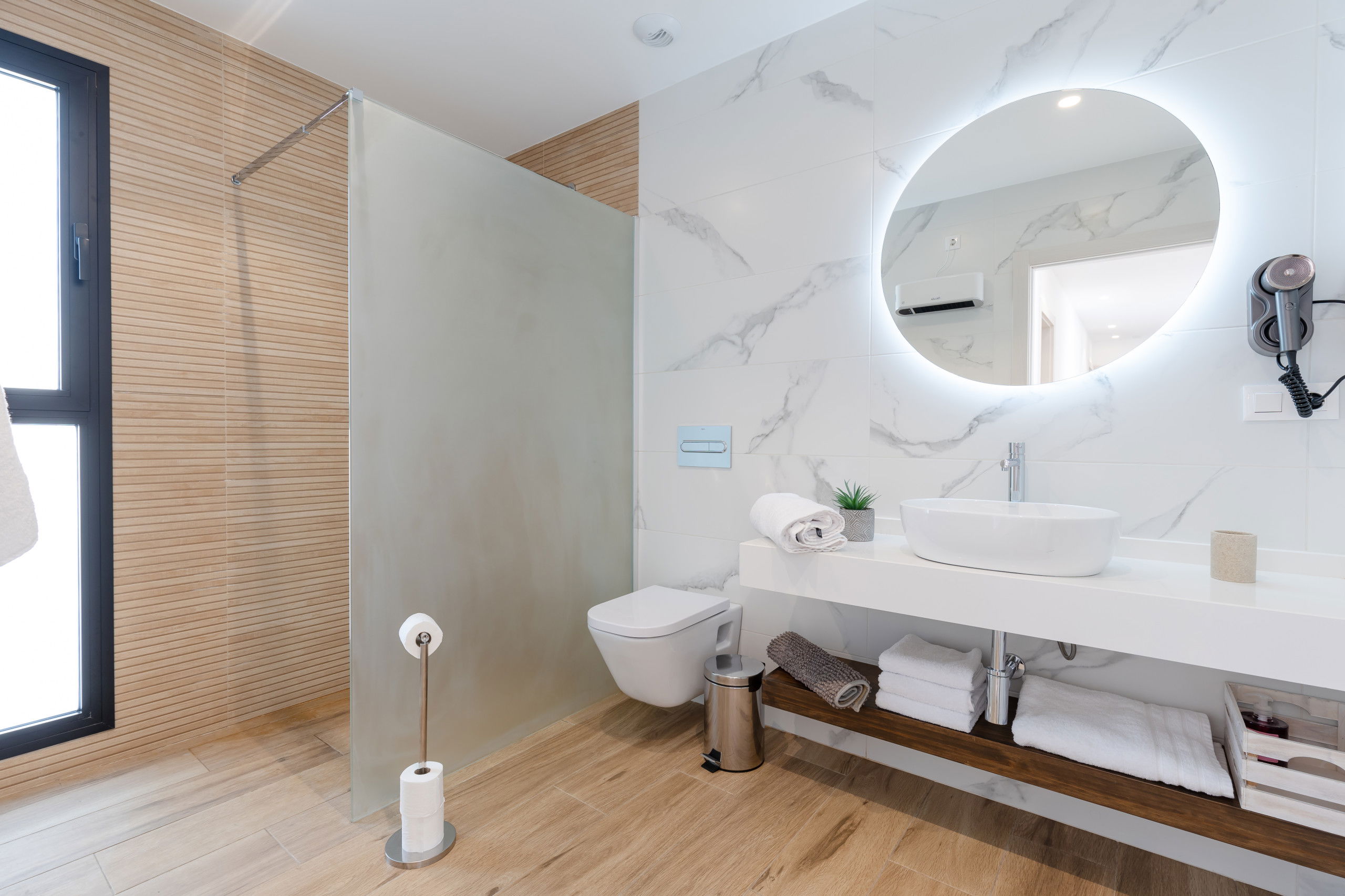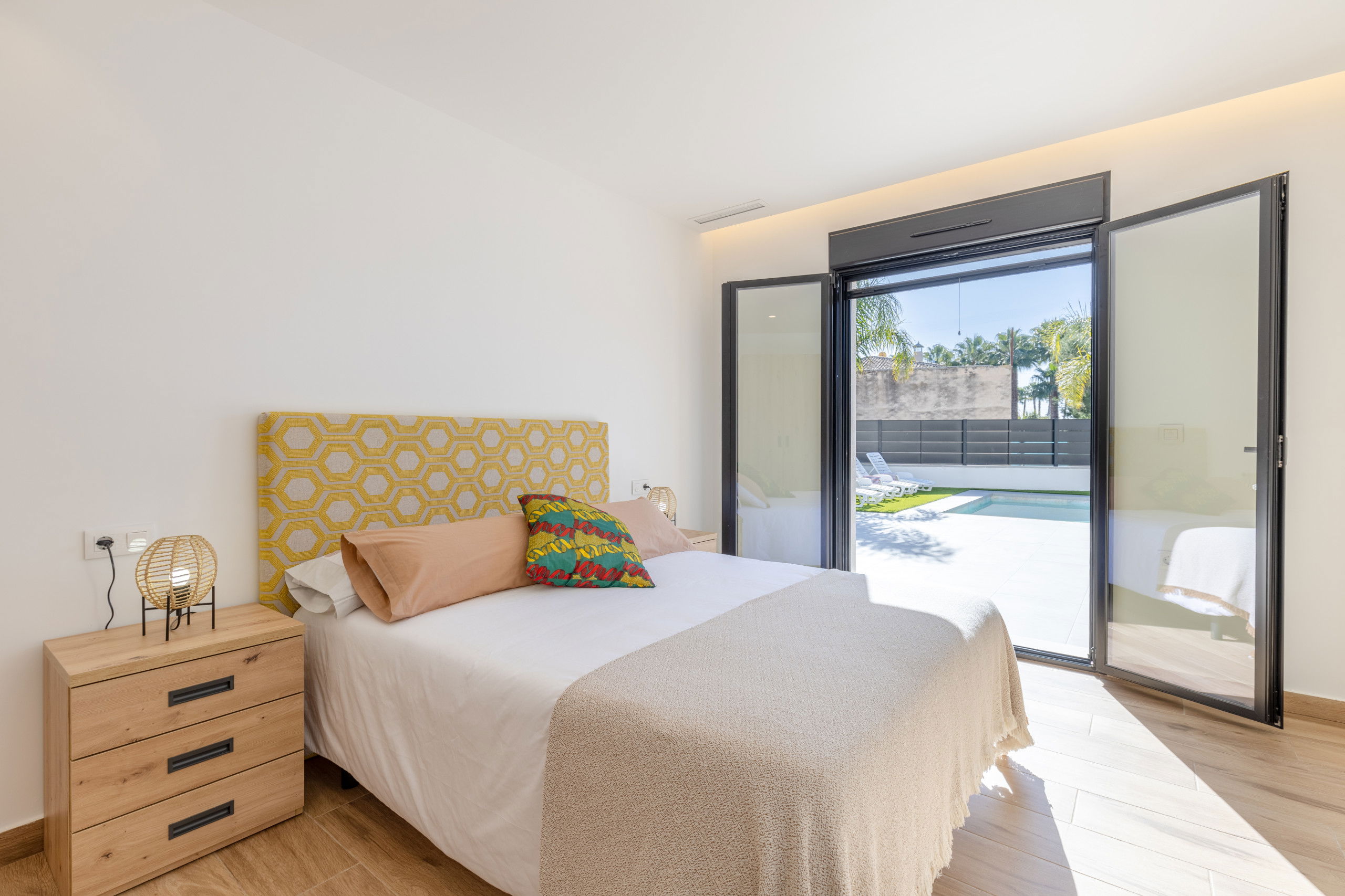 3 chambres au rez-de-chaussée, avec 2 salles de bain avec douche et 2 chambres au premier étage avec 1 salle de bain avec 2 douches, plus un WC à côté de la piscine