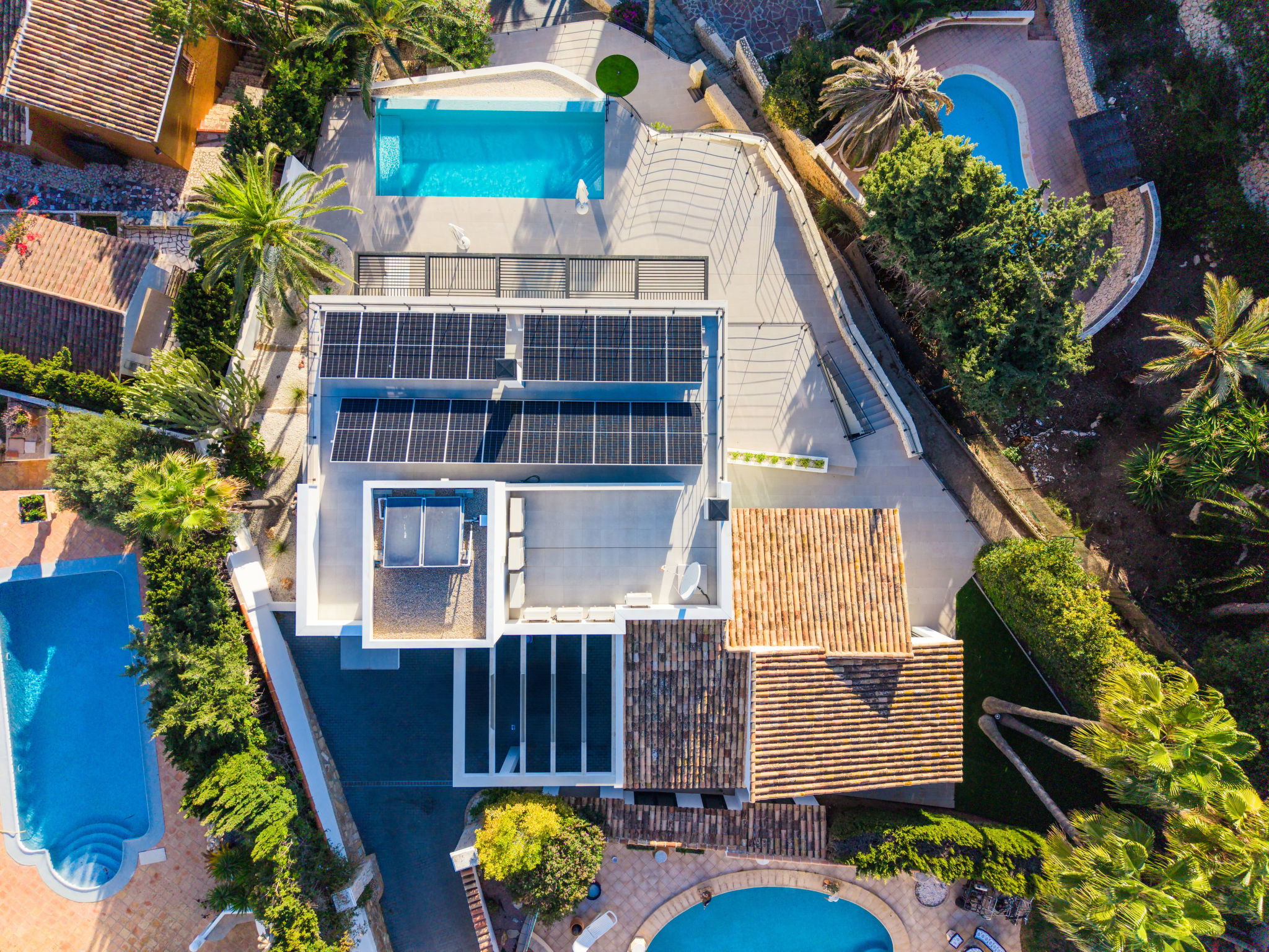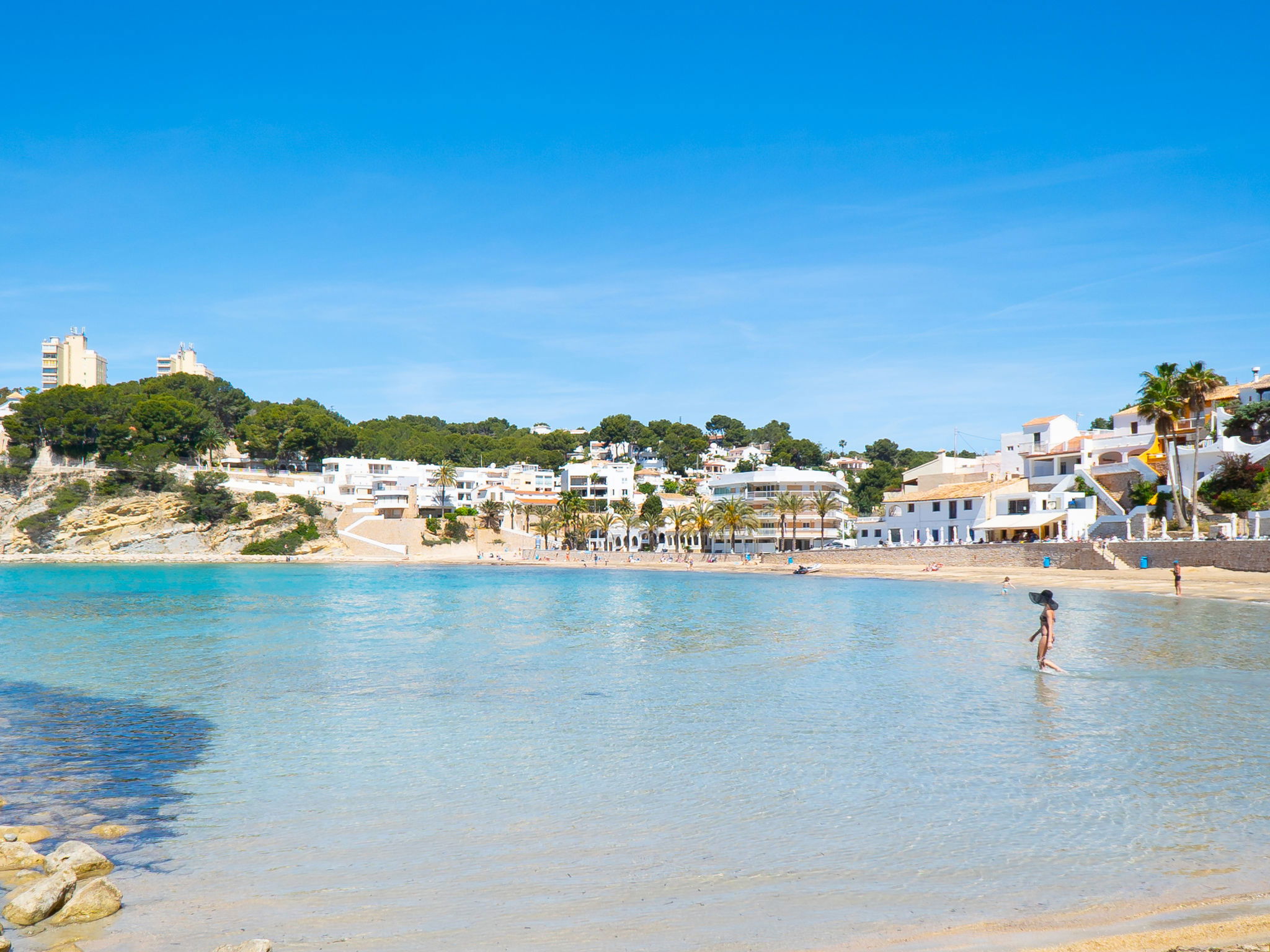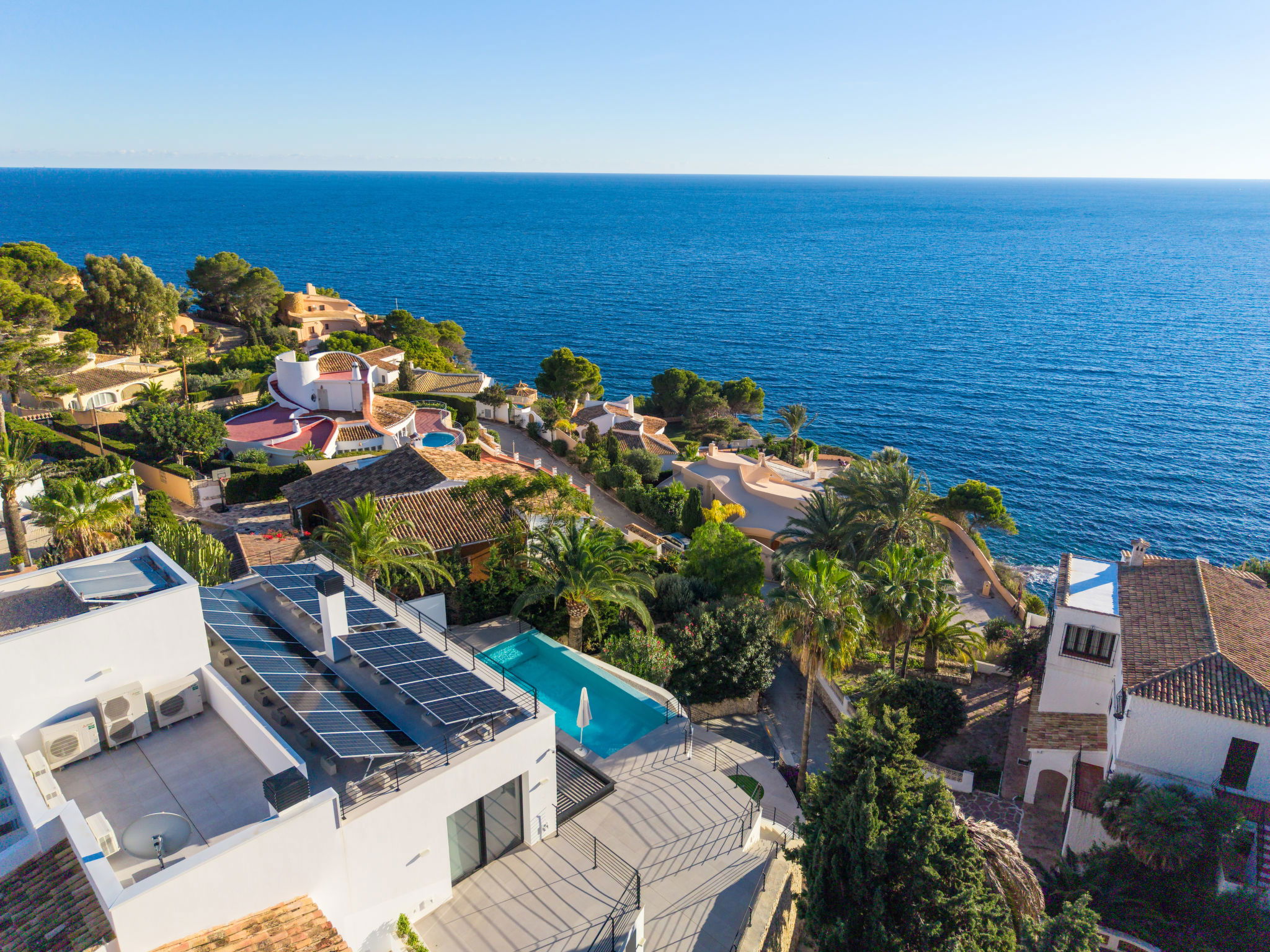 Belle villa moderne "Cabo de Gata", de 3 étages. À 3 km du centre de Moraira, à 11 km du centre de Calpe, situation tranquille, ensoleillée quartier résidentiel, zone avec peu de trafic, à 150 m de la mer, à 150 m de la plage. A usage privé: terrain (clôturé), jardin entretenu, piscine (9 x 4 m, disponibilité saisonnière: 01.Jan. - 31.Dec.). Douche extérieure, terrasse, meubles de jardin, barbecue. Infrastructures de la Maison: terrasse sur le toit, lave-linge, sèche-linge. Place de parking sur le terrain. Magasin d'alimentation, supermarché 750 m, restaurant 650 m, arrêt de bus 750 m, plage de sable "Playa L'Ampolla" 3 km, plage de rochers "Cala Punta Estrella", crique pour baignade 140 m. Port plaisance 4 km, marina 4 km, terrain de golf (18 trous) 2 km. Attractions à proximité: Aqualandia, Mundomar, Terra Mítica, Terra Natura, Benidorm Palace (Benidorm), Les Fonts de l'Algar, Castillo de Guadalest. Veuillez noter: adapté(e) aux familles. Le propriétaire n'accepte pas les groupes de jeunes.