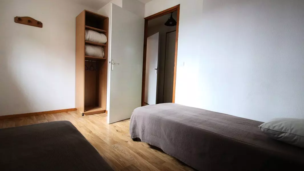 - Couchages : une chambre avec lit double neuf (160x190), une chambre avec deux lits simples (matelas neuf 80x190) et étagères de rangement. Lits équipés de couettes et oreillers 60x60.