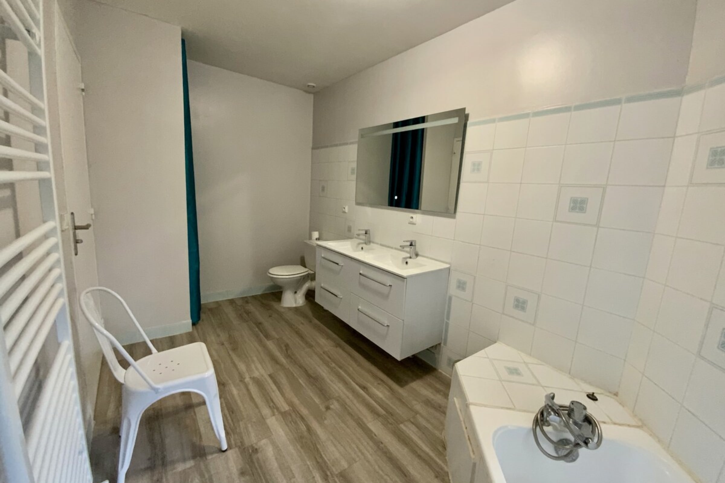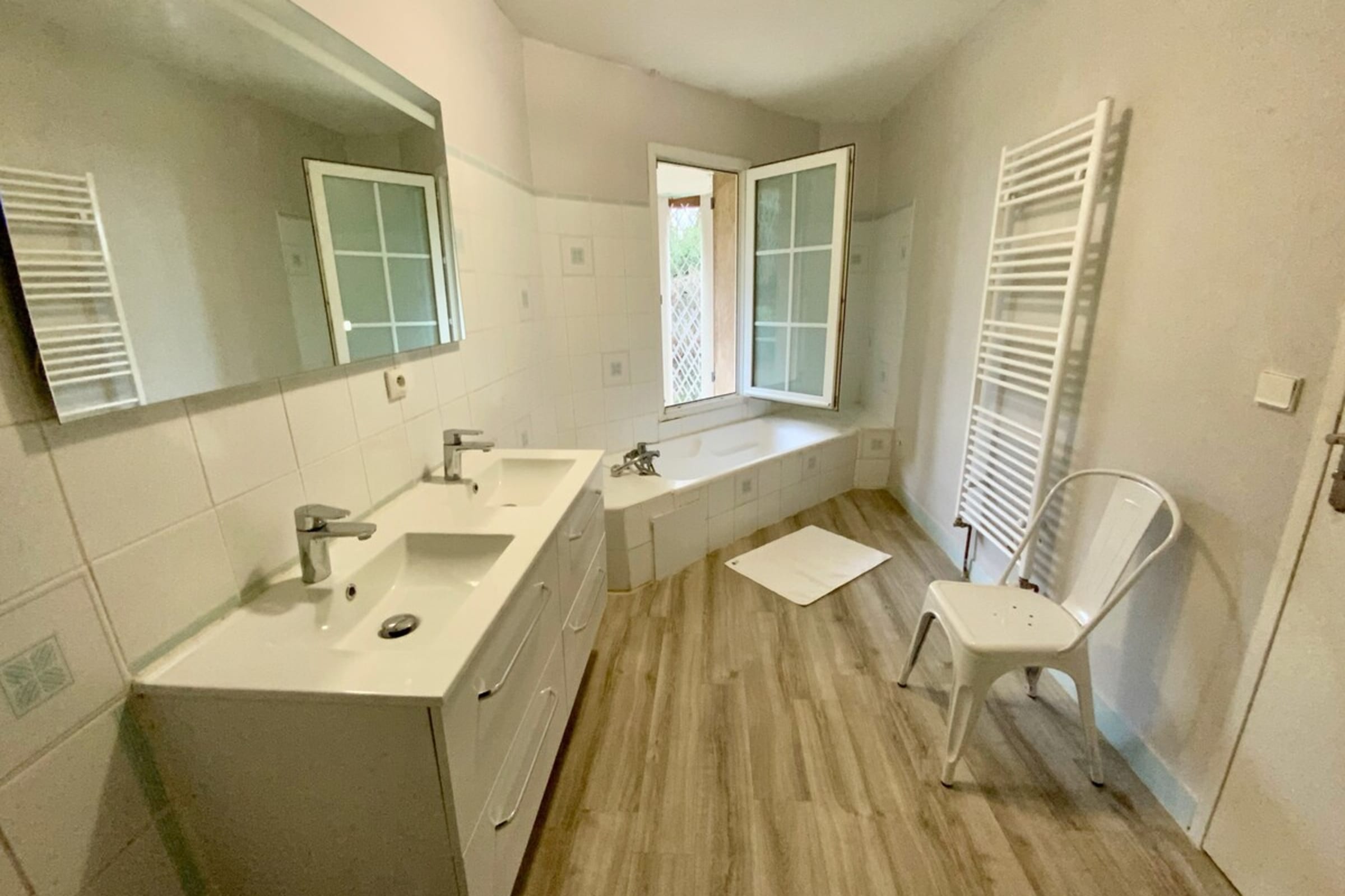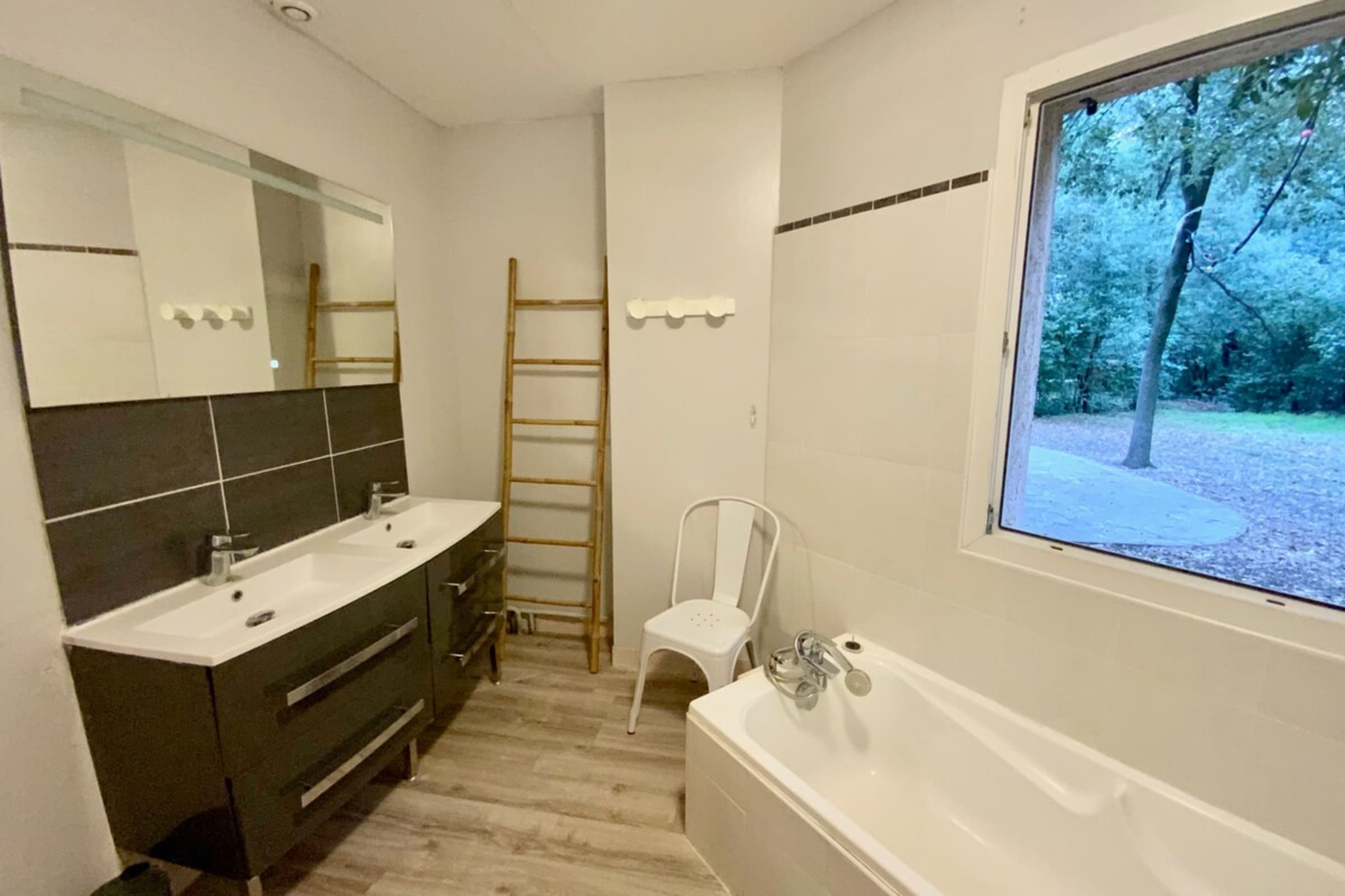 - 1 chambre parental avec lit en 160 et salle de bain avec double vasque, WC et baignoire.