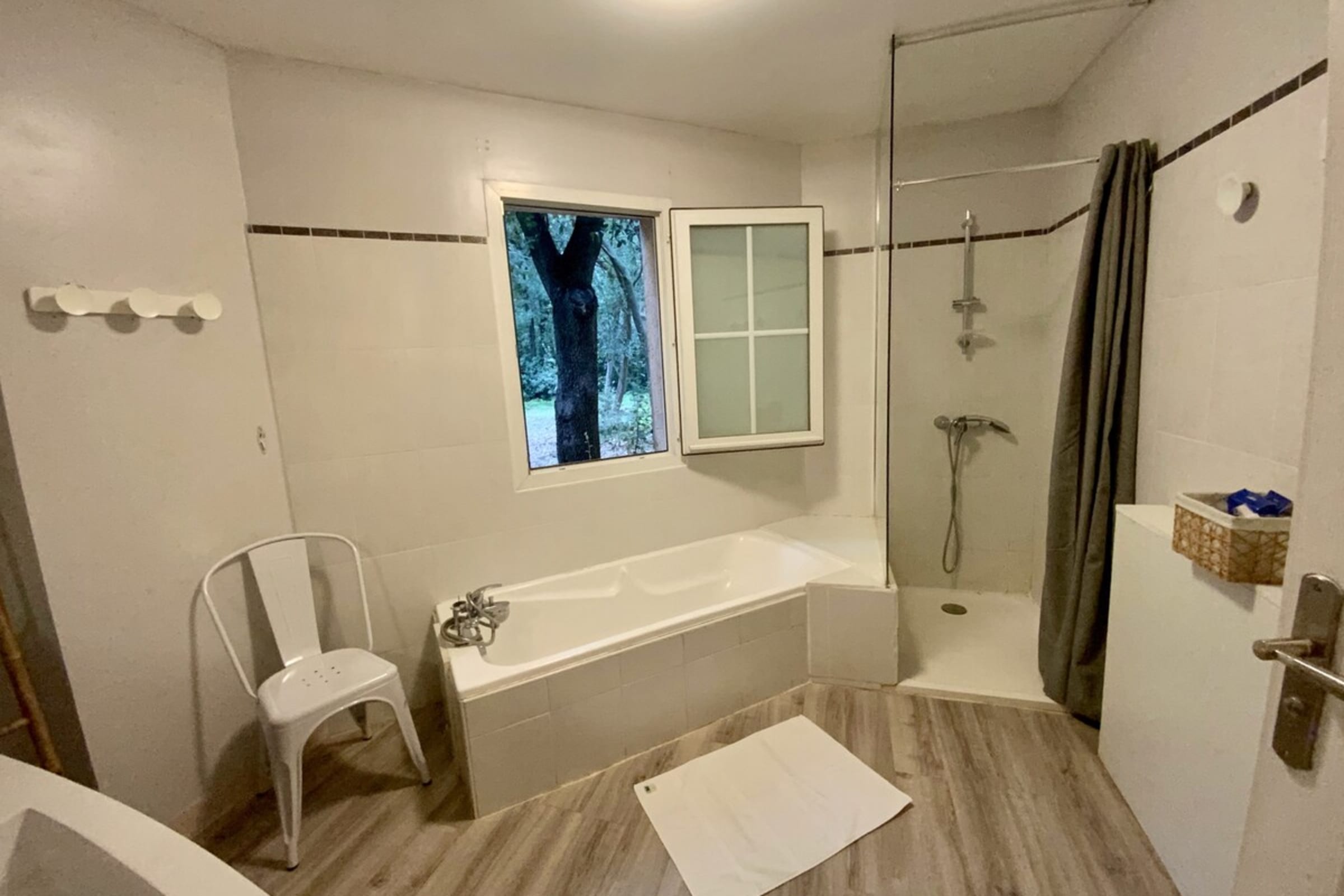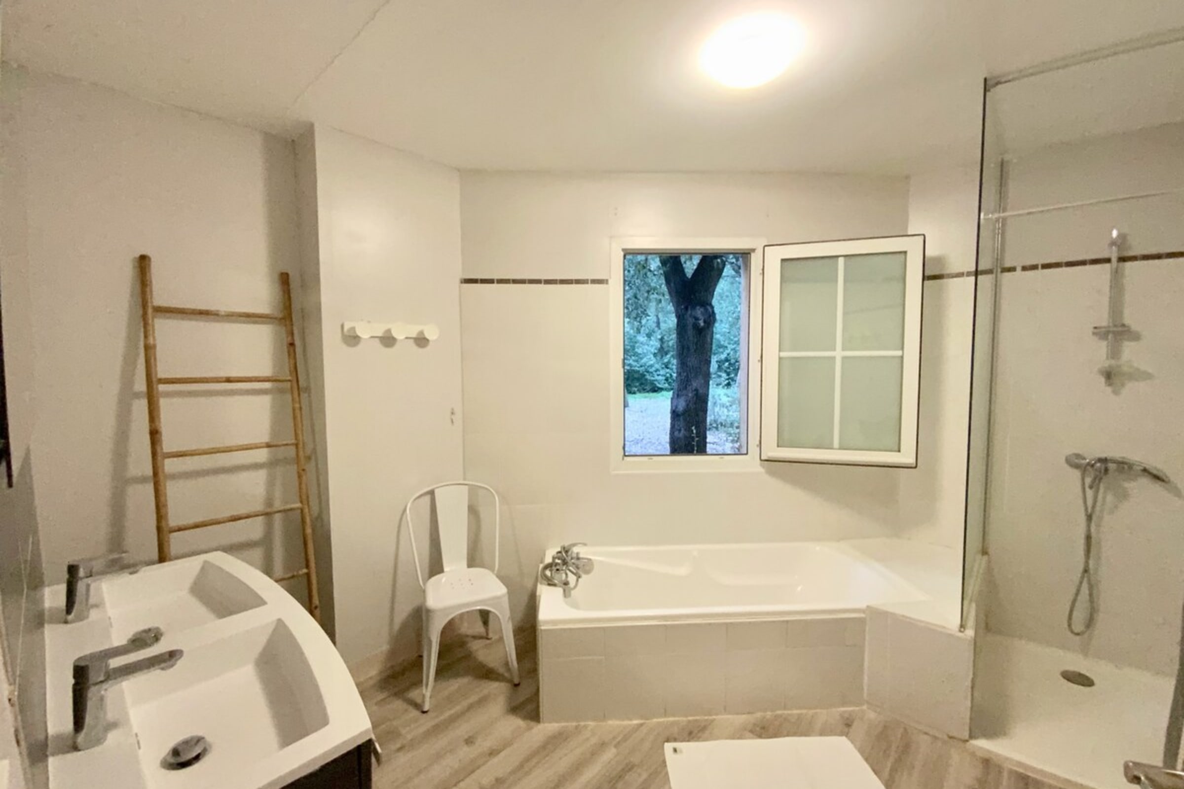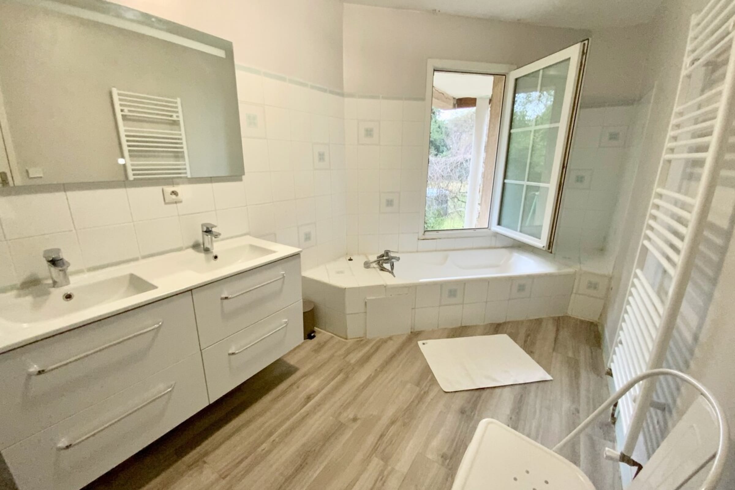 - 1 chambre parental avec lit en 160 et salle de bain avec double vasque, WC et baignoire.