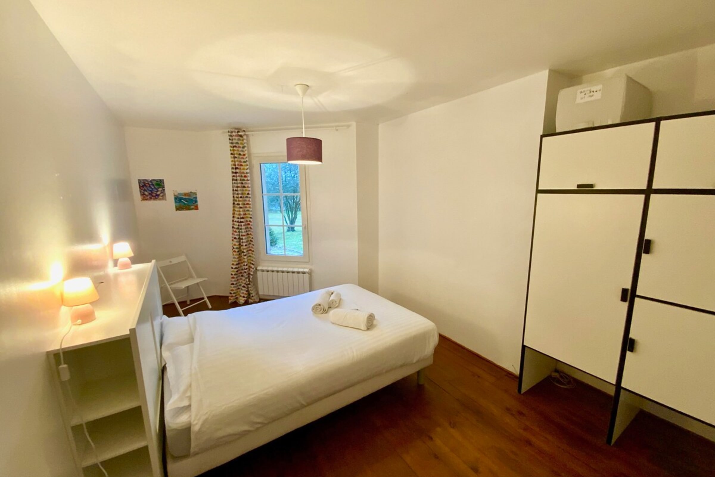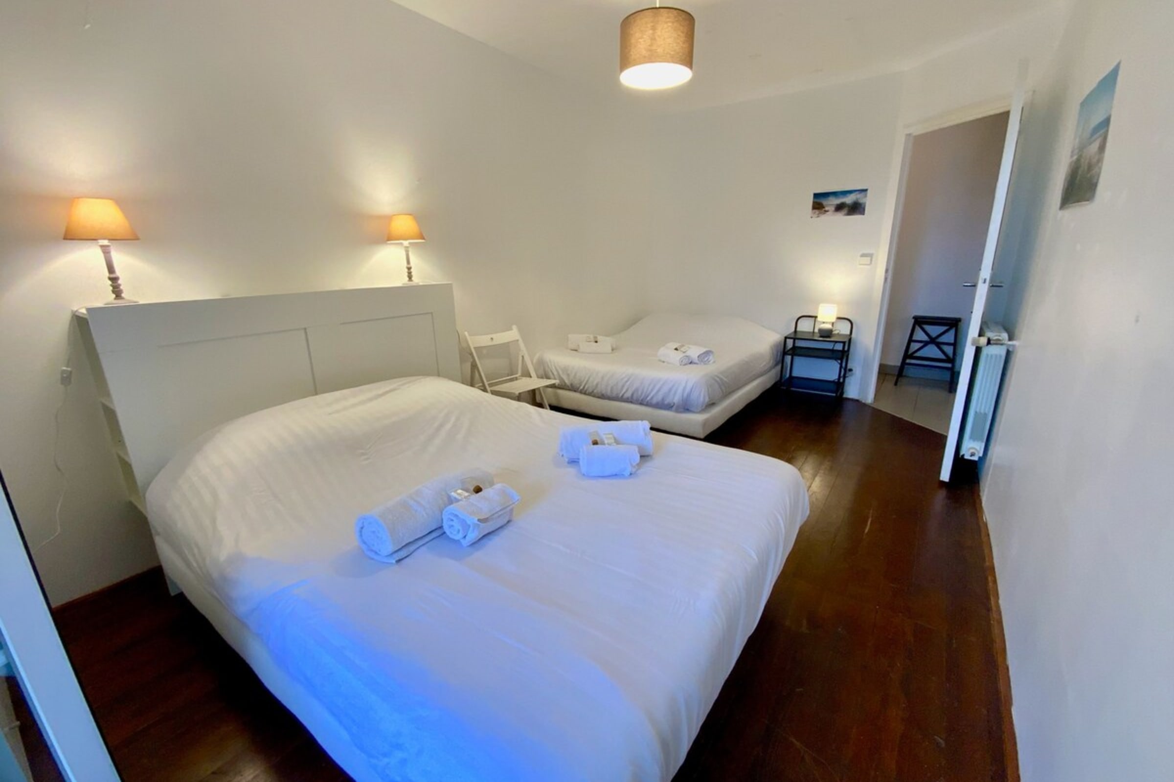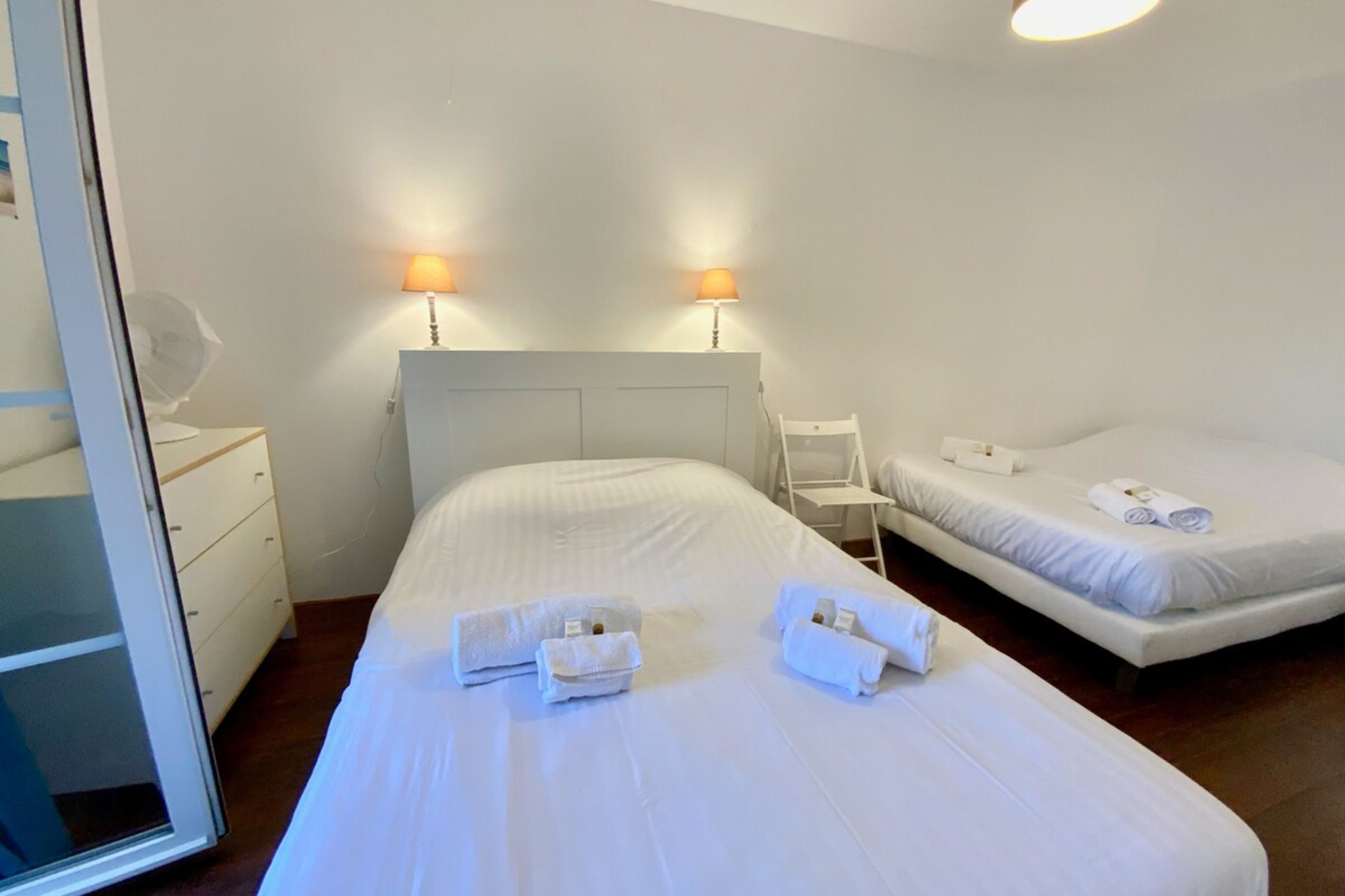 - 1 chambre avec 2 lits doubles, placard de rangement et ventilateur