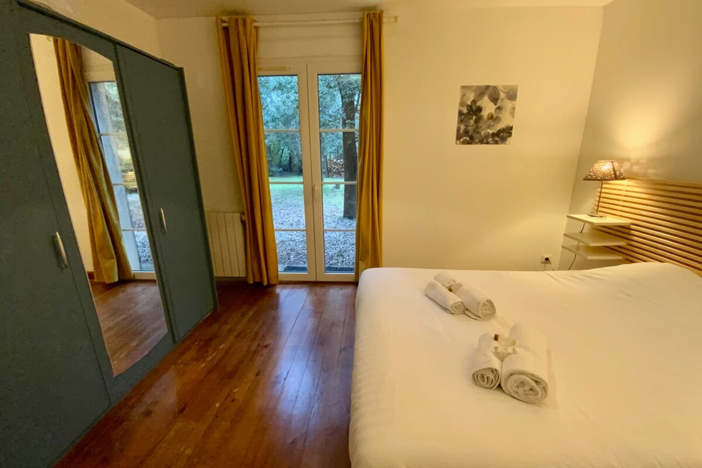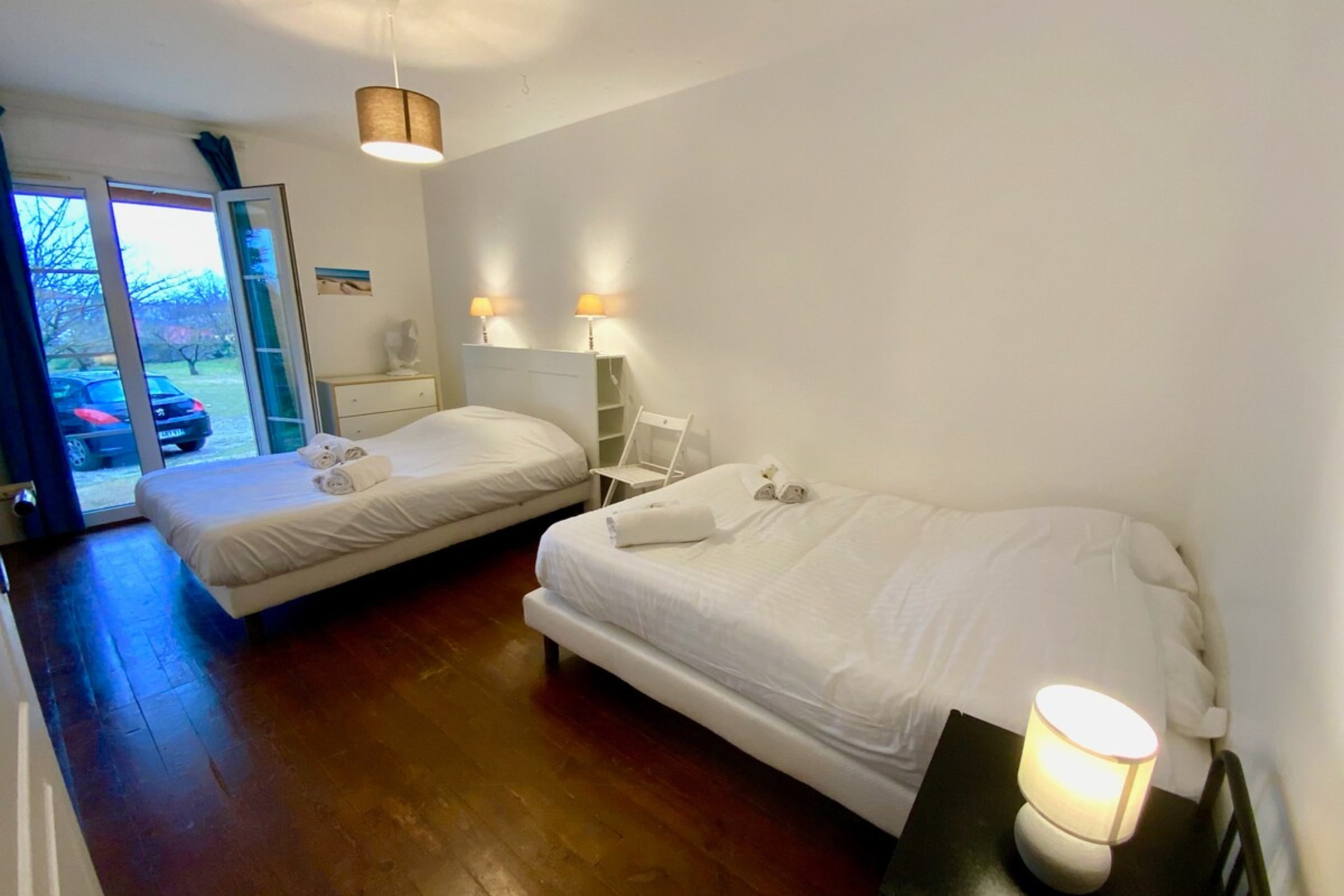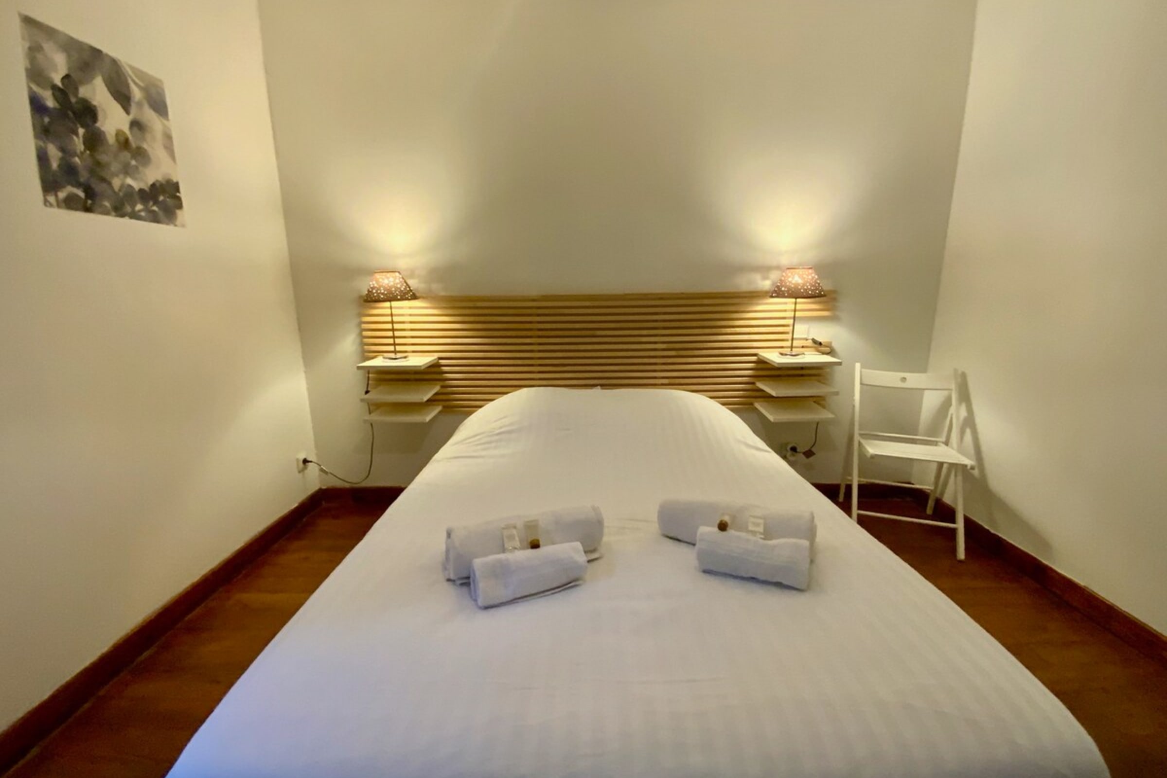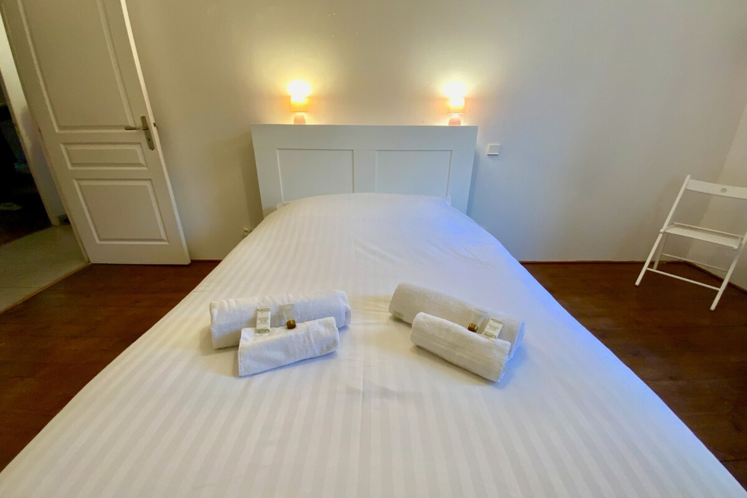 - 1 chambre avec 2 lits doubles, placard de rangement et ventilateur