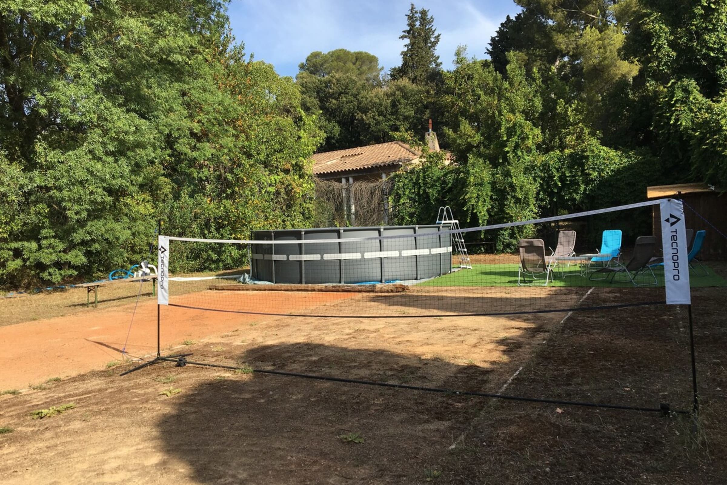 Terrain de pétanque , jeux de ballon avec filet pour badminton (Jeux de cartes etc , boules de pétanque, ballons et raquettes à disposition )