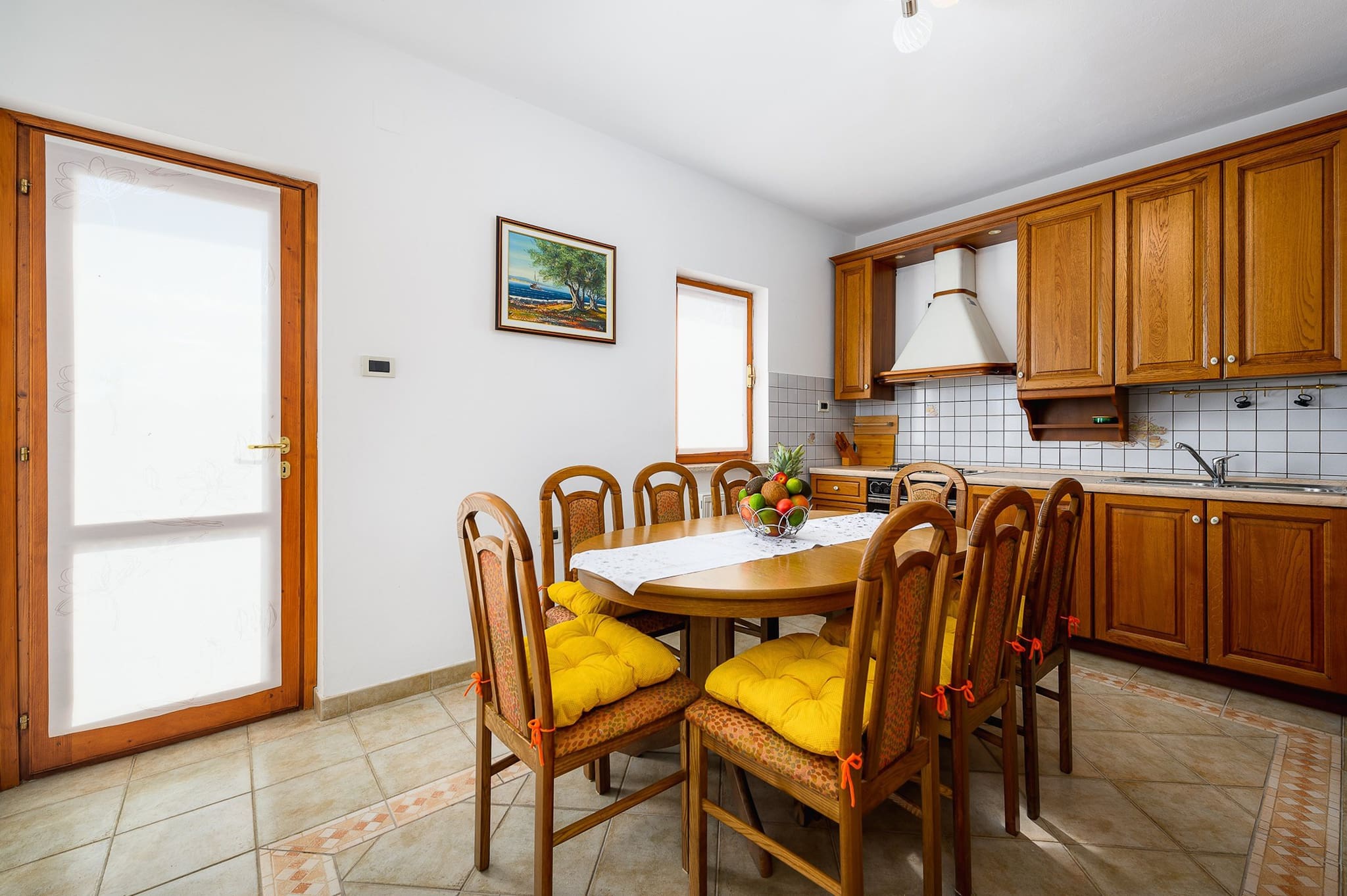 Logement de 120 m² accueillant et cuisine totalement équipée, avec vue sur le jardin et la piscine.