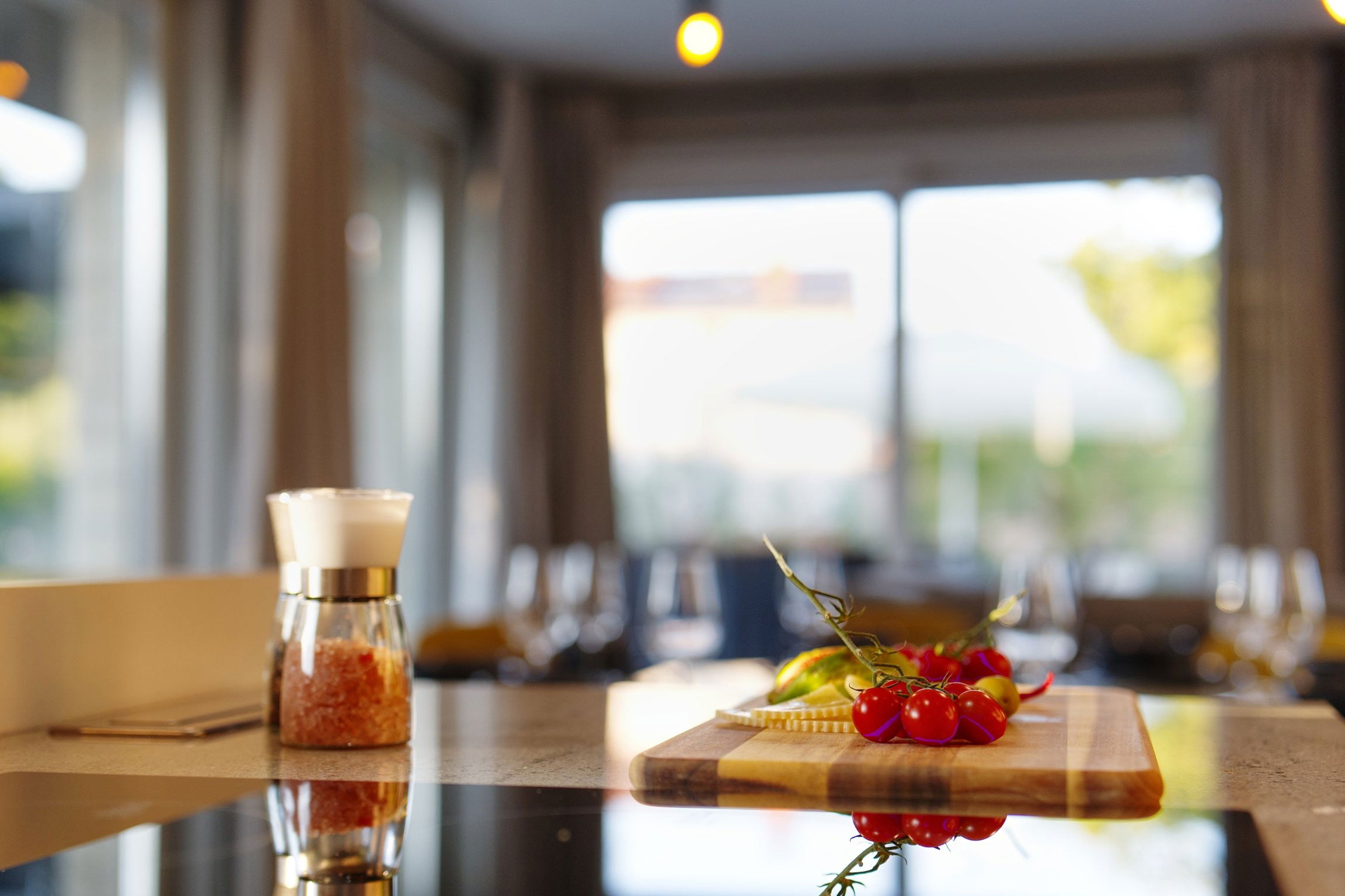 La cuisine américaine, à induction, est équipée avec réfrigérateur, micro-ondes, four, congélateur, lave-vaisselle, vaisselle/couverts, ustensiles/cuisine, cafetière, grille pain, bouilloire, cuisinière, equipement de cuisine, assiettes et bols.