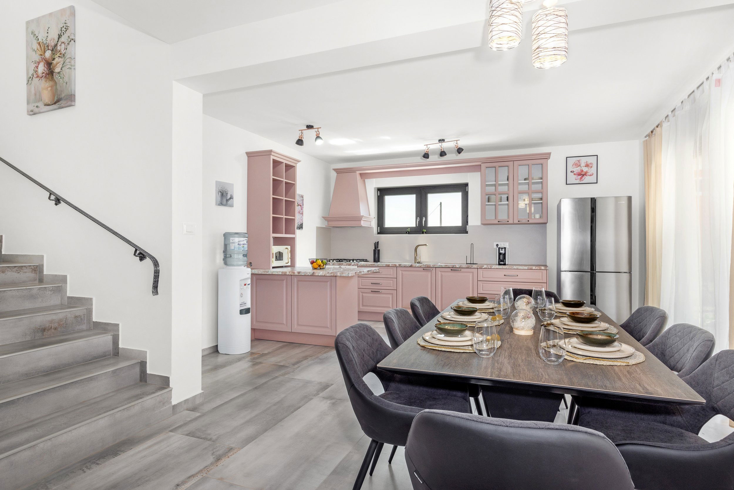 La cuisine américaine, à induction, est équipée avec réfrigérateur, micro-ondes, four, congélateur, lave-vaisselle, vaisselle/couverts, ustensiles/cuisine, cafetière, grille pain, bouilloire, cuisinière, equipement de cuisine, assiettes et bols.