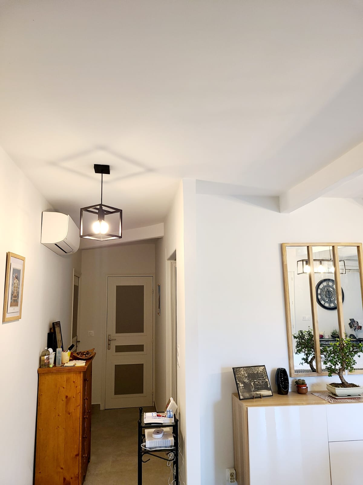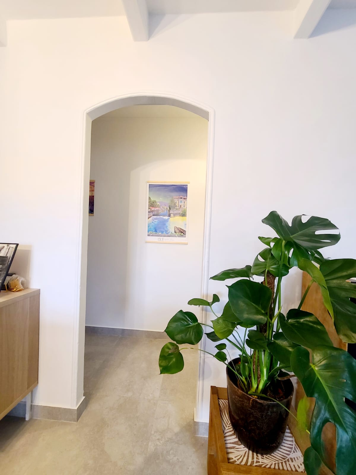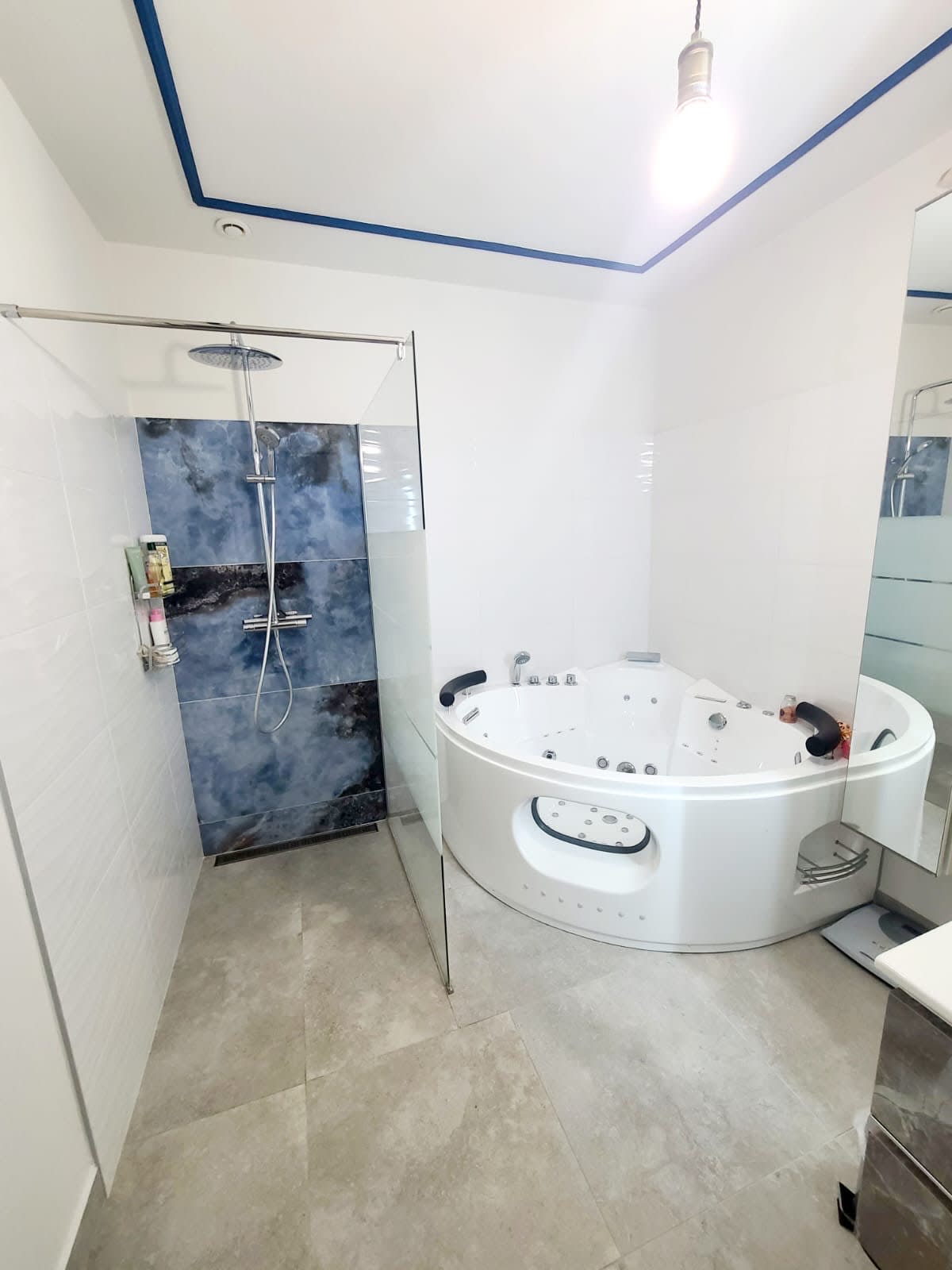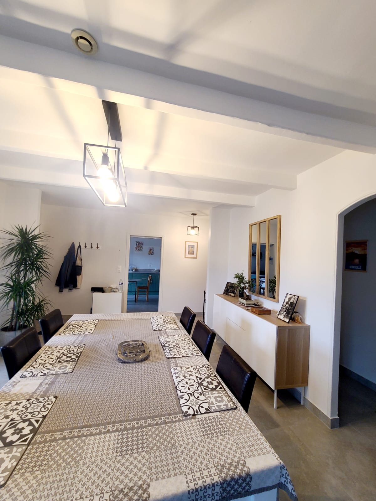La maison comprend également une salle d’eau avec douche et baignoire, un WC séparé et trois chambres doubles confortables. La climatisation, intelligemment placée à l’entrée du couloir, permet de rafraîchir l’ensemble de la maison, assurant un confort optimal même pendant les chaudes journées d’été.