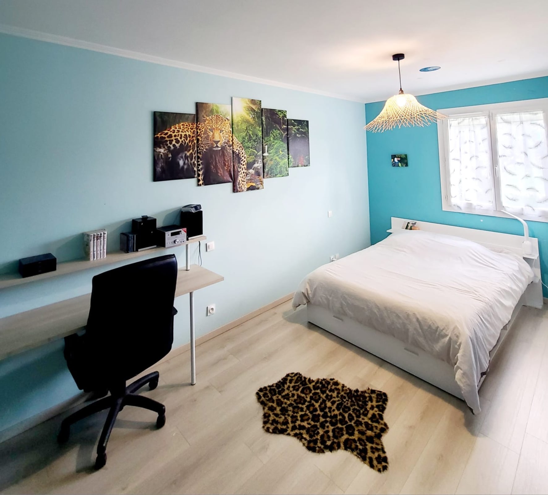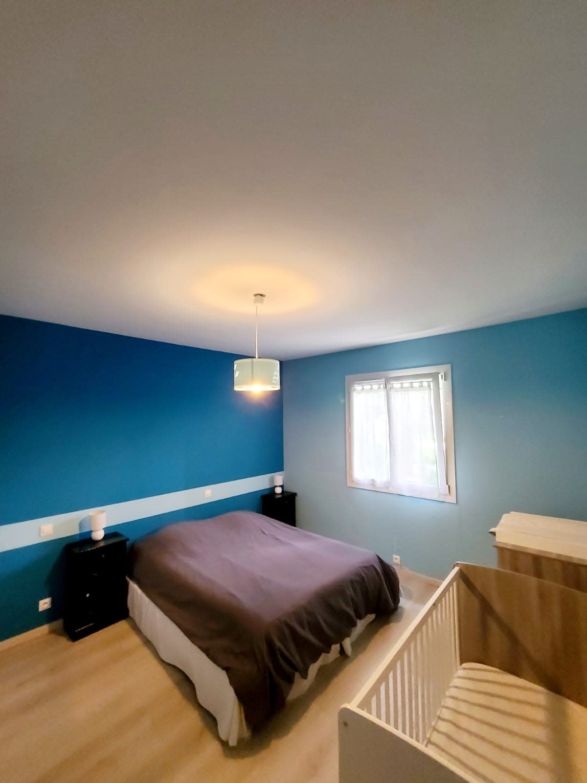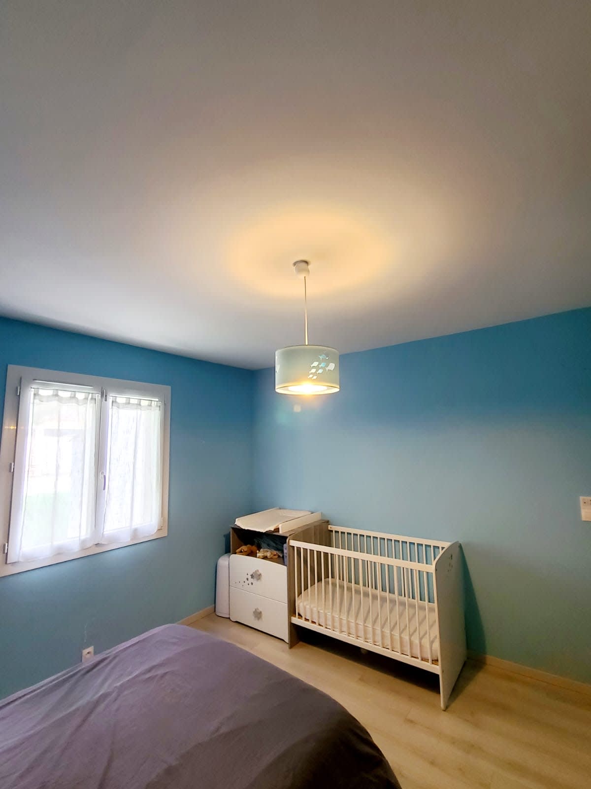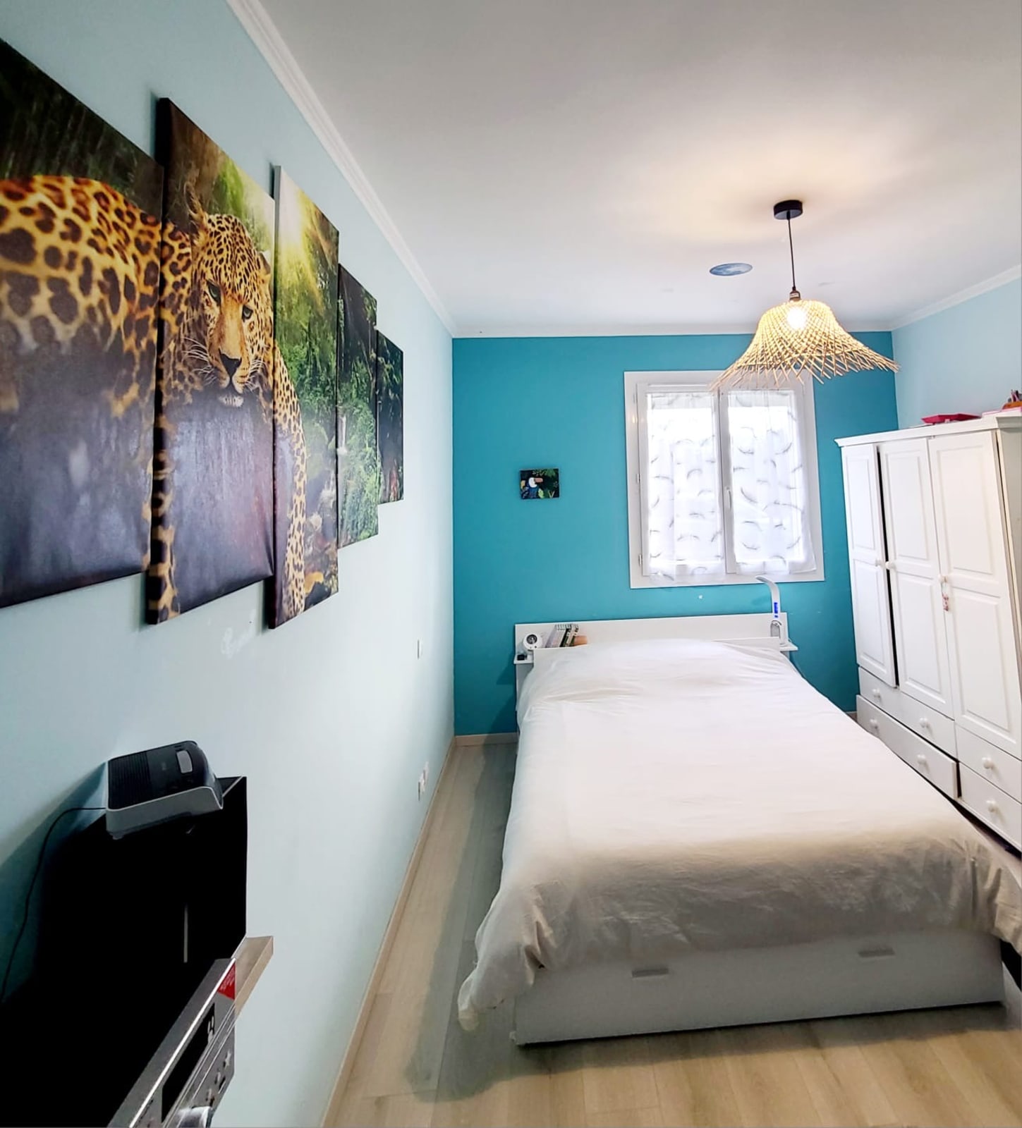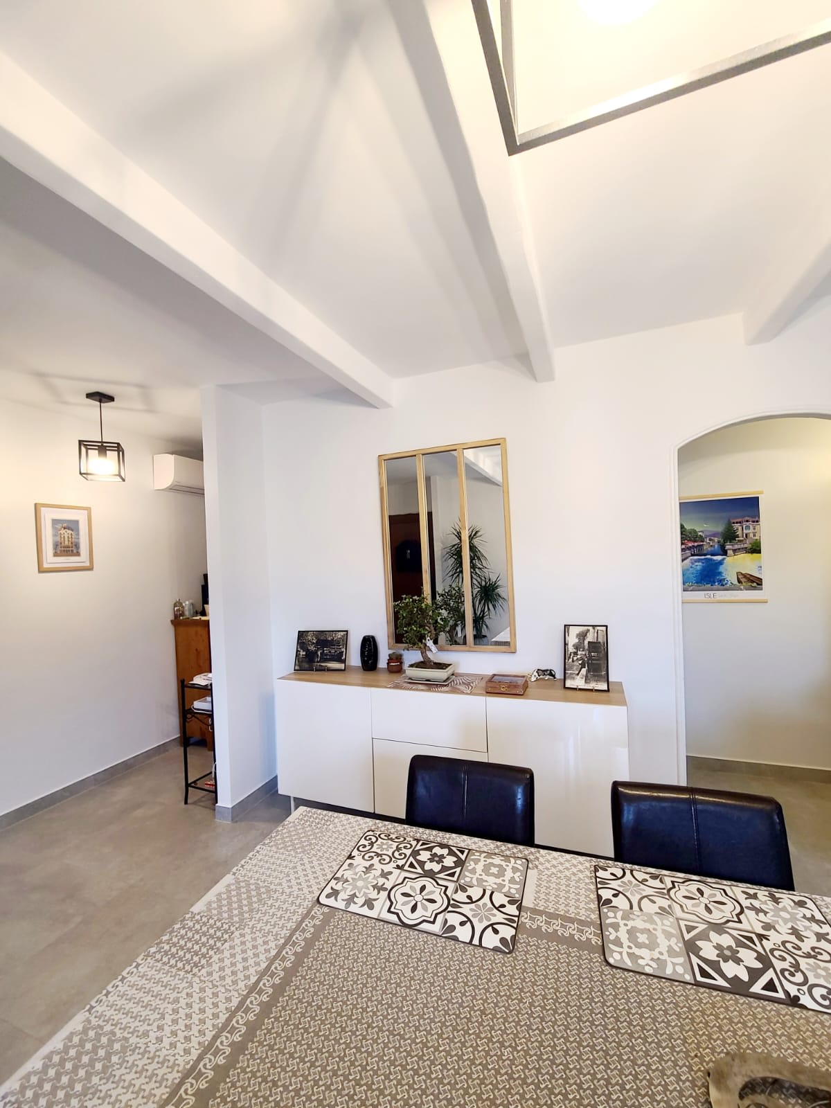 La maison comprend également une salle d’eau avec douche et baignoire, un WC séparé et trois chambres doubles confortables. La climatisation, intelligemment placée à l’entrée du couloir, permet de rafraîchir l’ensemble de la maison, assurant un confort optimal même pendant les chaudes journées d’été.