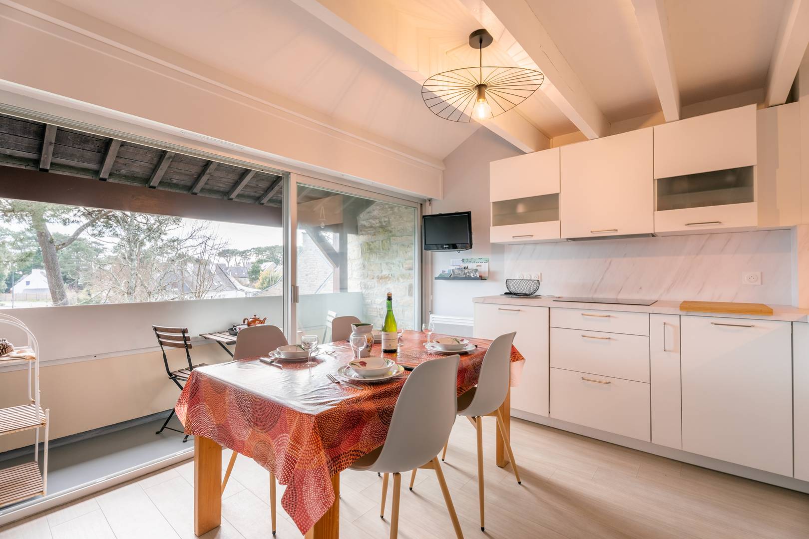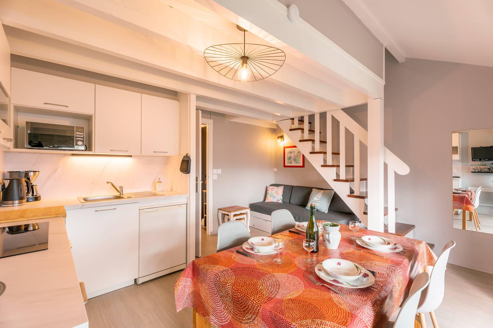 - Cuisine ouverte équipée (plaque induction 3 feux, réfrigérateur/freezer, micro-ondes, lave-vaisselle, lave linge)
