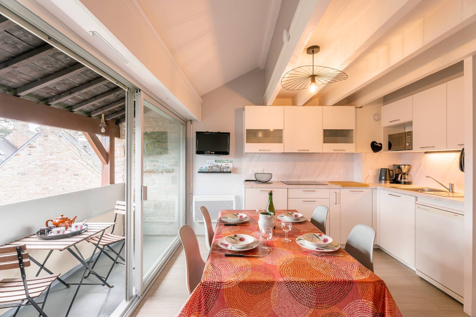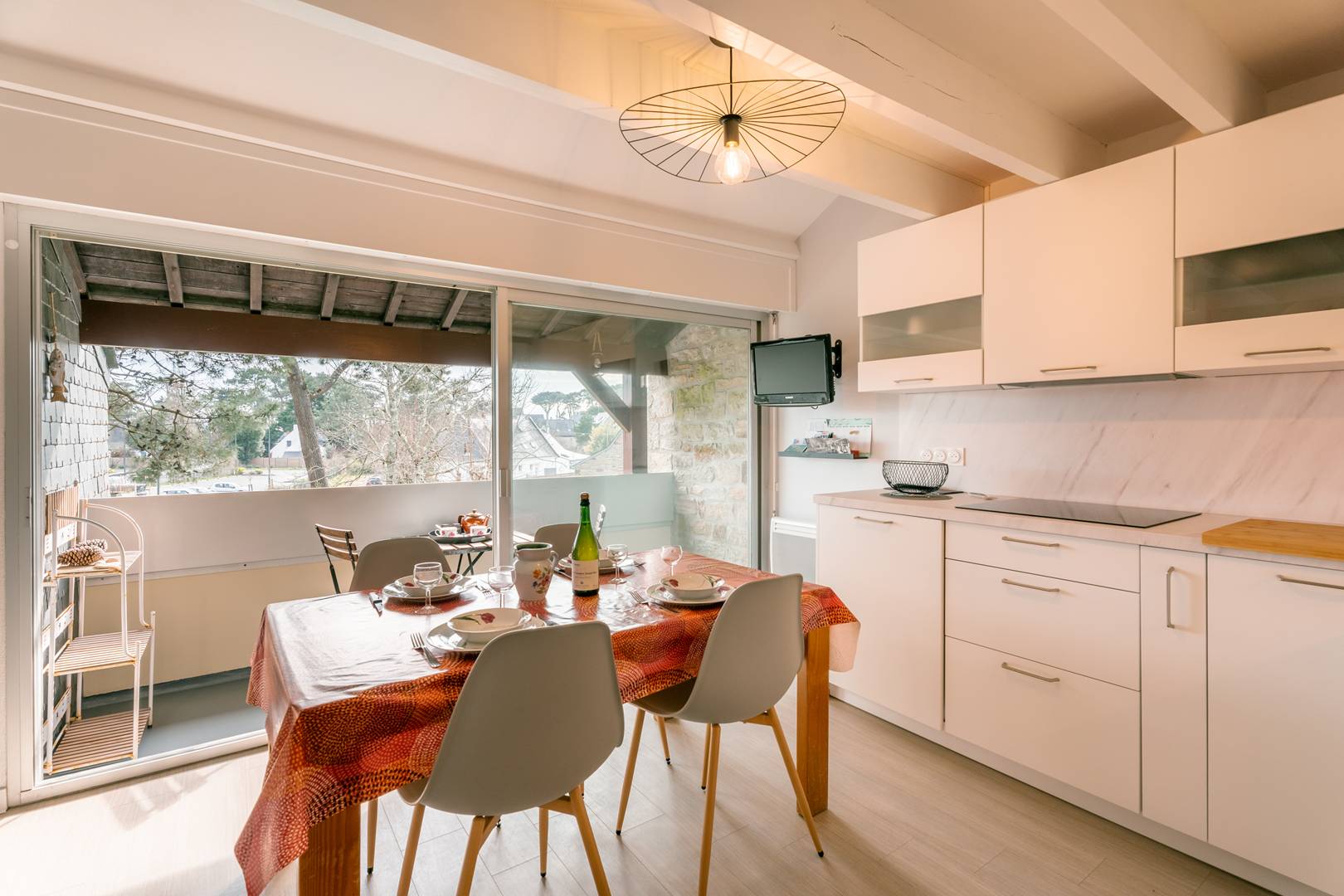 - Séjour avec partie repas (table et chaises) et partie salon (TV, canapé convertible gigogne : 2 couchages en 80, couettes) ouvrant sur la petite loggia orientée Sud (mobilier de jardin)