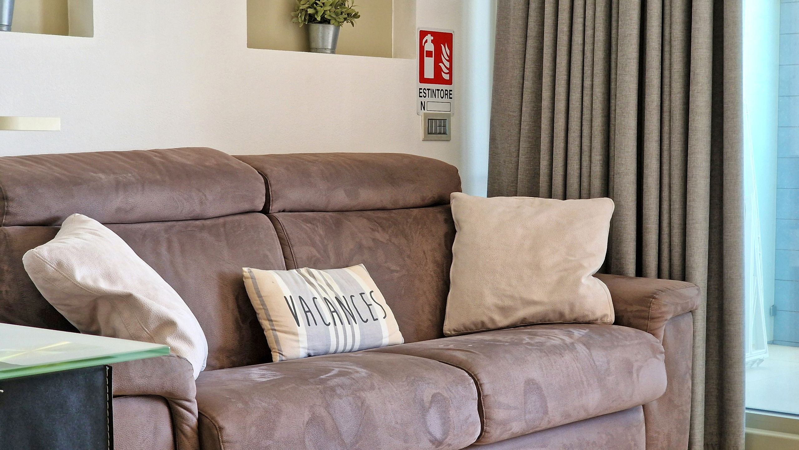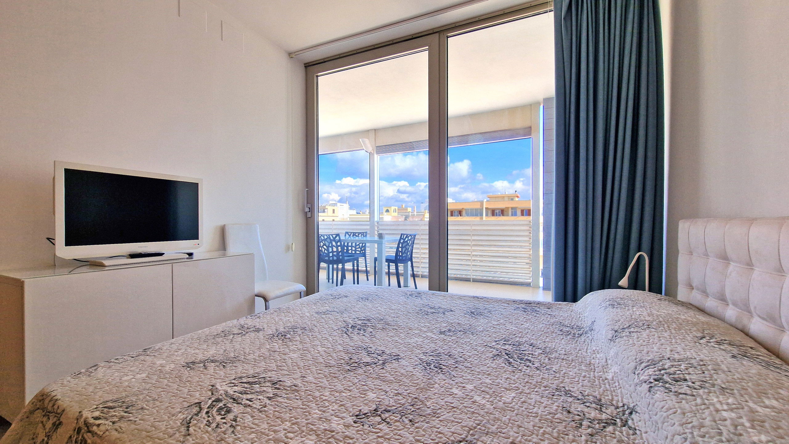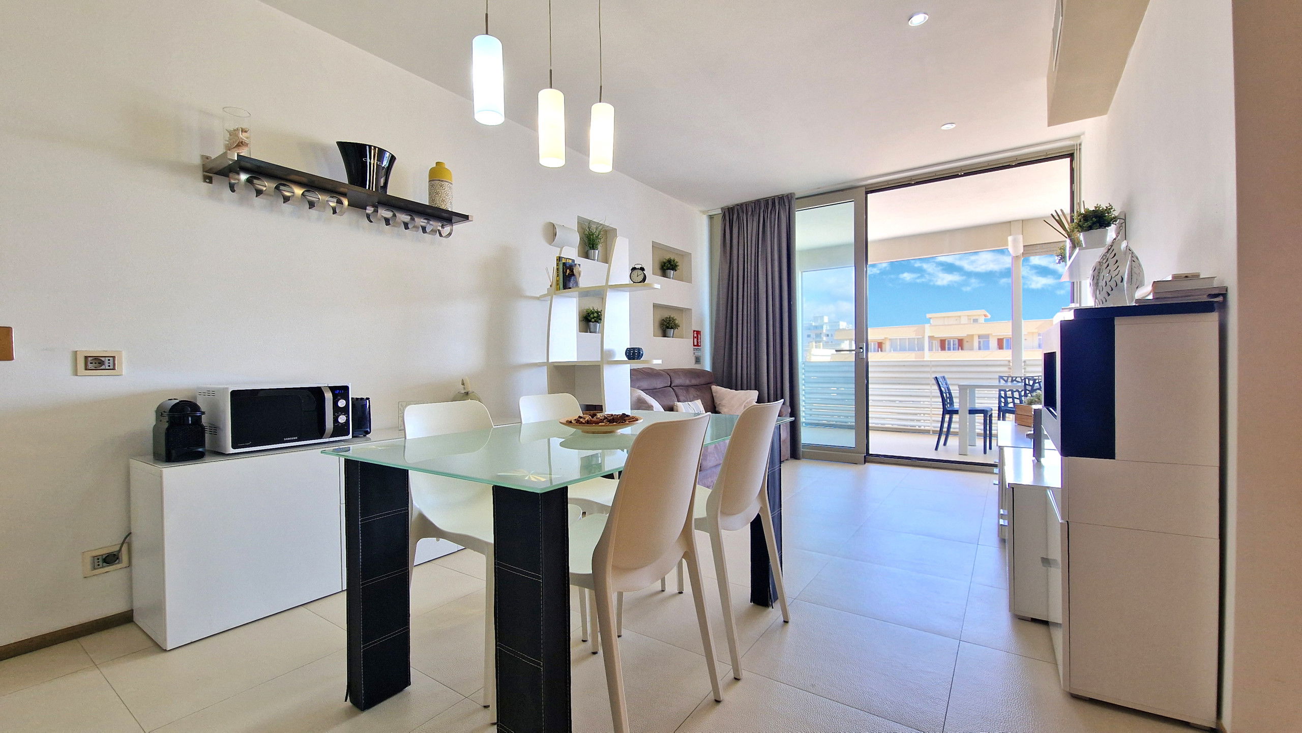 La structure dispose d'un grand salon lumineux avec une porte-fenêtre coulissante en verre, un coin cuisine escamotable avec lave-vaisselle et four, une table à manger, un très beau canapé-lit double et une télévision à écran plat, une chambre à coucher matrimoniale avec baie vitrée et une salle de bain avec douche. Les grandes baies vitrées donnent accès au balcon meublé avec des meubles de jardin et offrent une magnifique vue sur la mer.