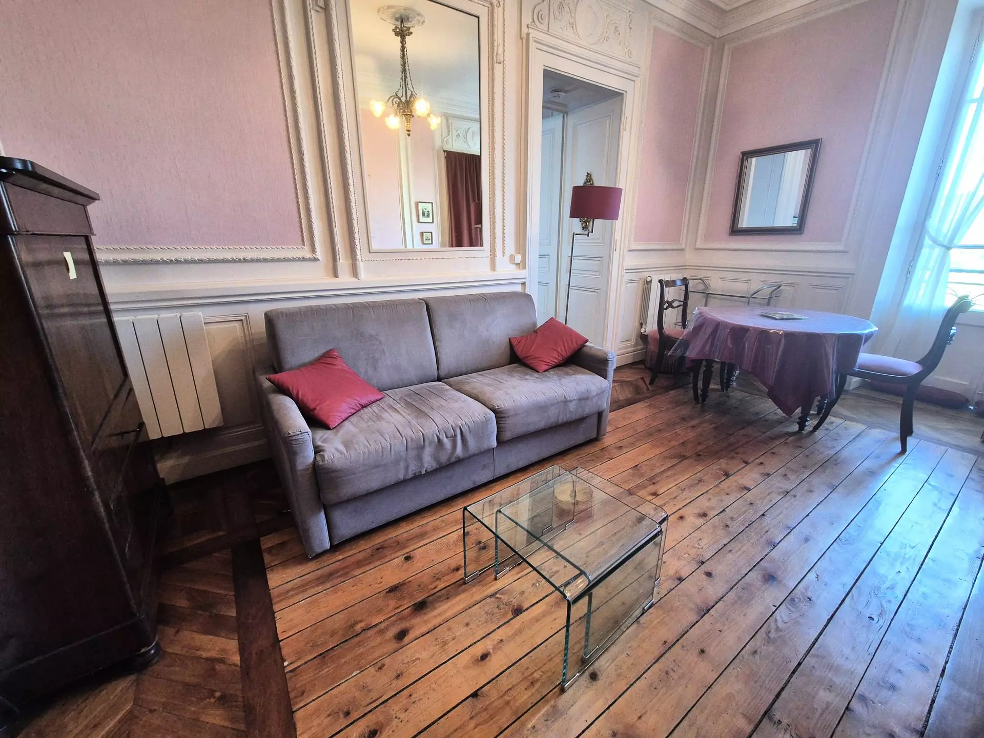 Séjour (sol parquet) balcon Ouest : 1 canapé convertible 140 "rapido", 2 fauteuils cabriolets, 1 pouf, 1 armoire, 1 table 4 chaises,1 meuble télé, 1 télévision écran plat, 1 table basse, 1 desserte, 1 meuble rangement, 1 lampe.