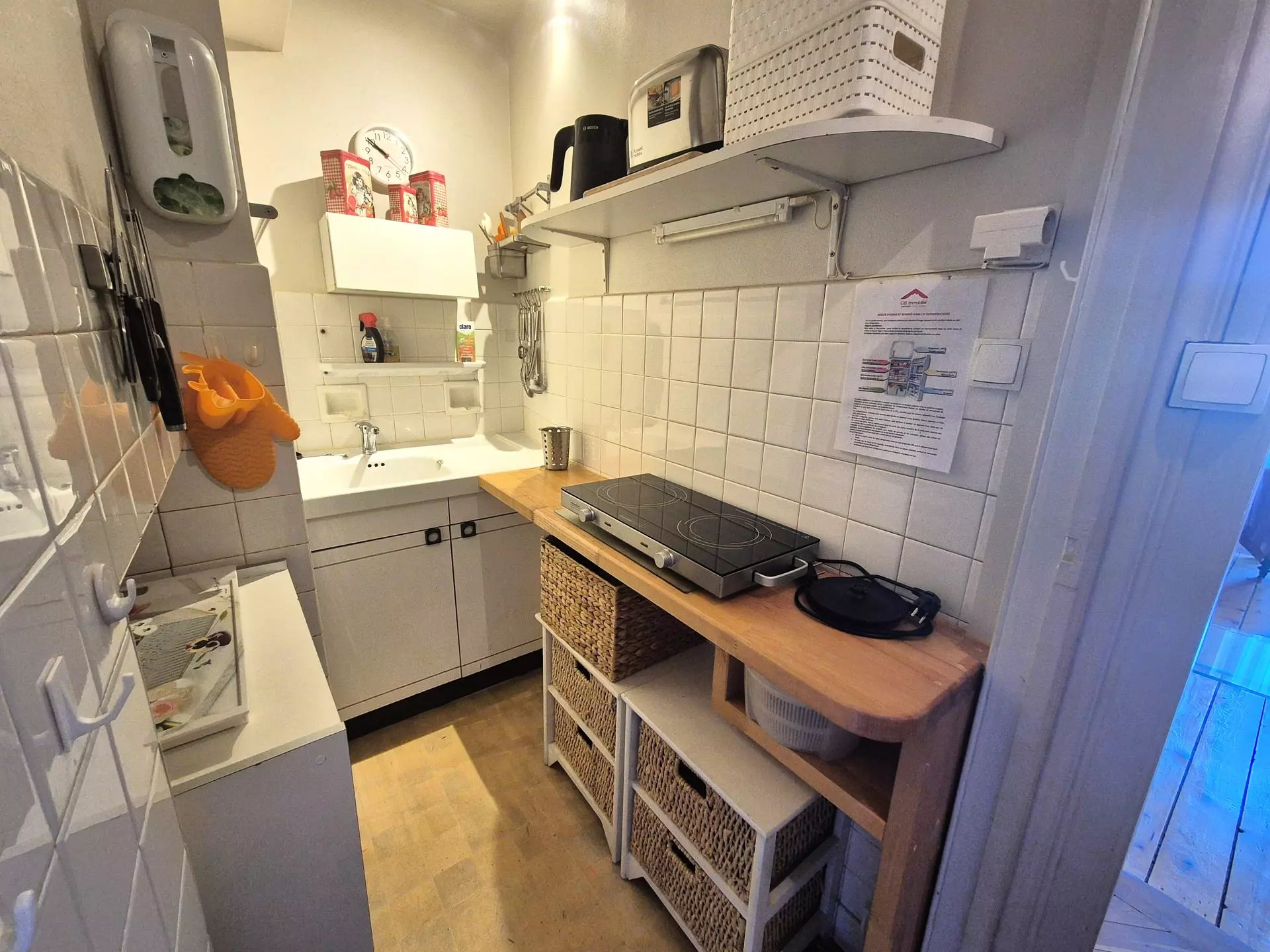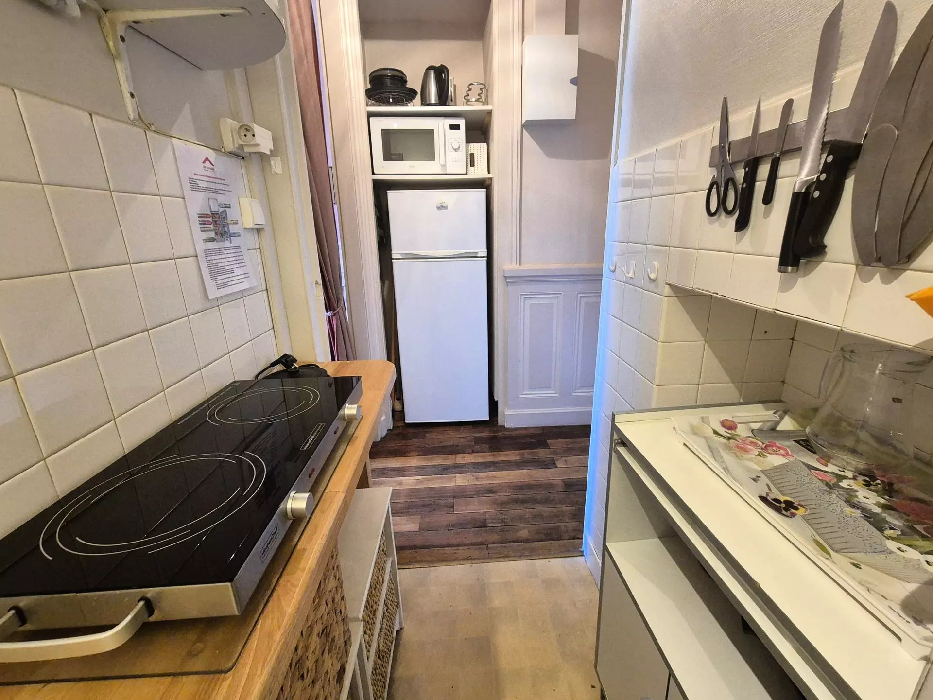 Entrée avec petit coin cuisine ( sol PVC) : 2 plaques vitro, évier, 1 meuble de rangement, 1 combi micro ondes, réfrigéateur/congélateur, 1 cafetière électrique, 1 bouilloire, 1 grille pain, vaisselle et batterie de cuisine.