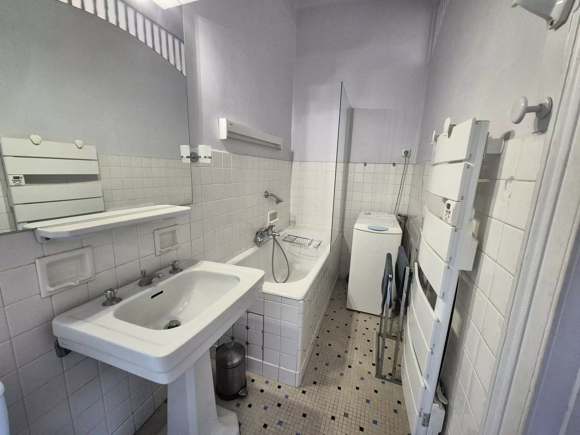 Salle de bains (sol carrelage) : baignoire, 1 meuble vasque, 1 lave linge, 1 sèche serviette électrique, W.C.