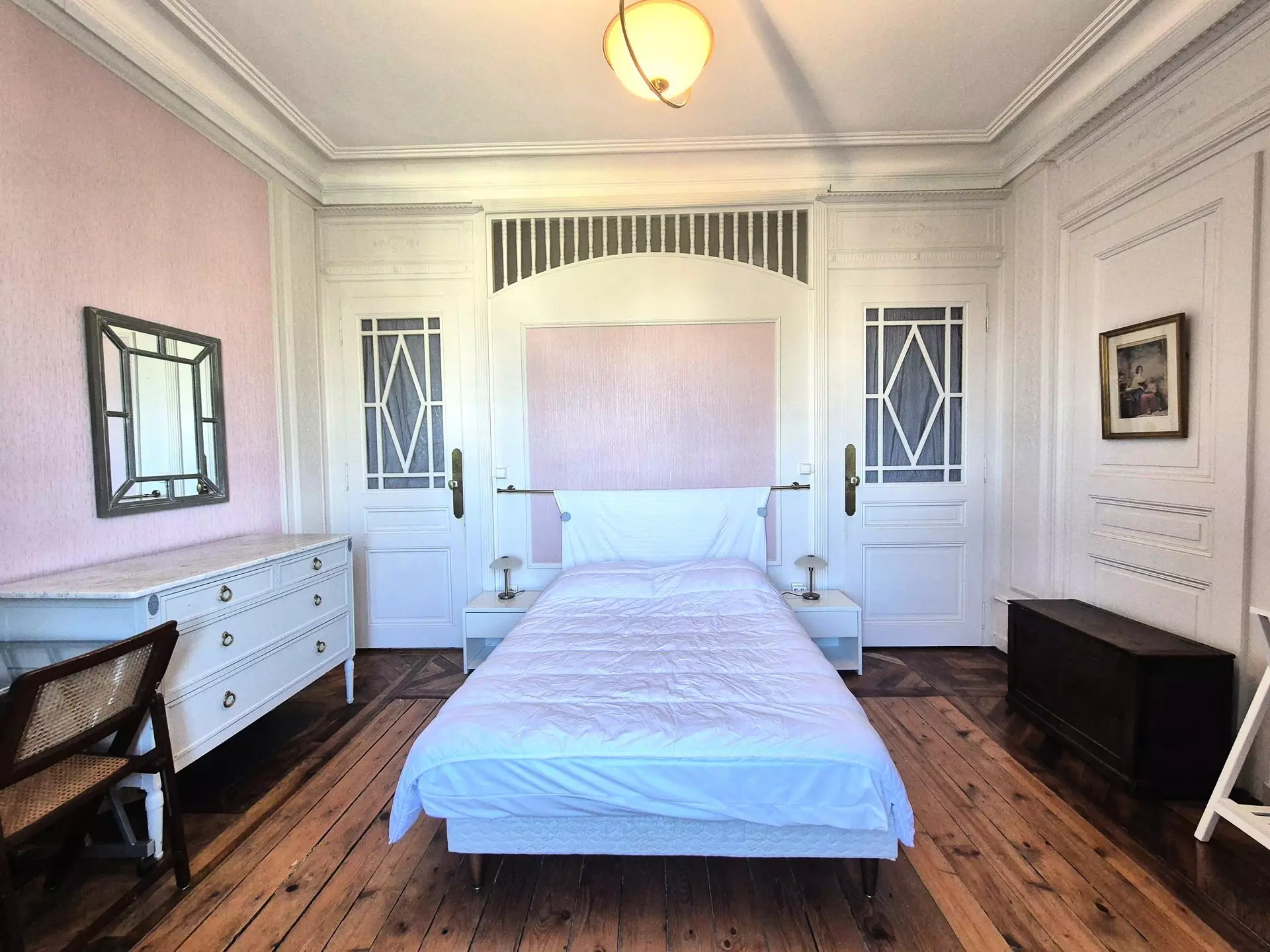 Chambre (sol parquet) : 1 lit 140 cm, 2 chevets, 1 commode, 1 armoire, 1 fauteuil, 1 coffre, 1 valet , 1 petit bureau