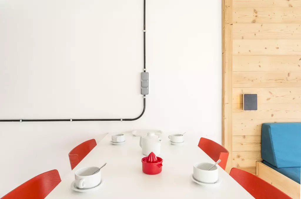 Coin cuisine comprenant : 2 plaques vitrocéramique, micro-ondes , réfrigérateur/freezer, lave vaisselle, bouilloire, cafetière électrique à filtre, et grille pain.